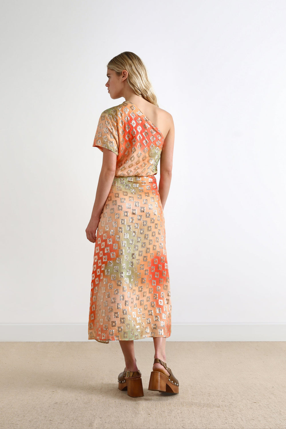 Vestido midi assimétrico com padrão com pormenores metalizados.