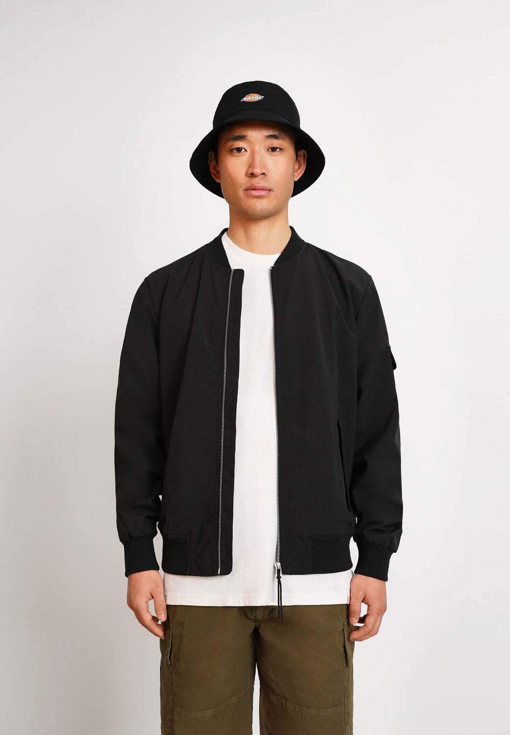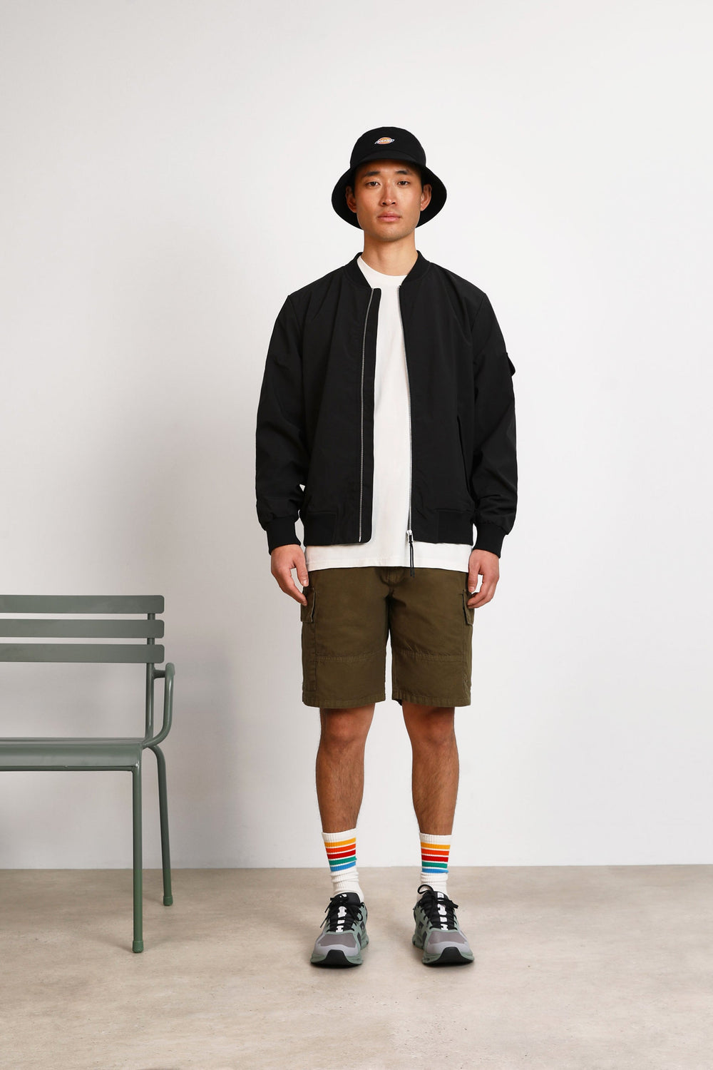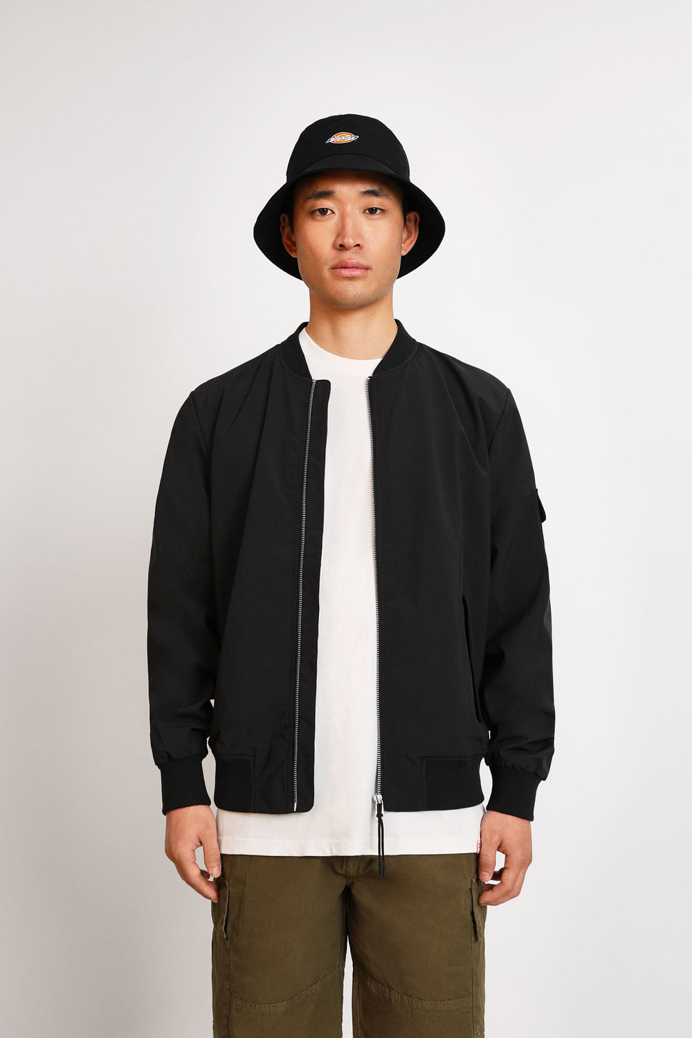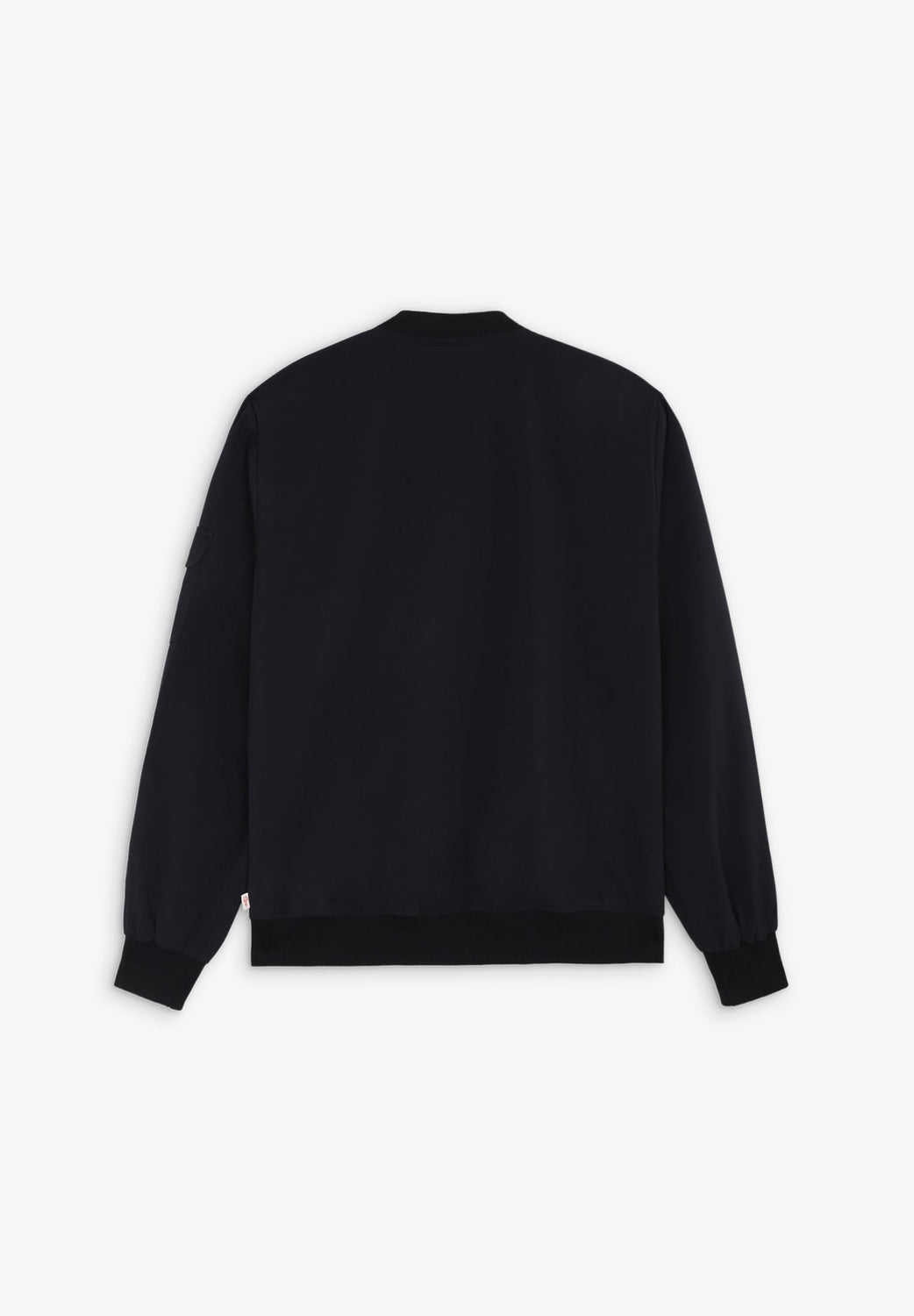 Casaco bomber confecionado em tecido de mistura de poliéster reciclado e elastano.