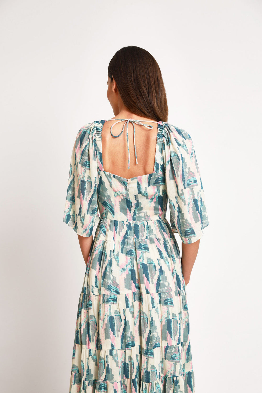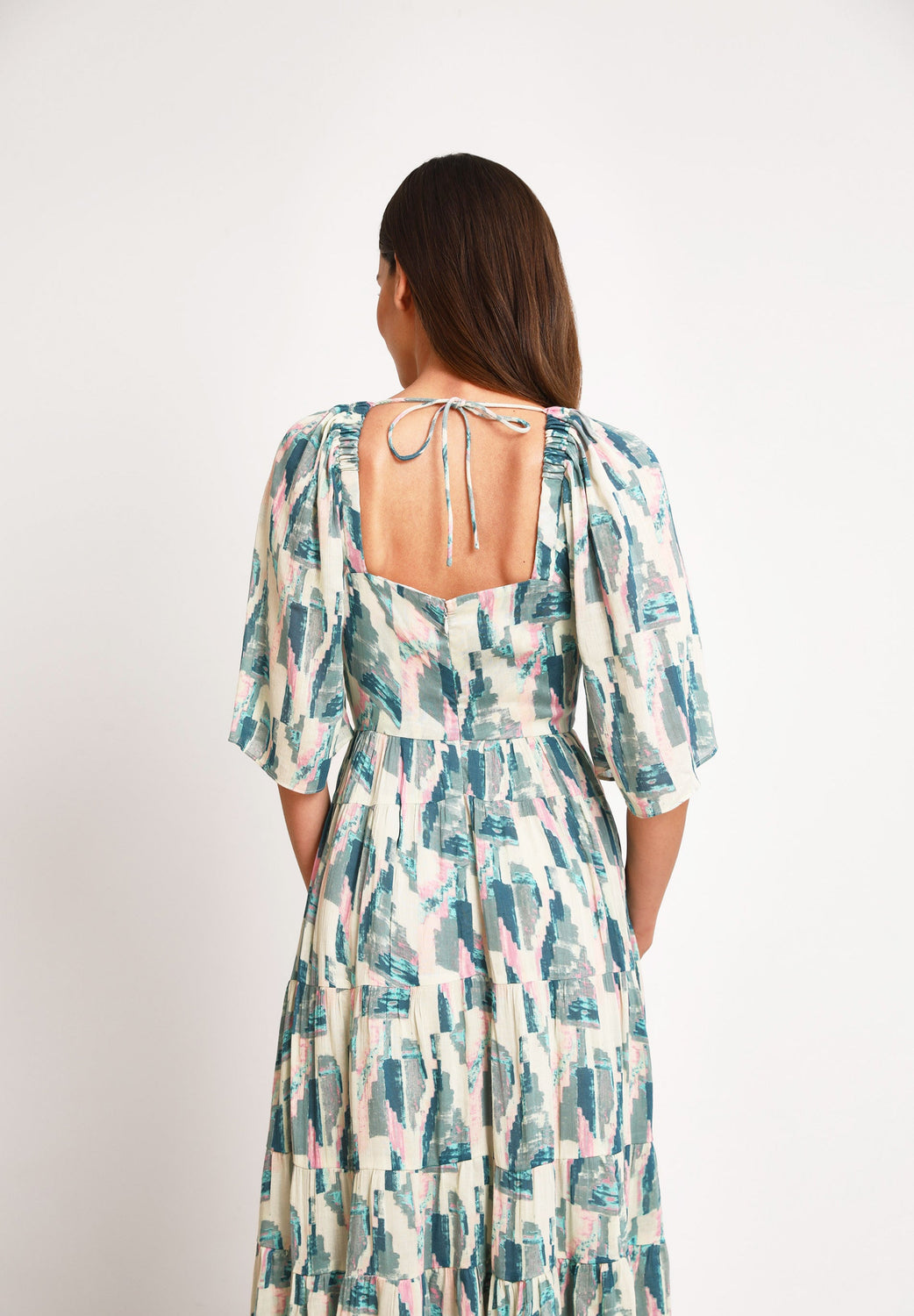 - Fecho de correr nas costas e detalhe de laço.