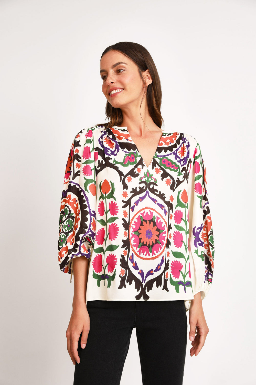 - Franzido nos ombros e punhos, dando lugar a volume de balão.