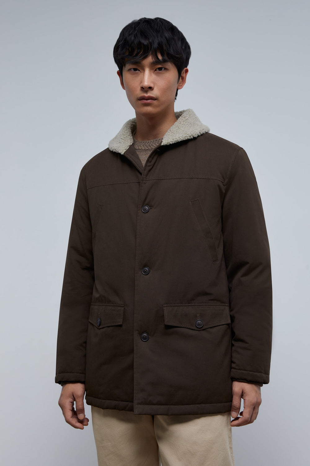 - Bolso no peito com fecho de botão de pressão