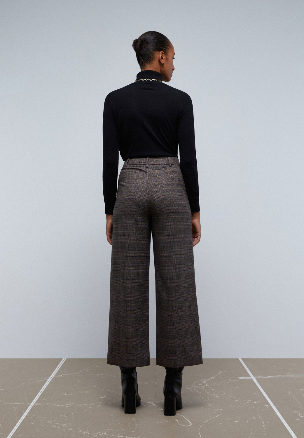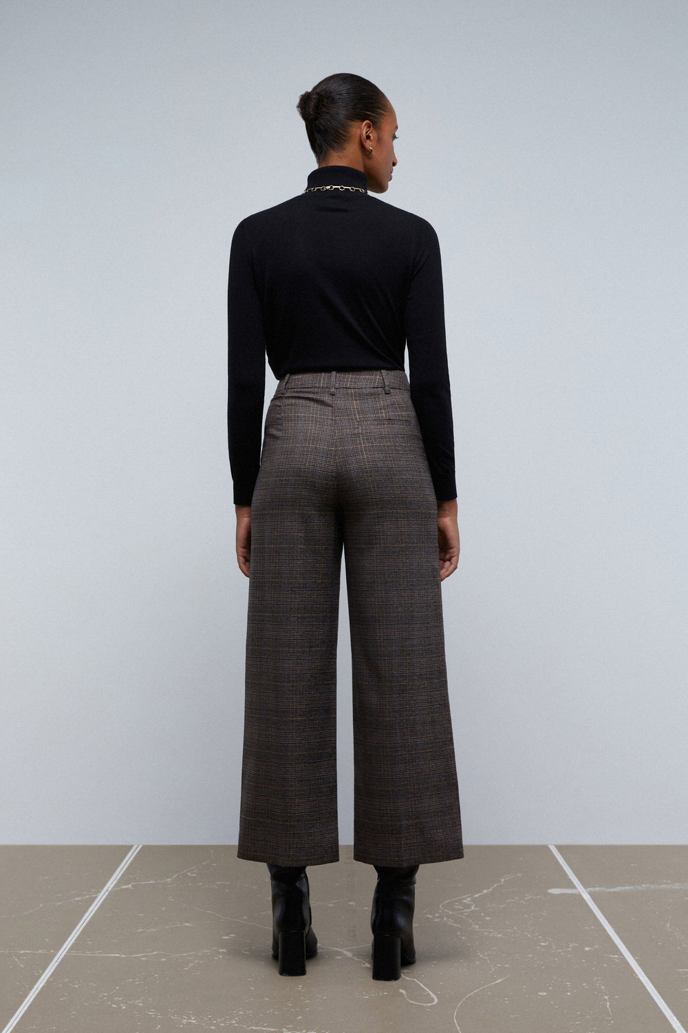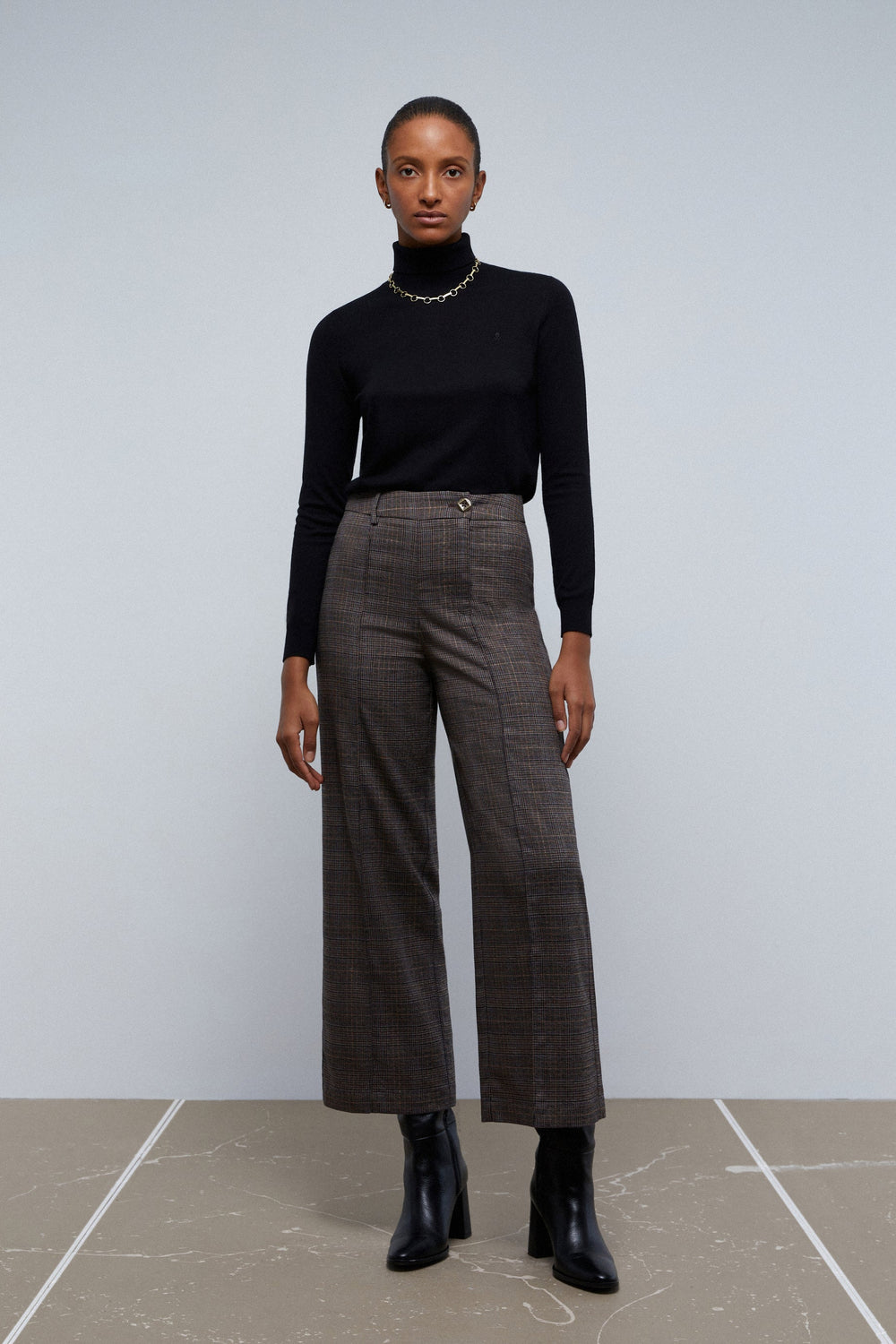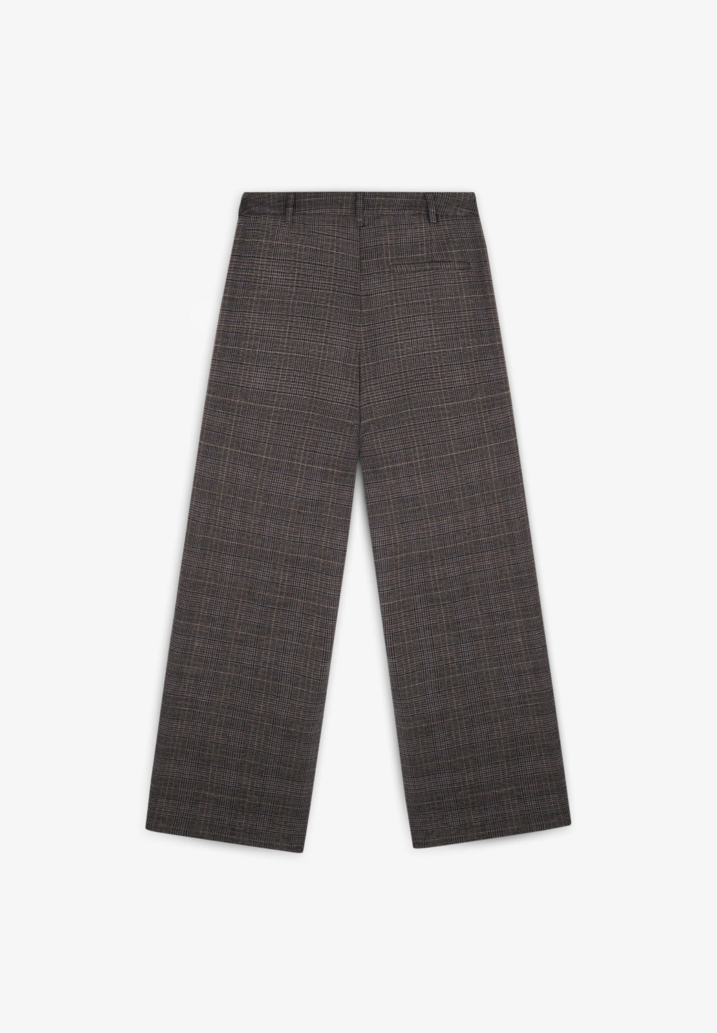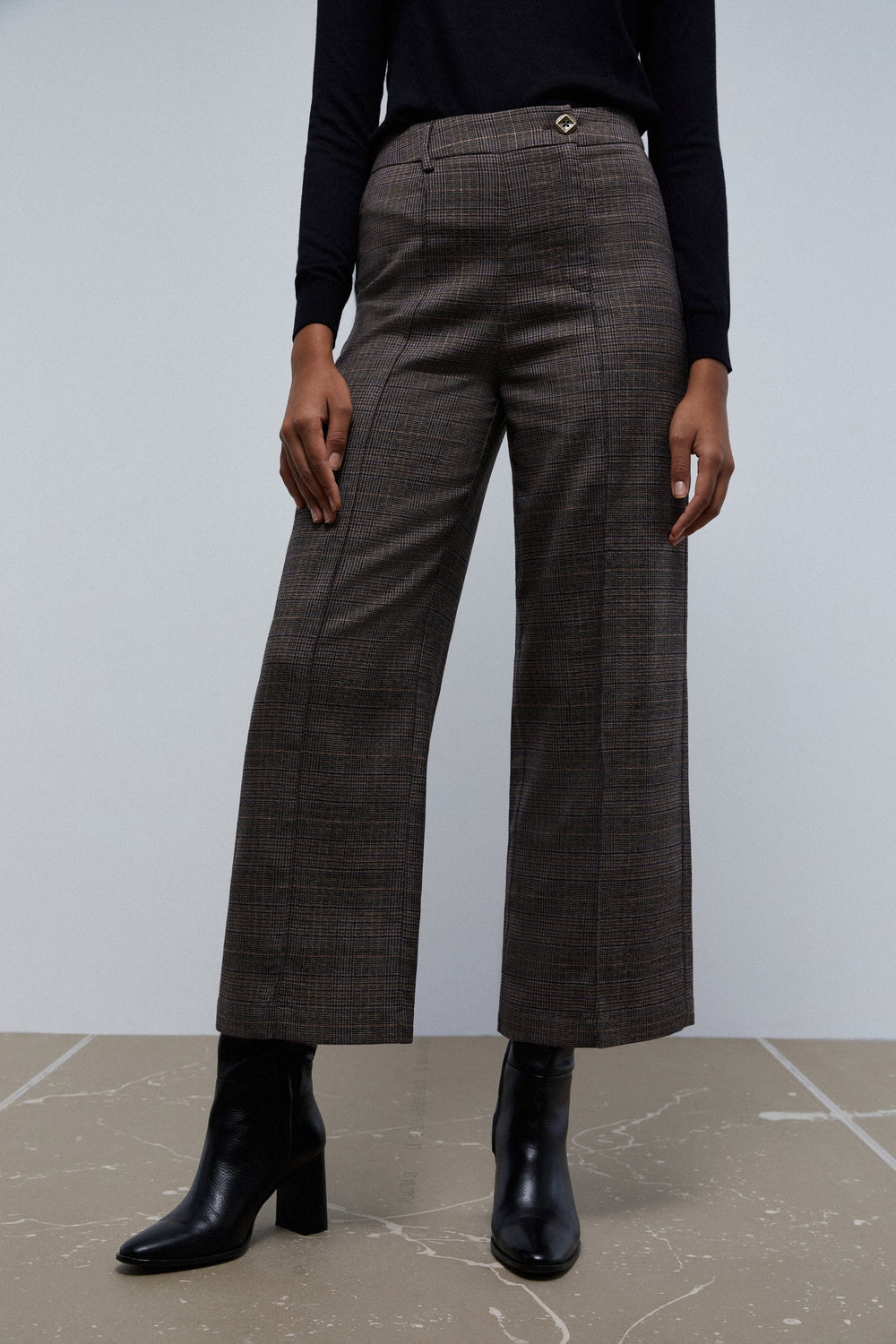 Calças de xadrez com pinças e pormenor de perna cruzada