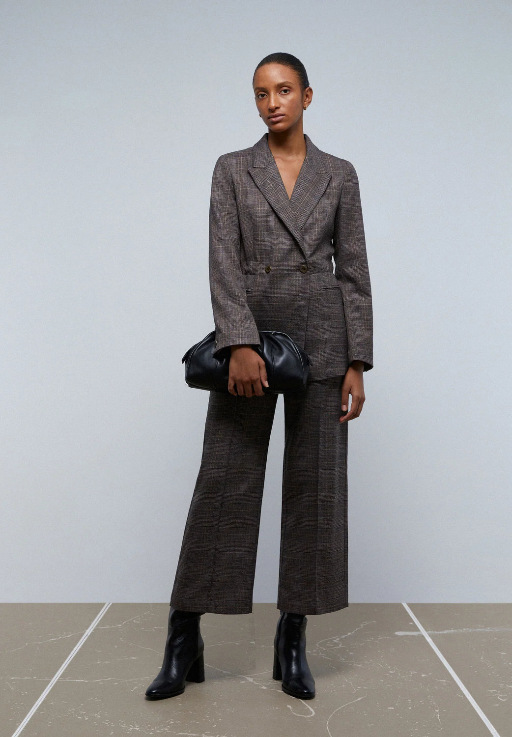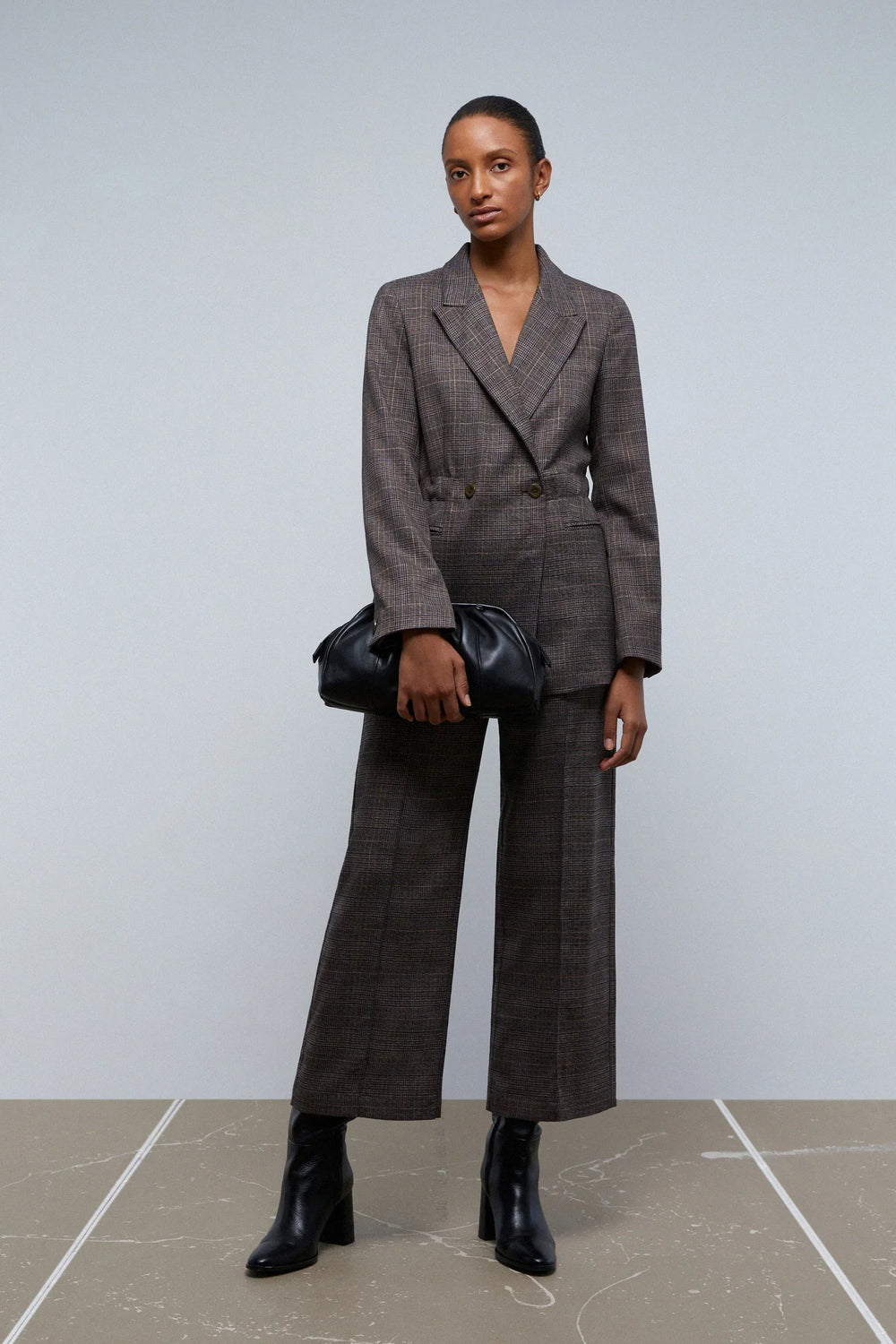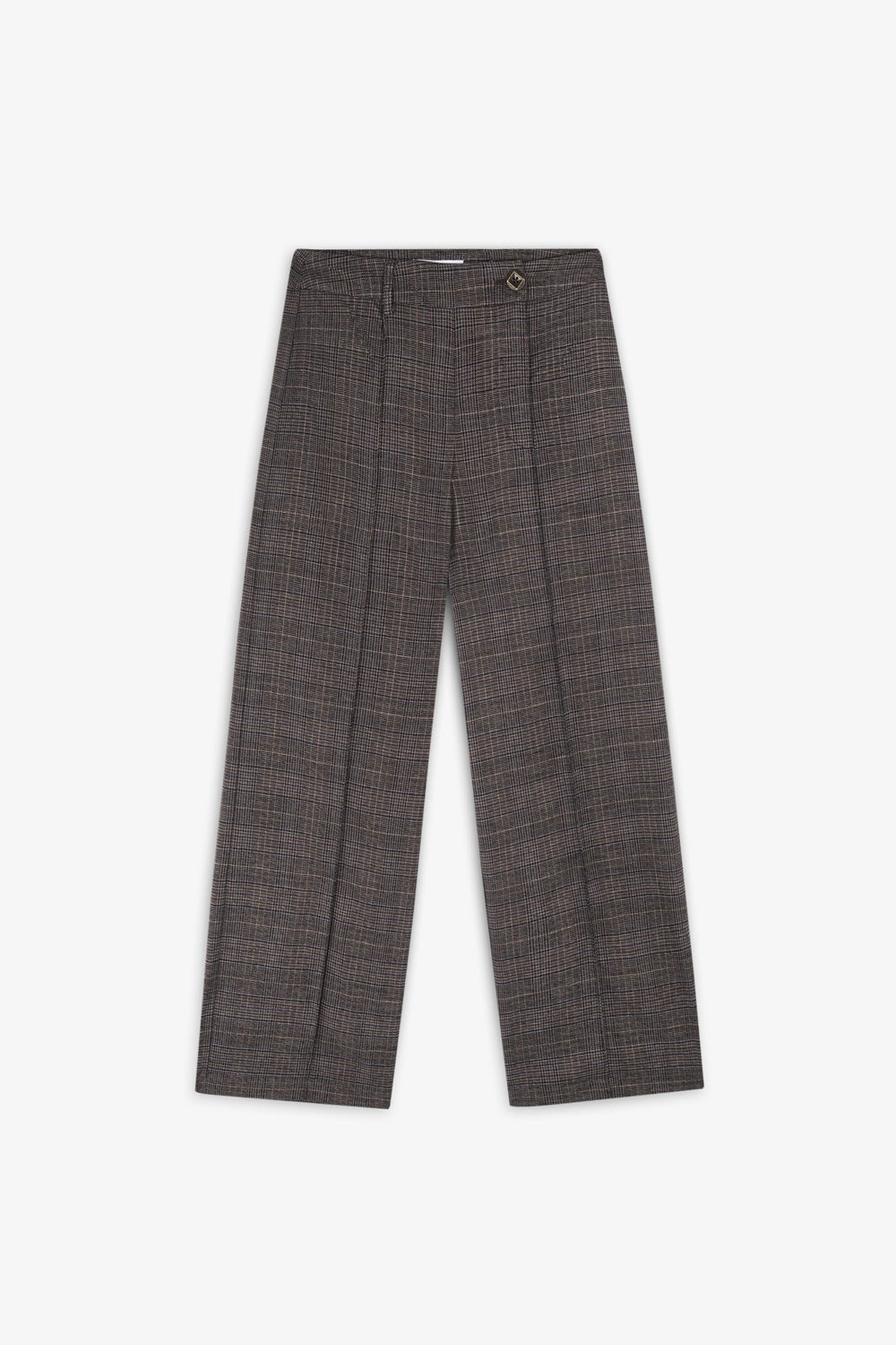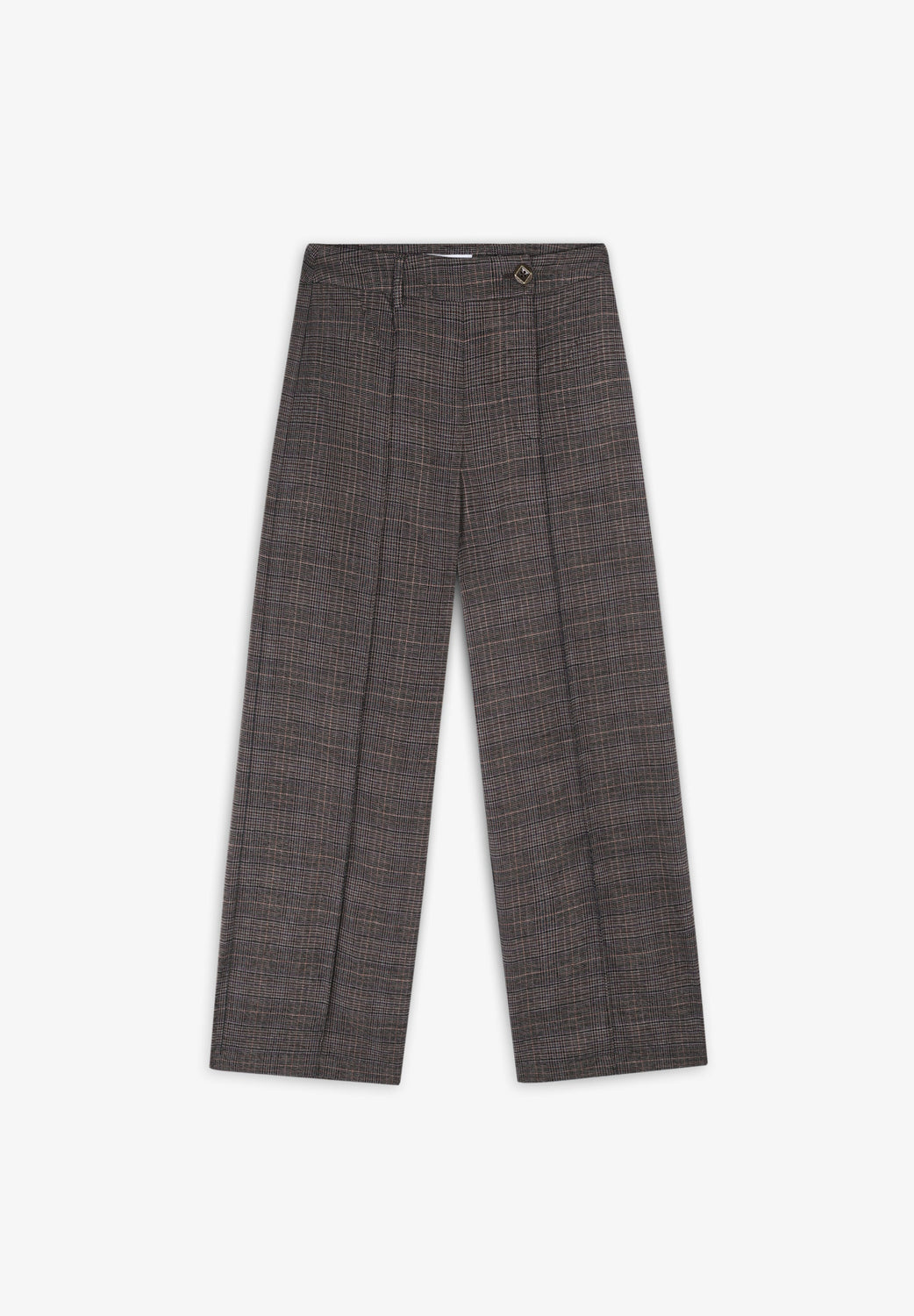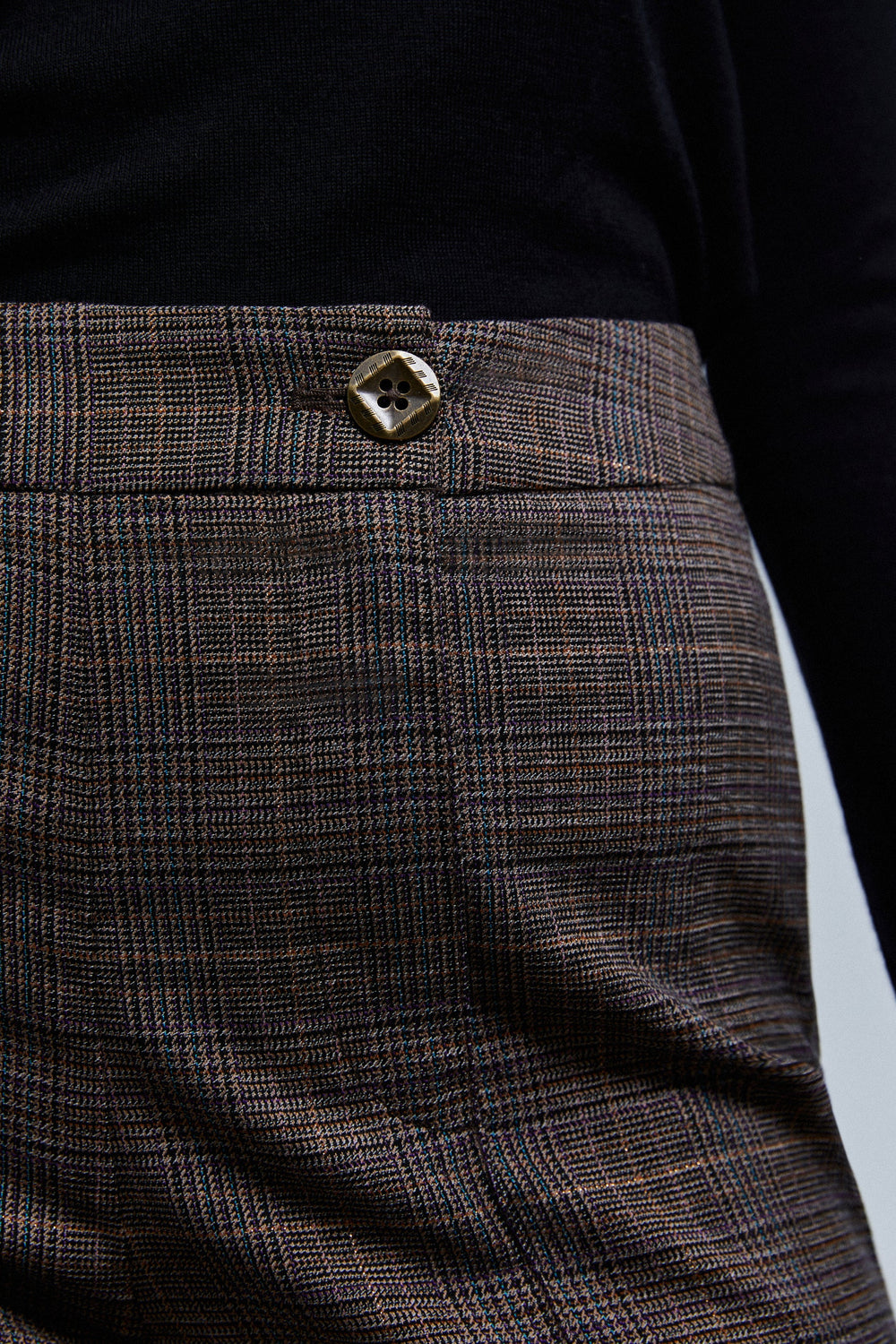 Calças de xadrez com pinças e pormenor de perna cruzada