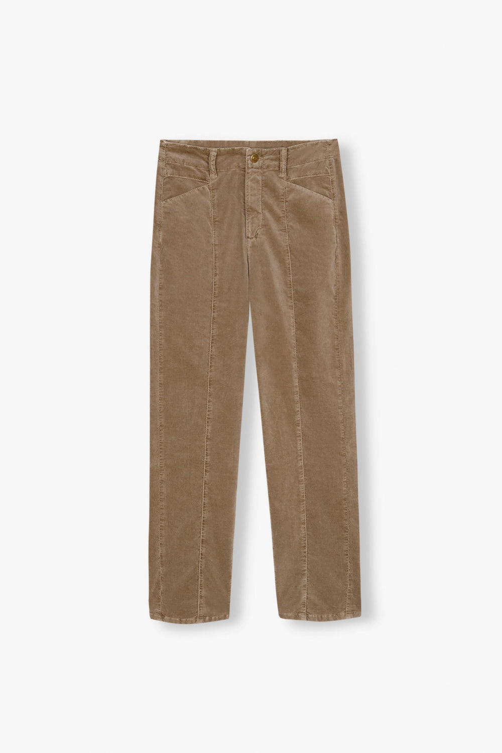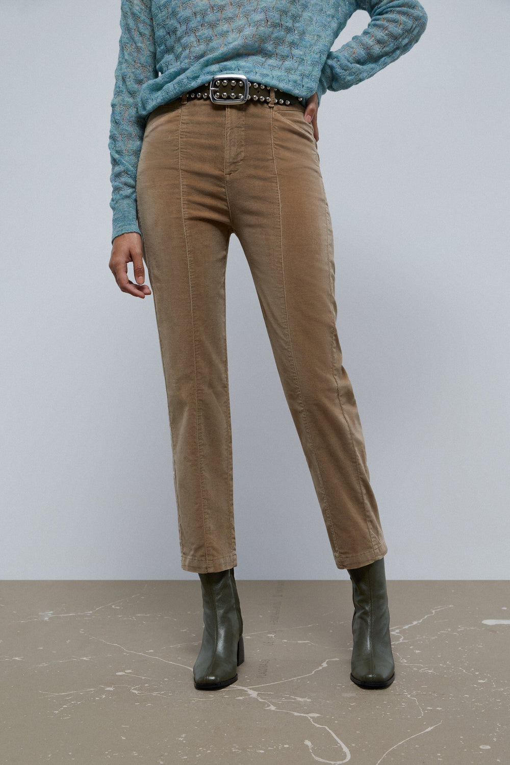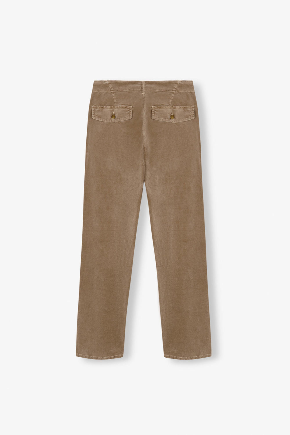 - Bolsos à frente direitos e bolsos atrás com placket e botão