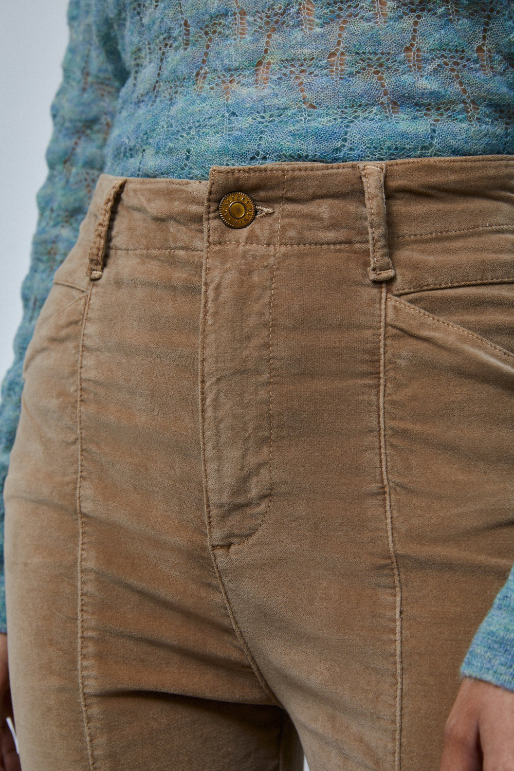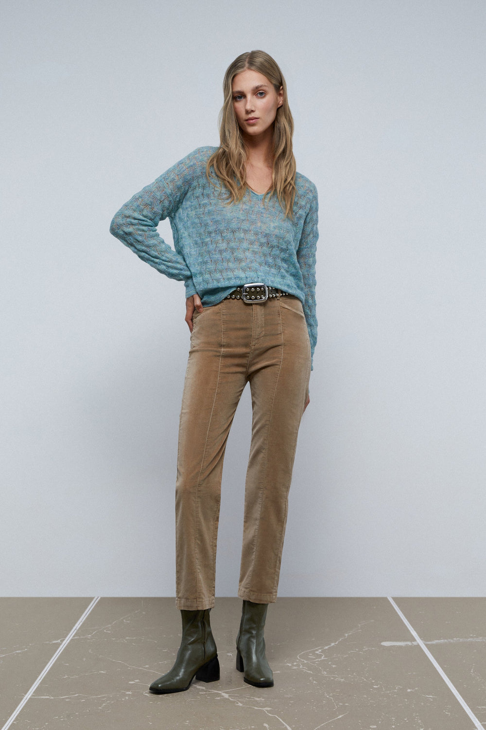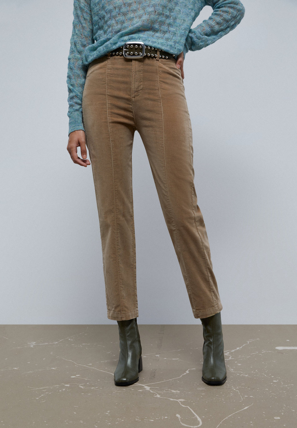 - Bolsos à frente direitos e bolsos atrás com placket e botão