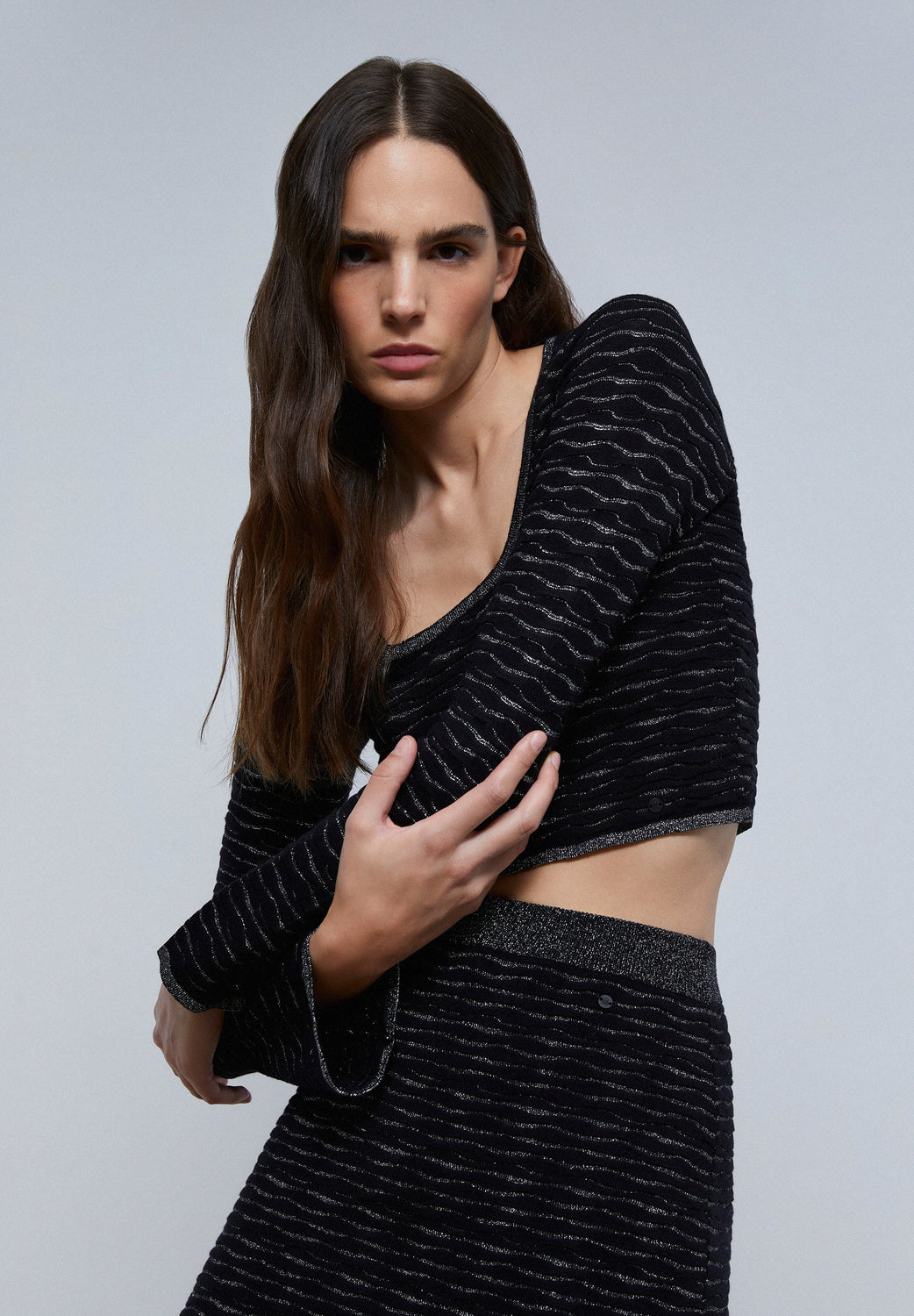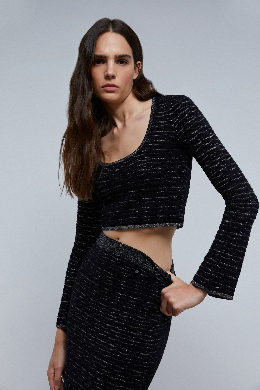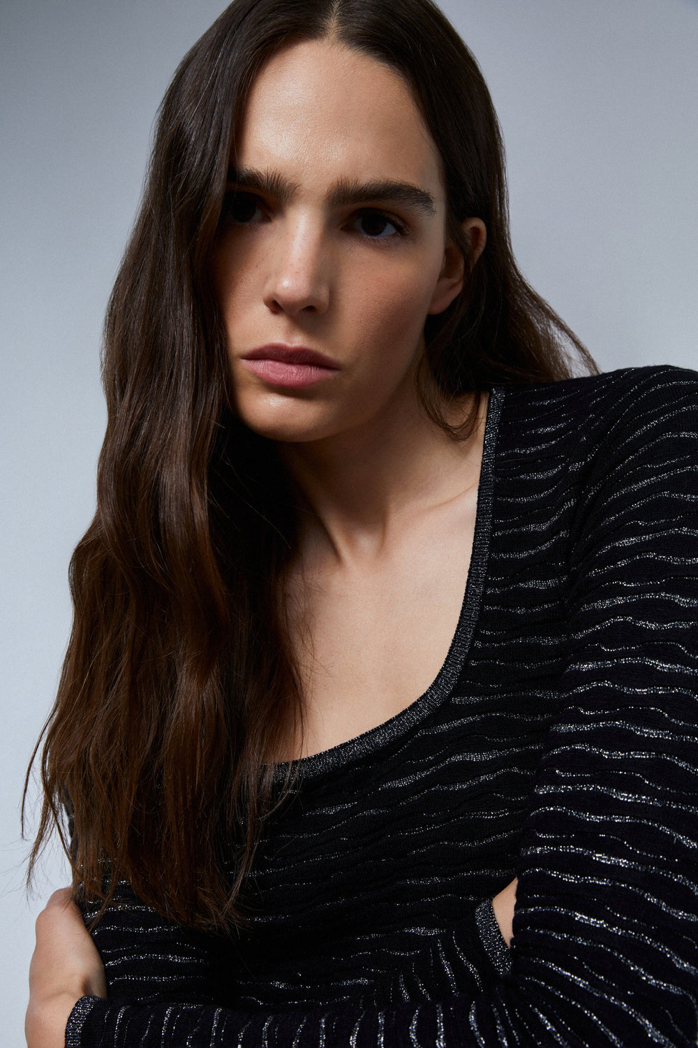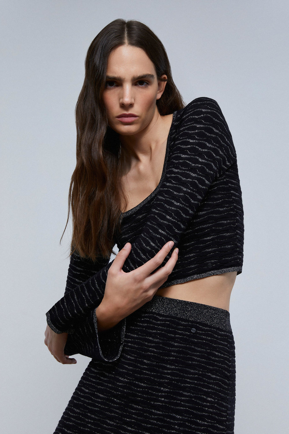 TOP DE MALHA COM FIO METALIZADO E PORMENOR ATRÁS