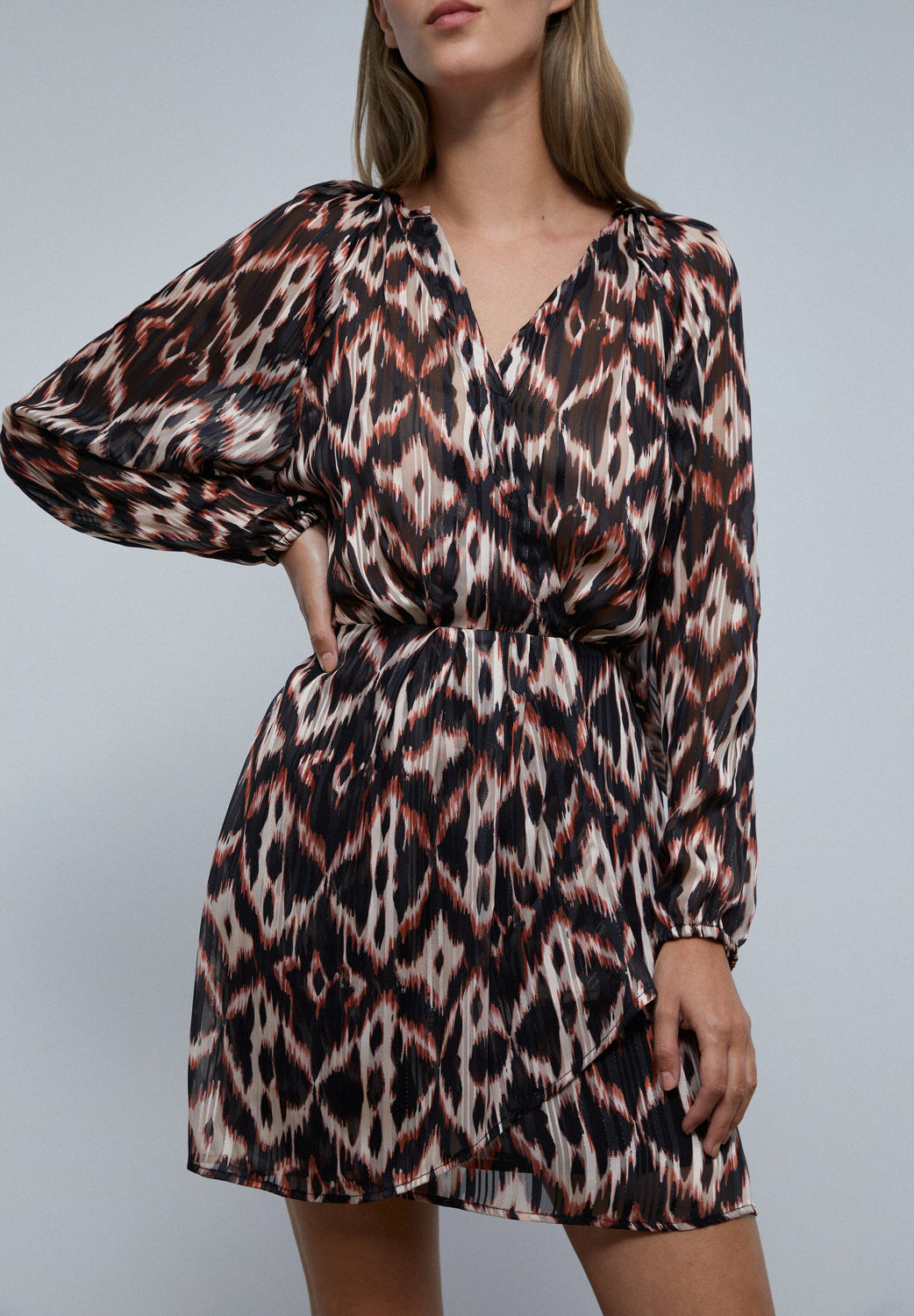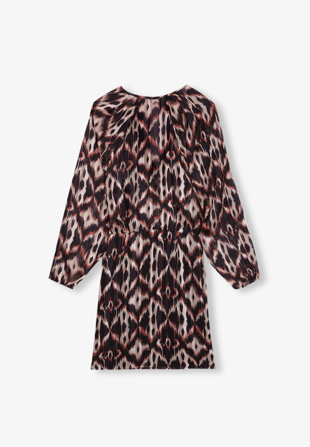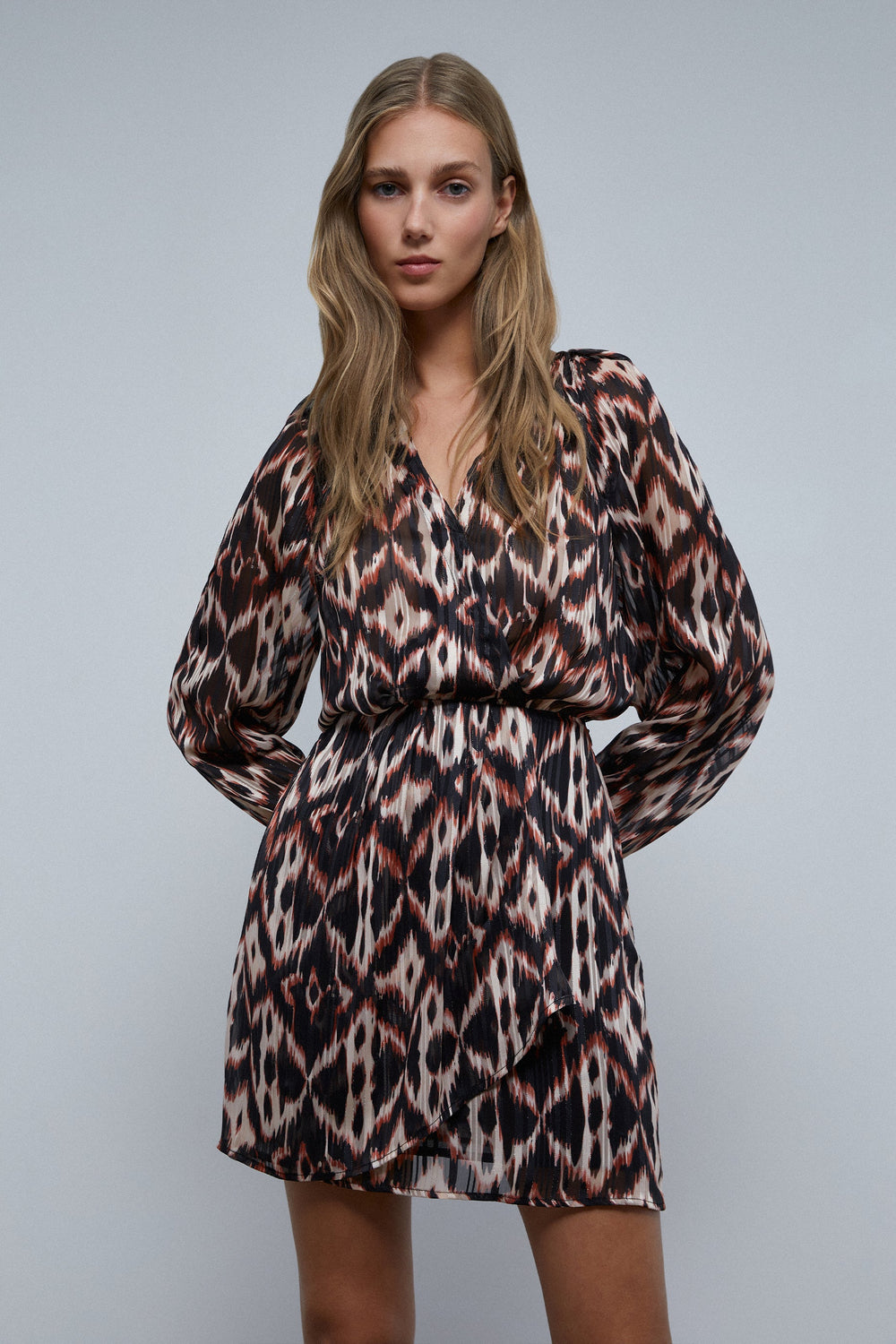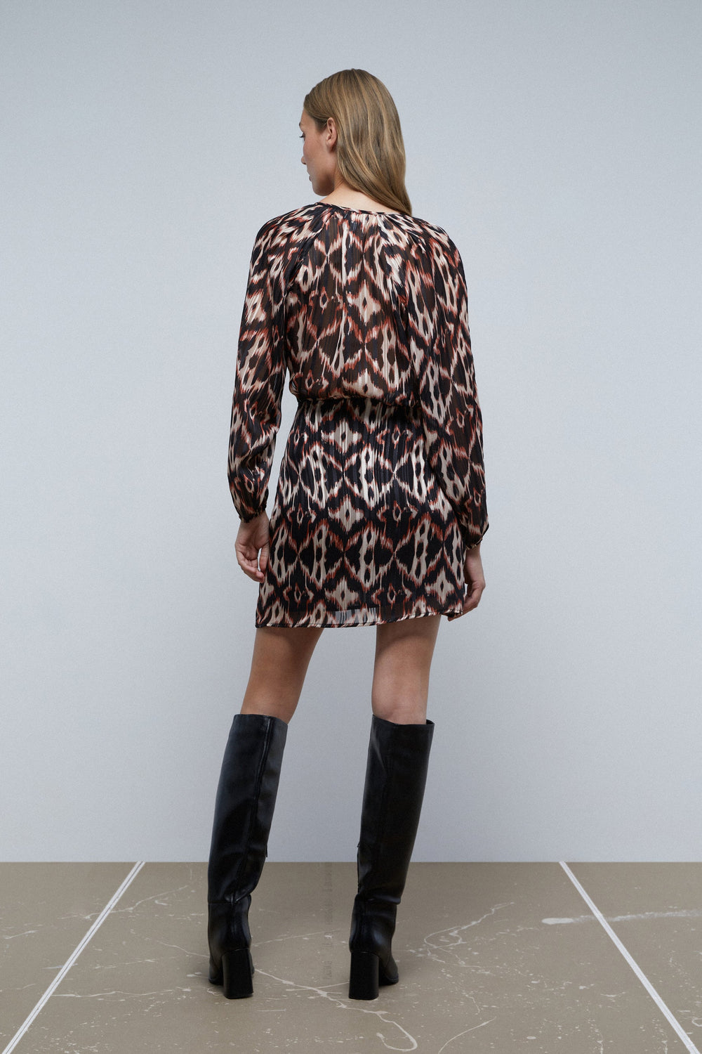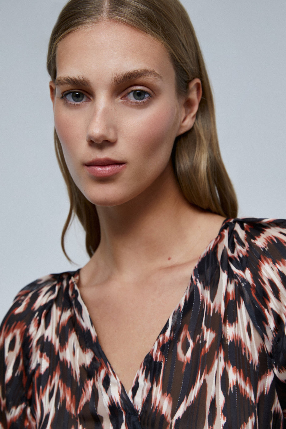 - Confecionado em tecido fluido com pormenores de fio metalizado