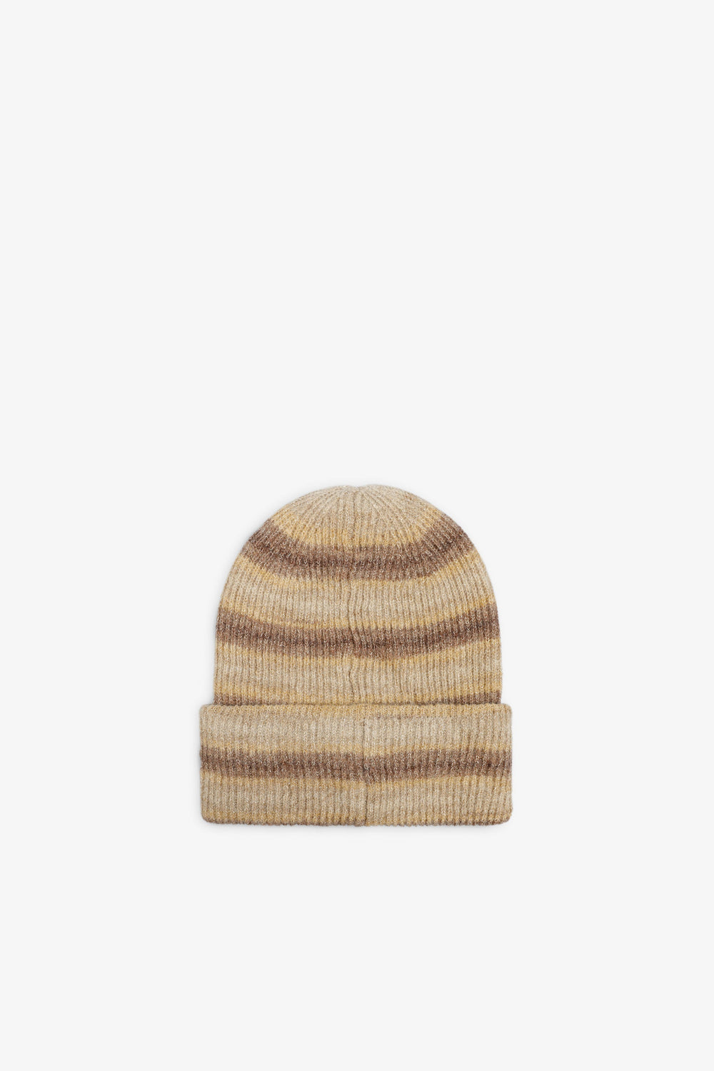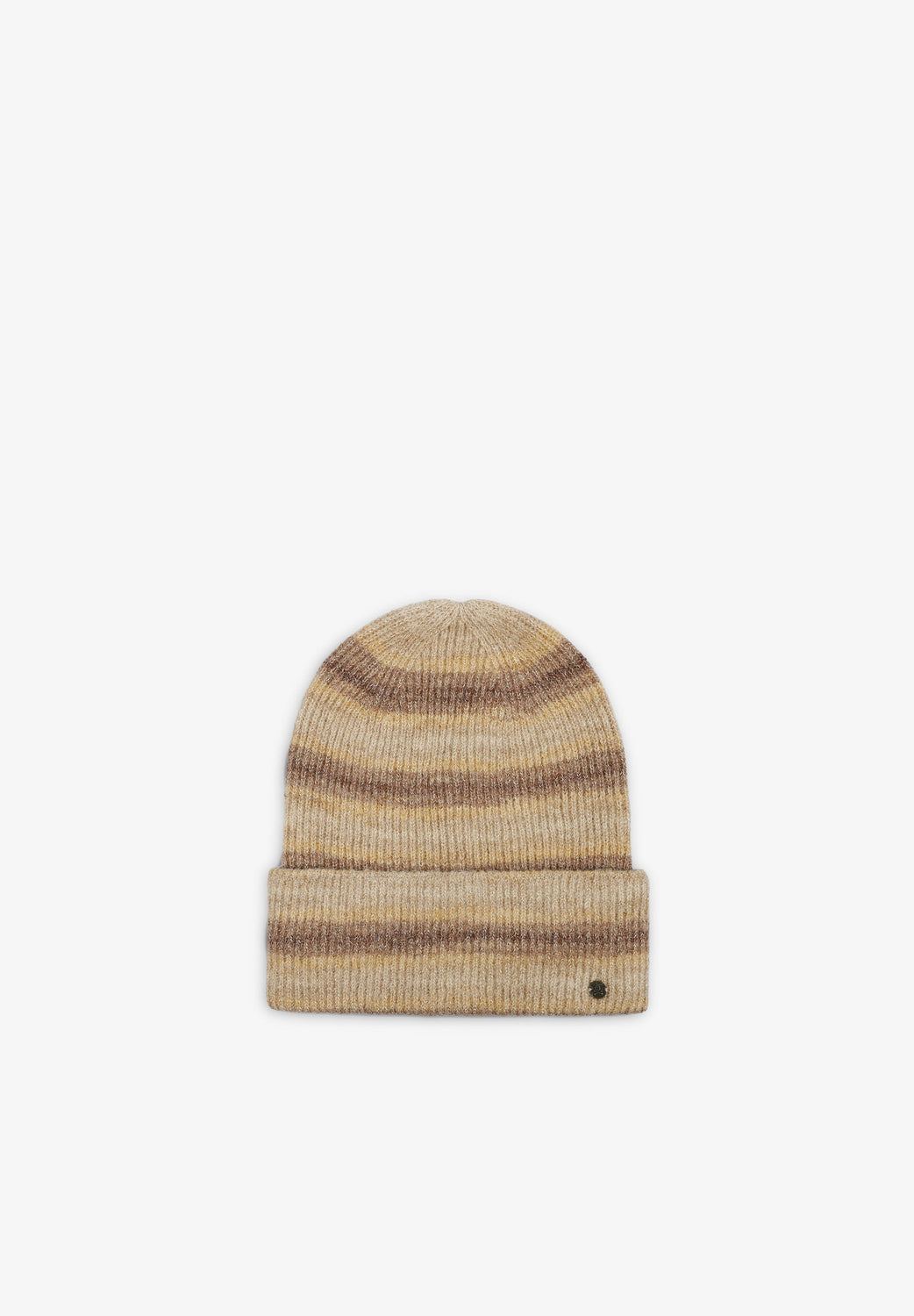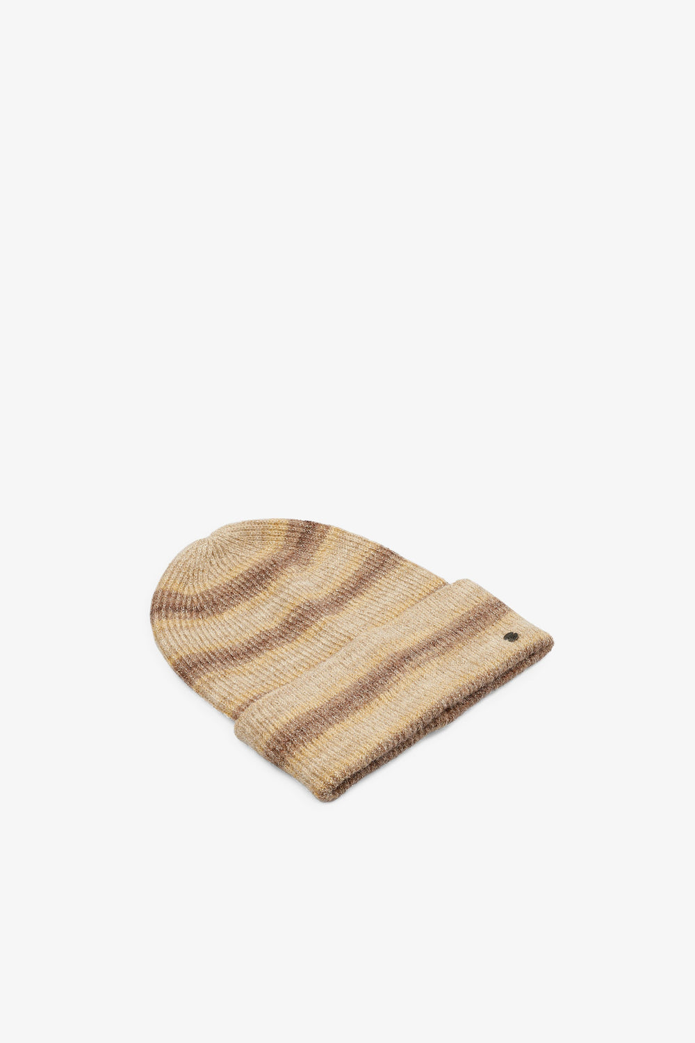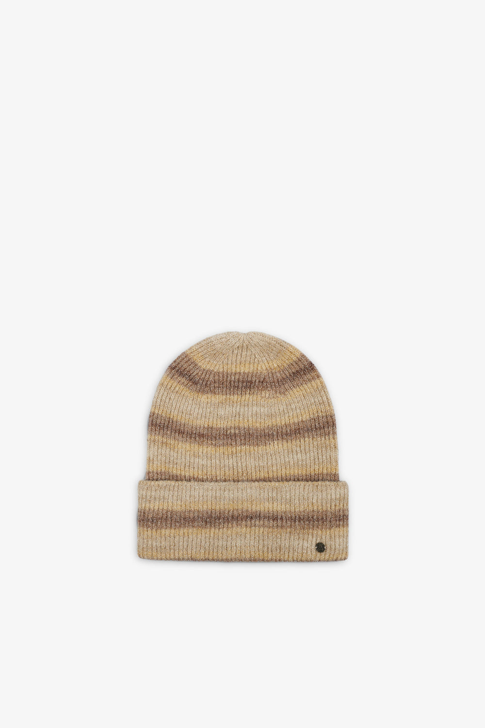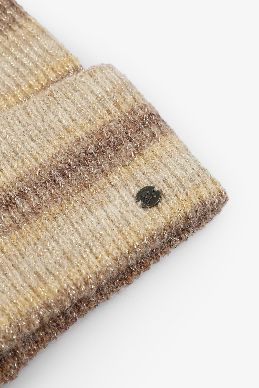 Gorro de malha às riscas com pormenores em fiação metalizada.