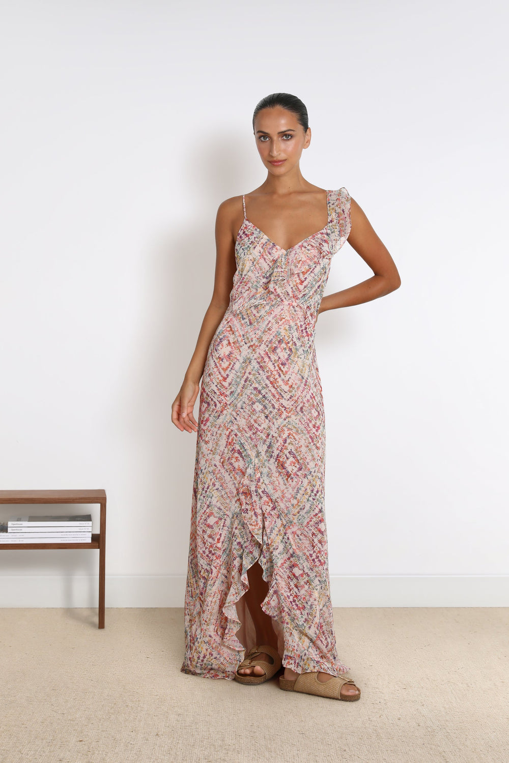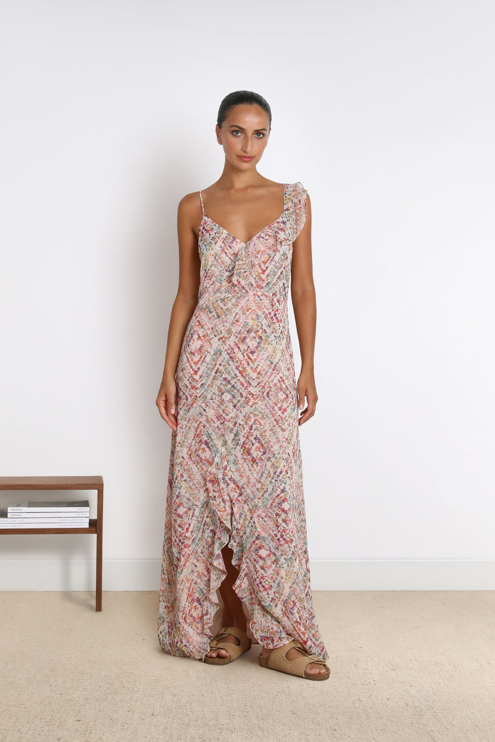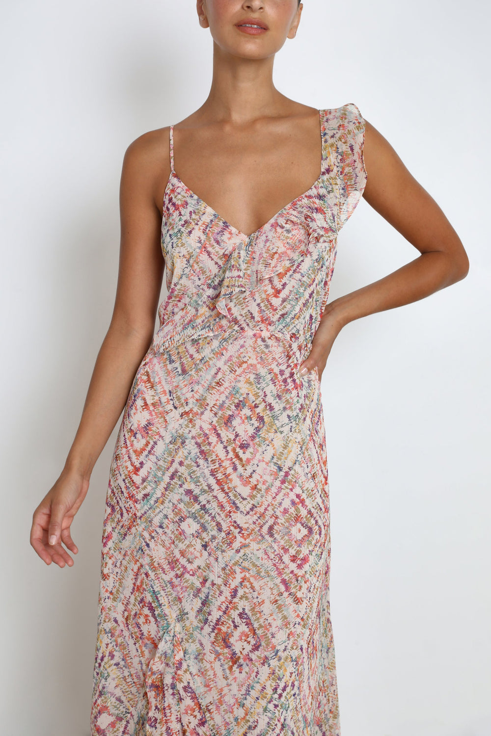 - Alças finas com pormenor de folho