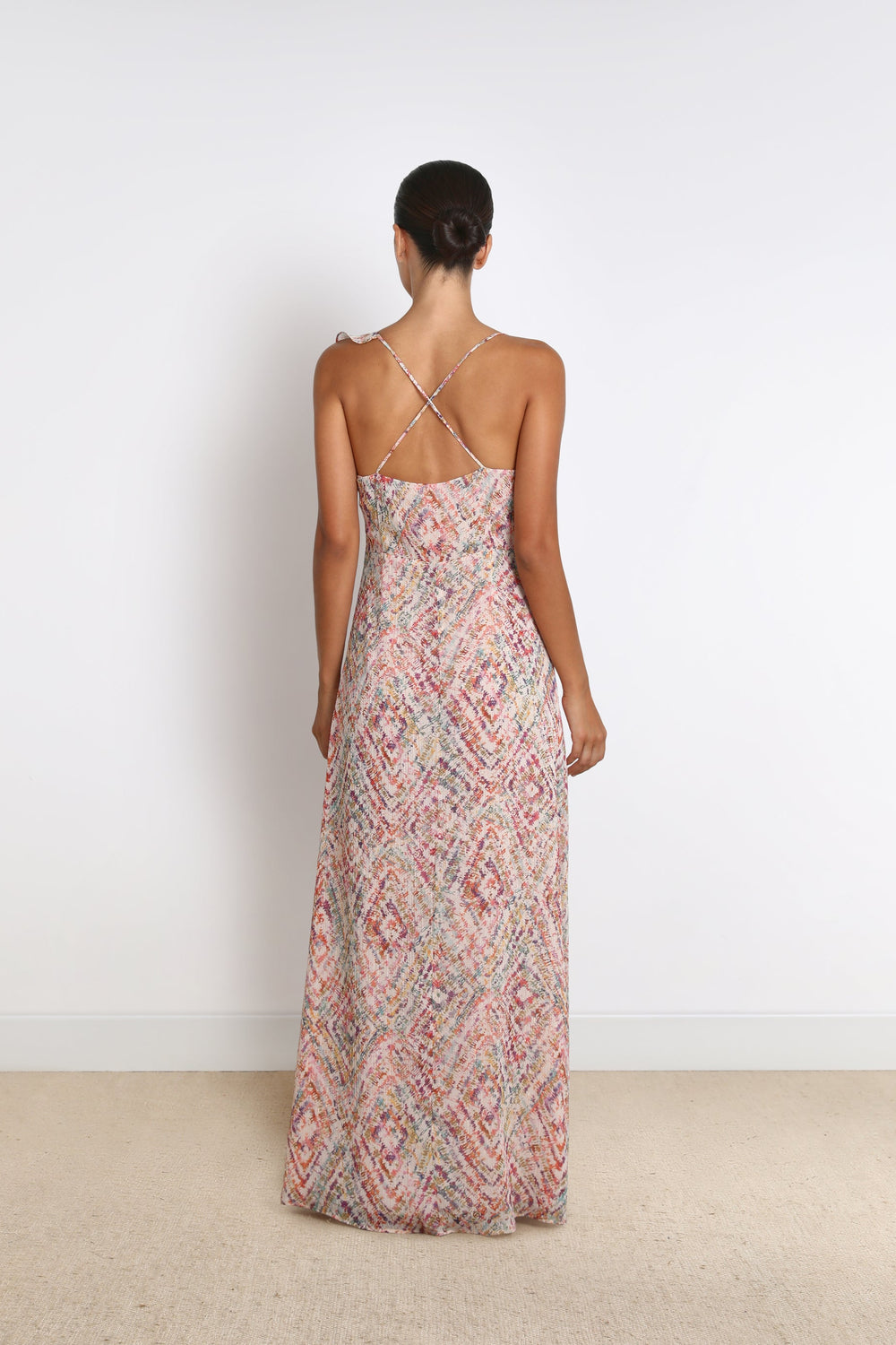 Vestido comprido com padrão.