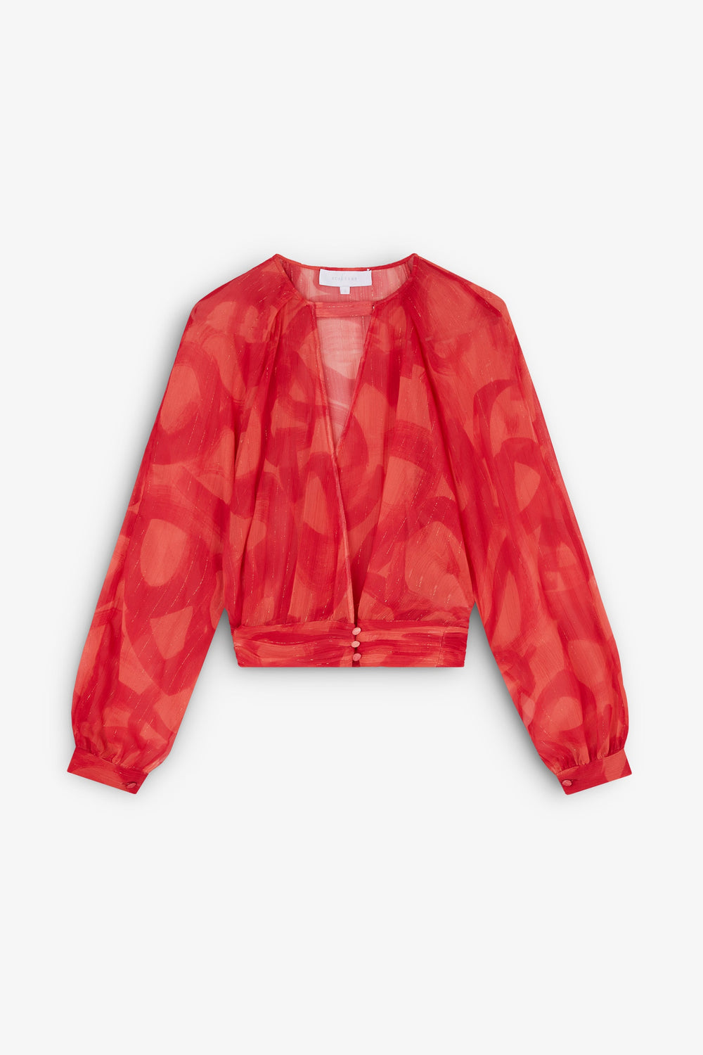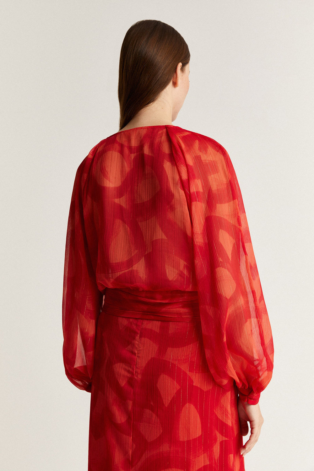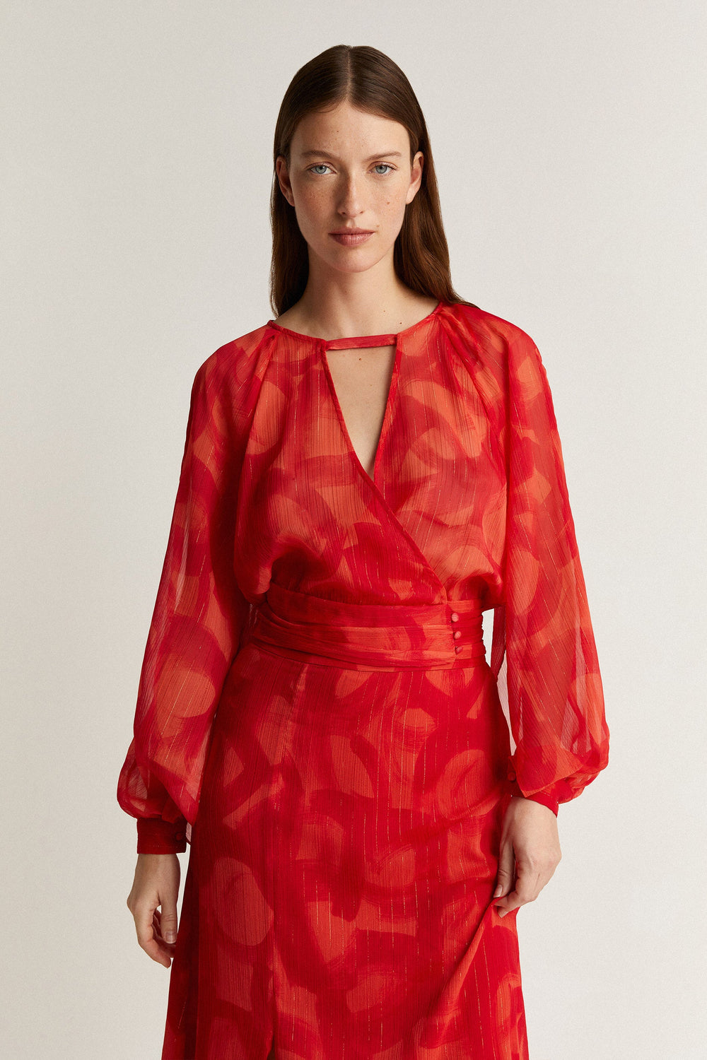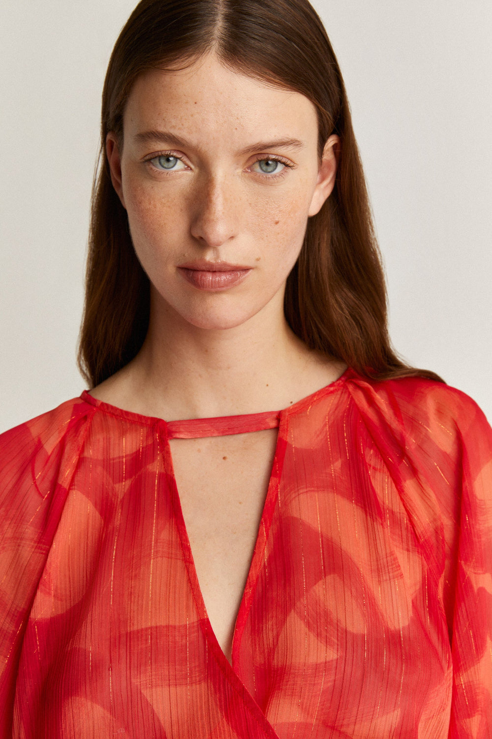 - Confeção em tecido fluido com pormenor de fiação metalizada