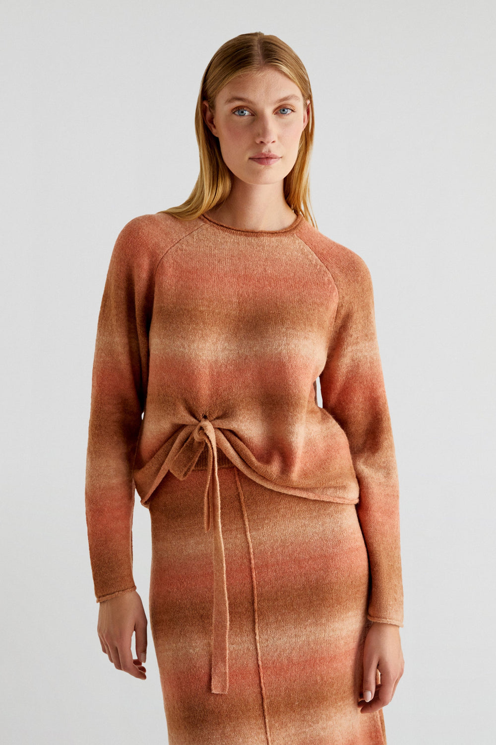 Sweater tie-dye confecionada em mistura de lã. Regular fit, decote redondo e manga comprida. Pormenor de nó com laço à frente.