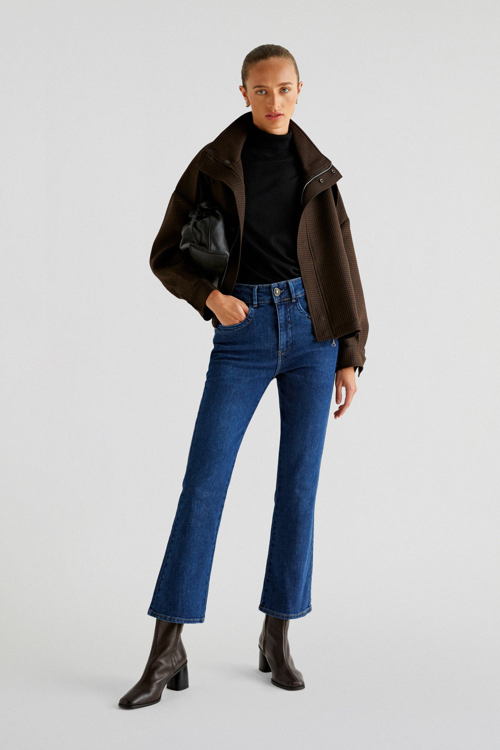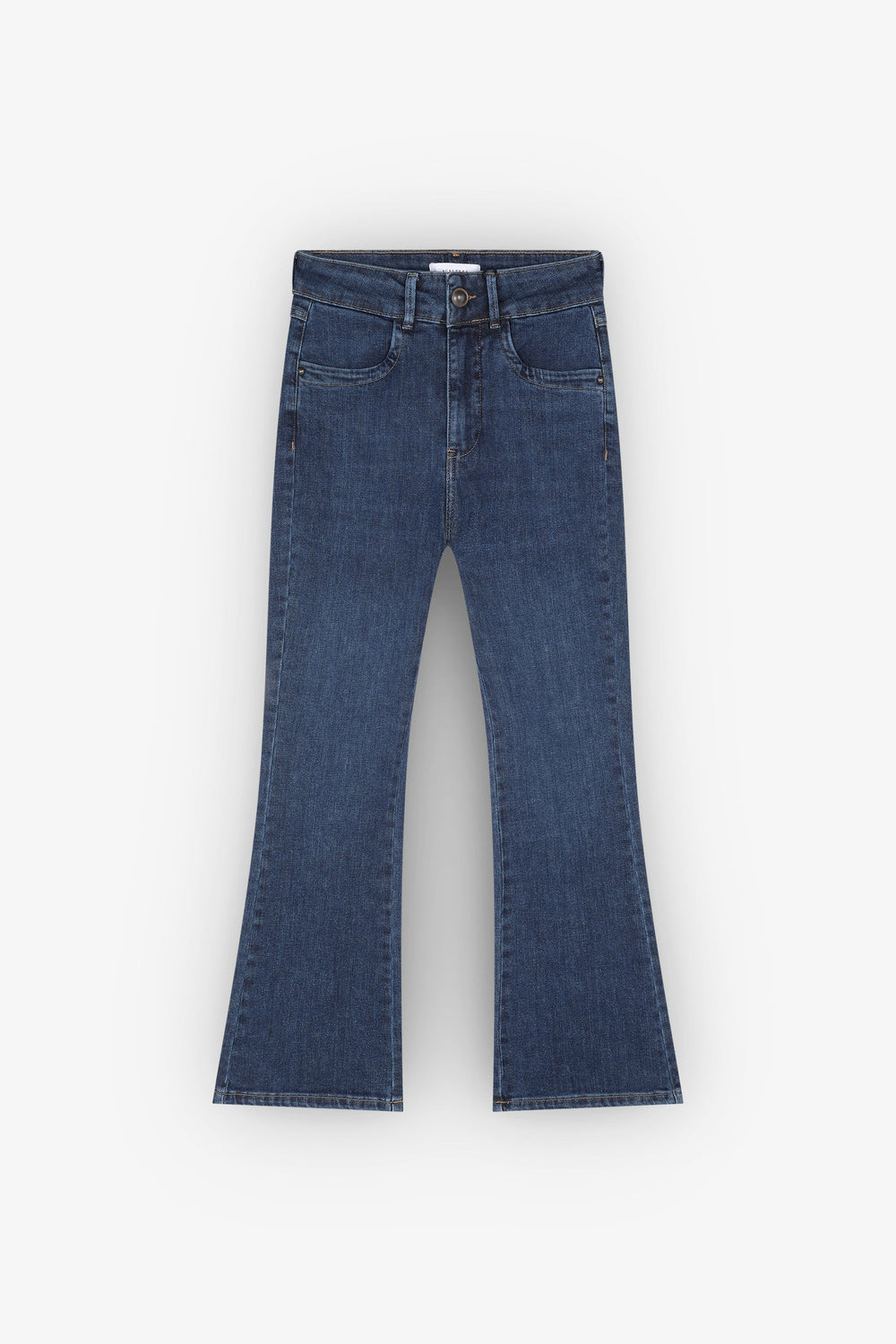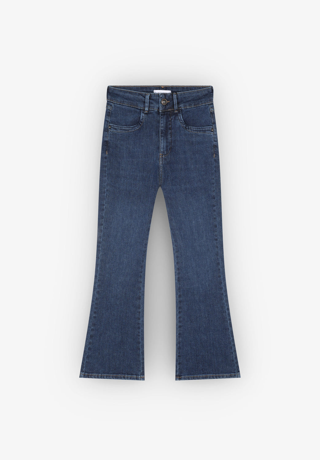 Jeans confecionados em algodão ligeiramente elástico. Corte pelo tornozelo boca de sino, fecho com botão e zip. Bolsos laterais e traseiros e presilhas na cintura.