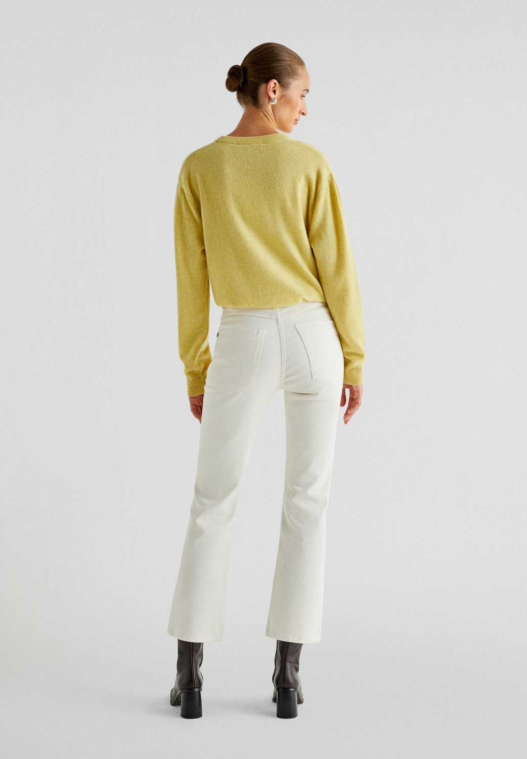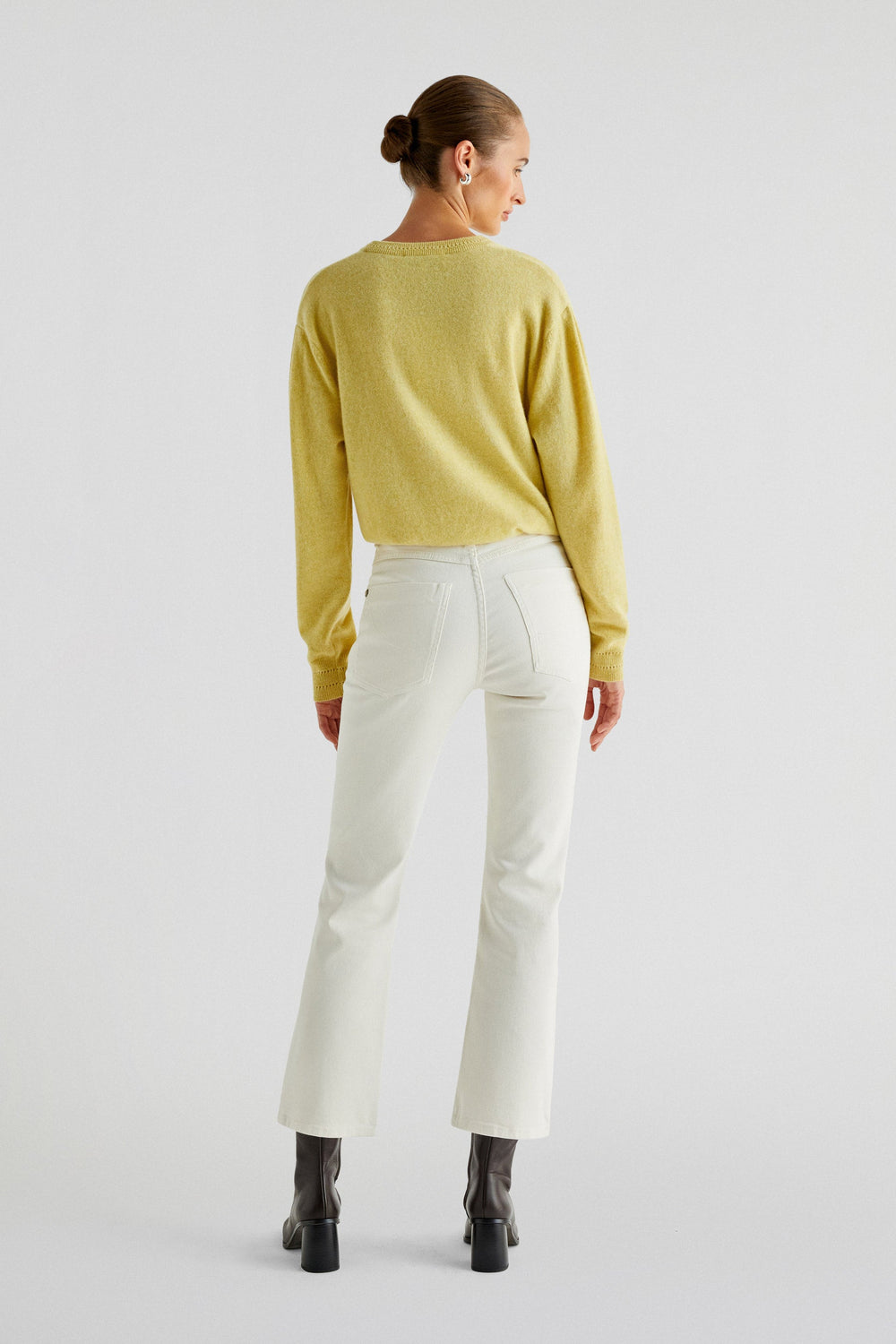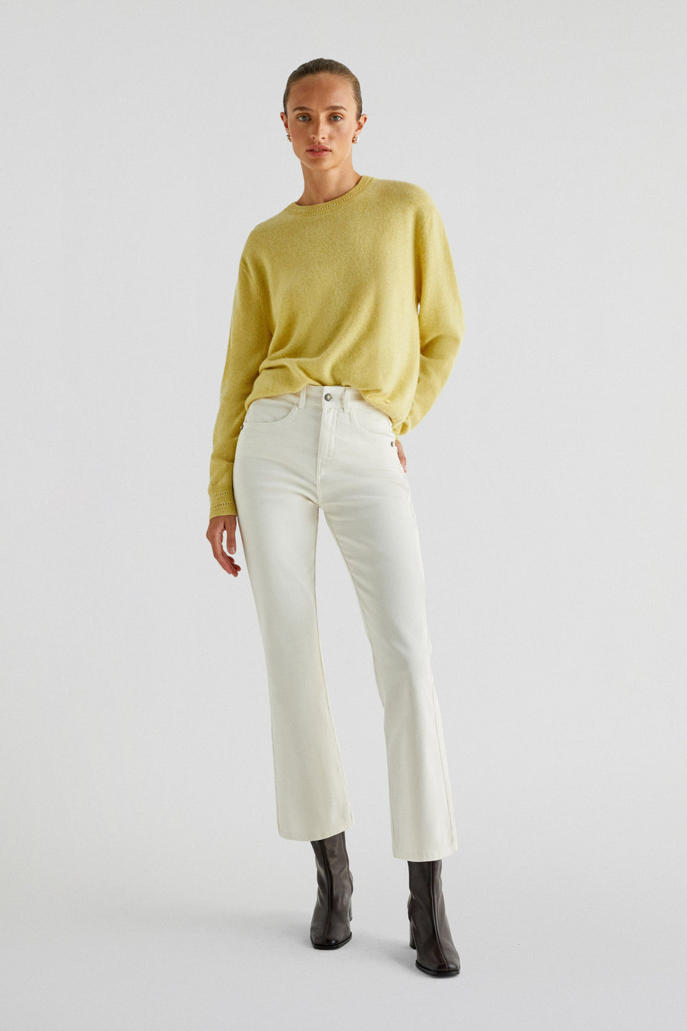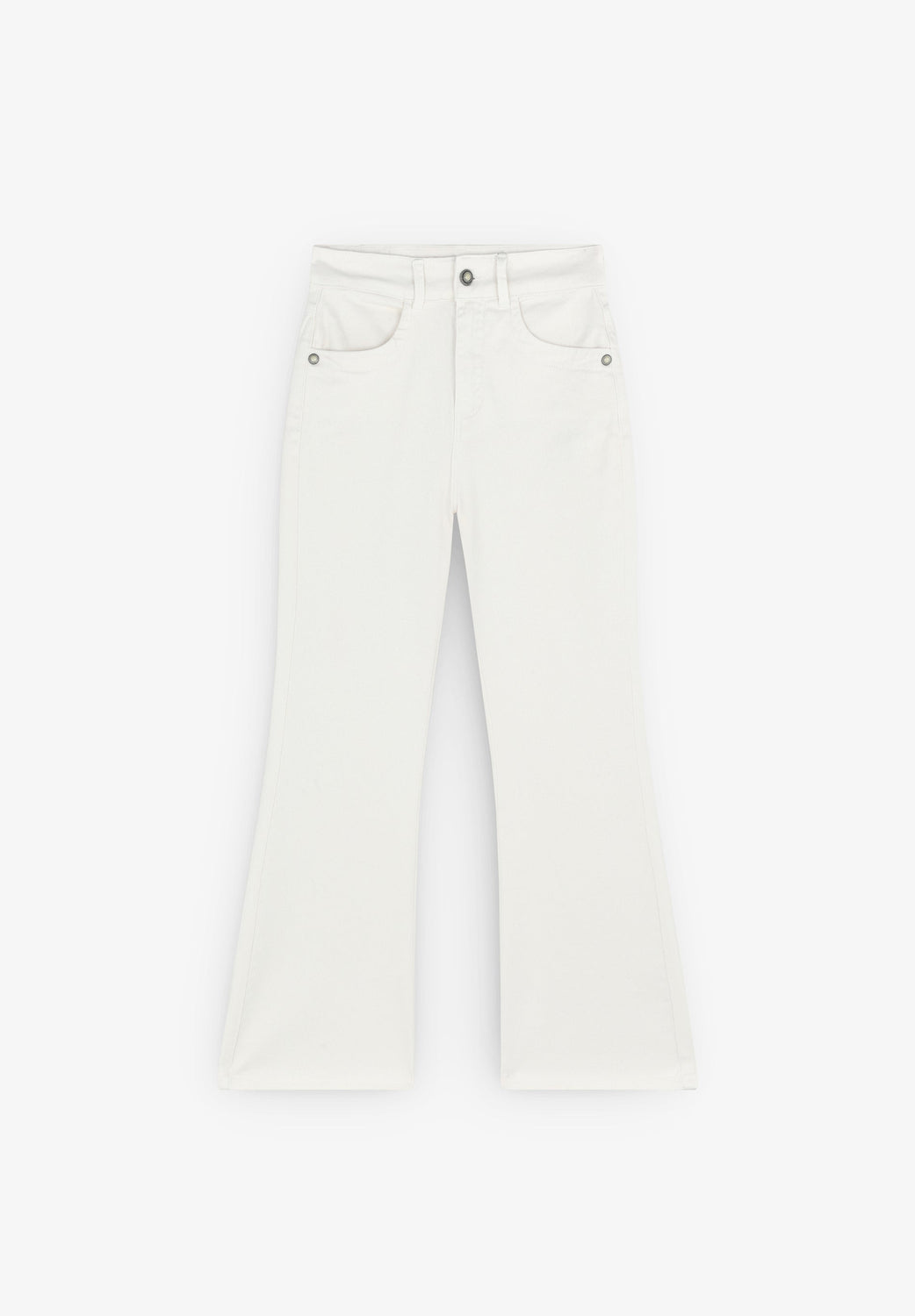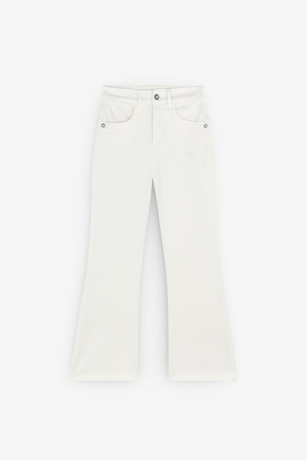 Jeans confecionados em algodão ligeiramente elástico. Corte pelo tornozelo boca de sino, fecho com botão e zip. Bolsos laterais e traseiros e presilhas na cintura.