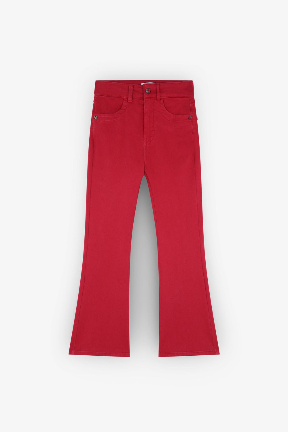 Jeans confecionados em algodão ligeiramente elástico. Corte pelo tornozelo boca de sino, fecho com botão e zip. Bolsos laterais e traseiros e presilhas na cintura.