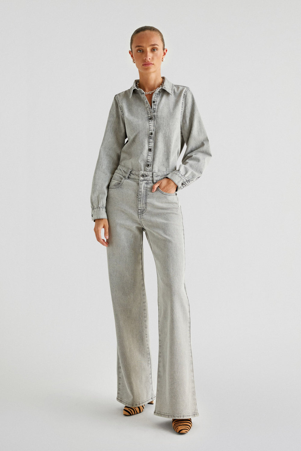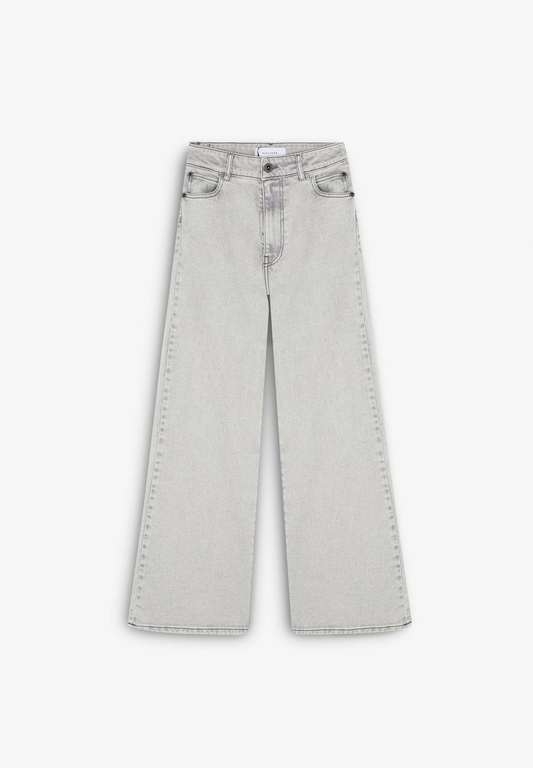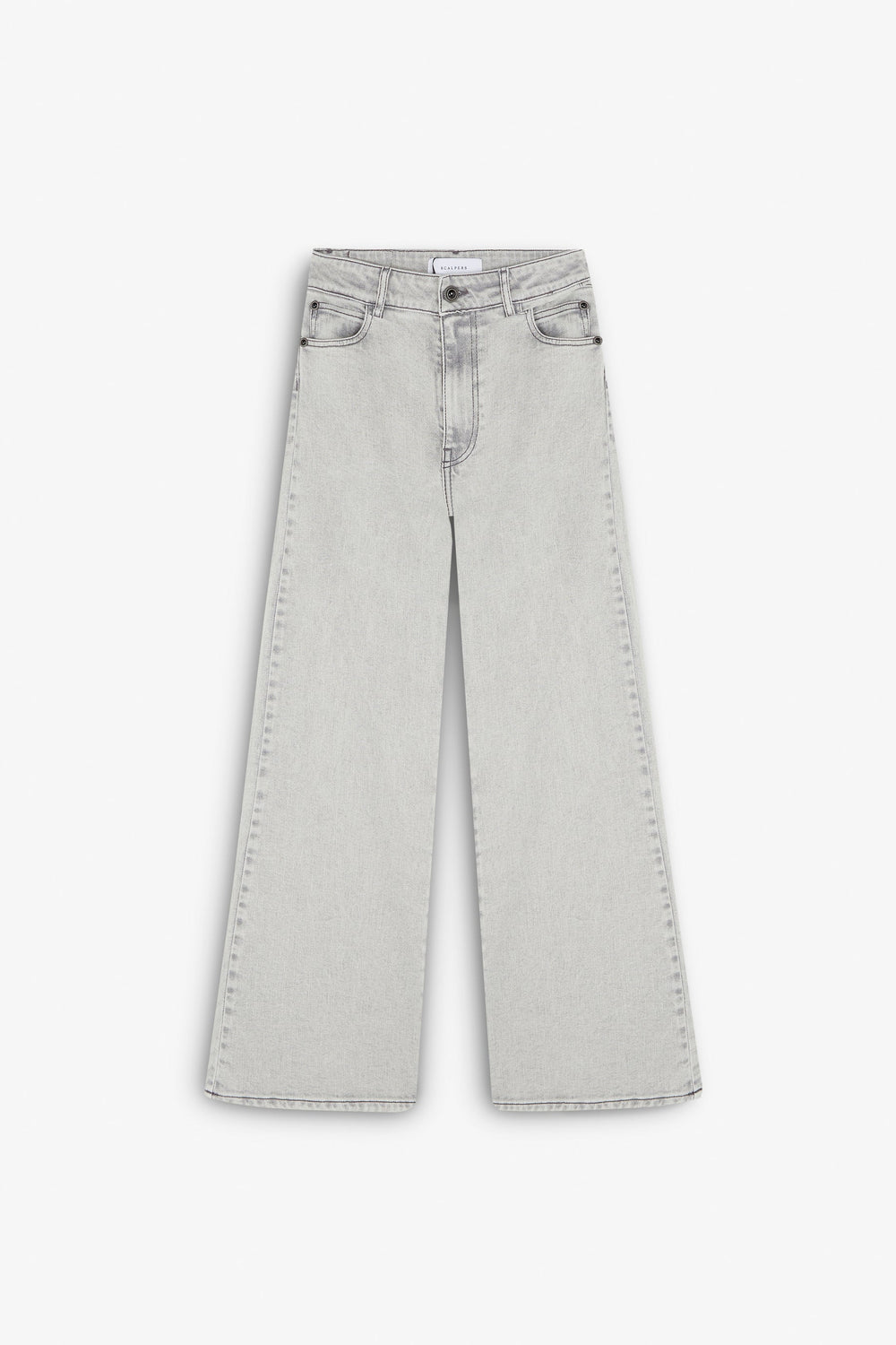 Jeans desbotados confecionados em algodão muito elástico. Corte boca de sino com cintura subida, fecho com botão e zip e presilhas na cintura. Bolsos à frente e atrás.
