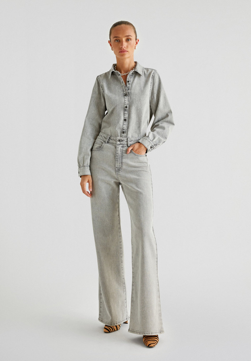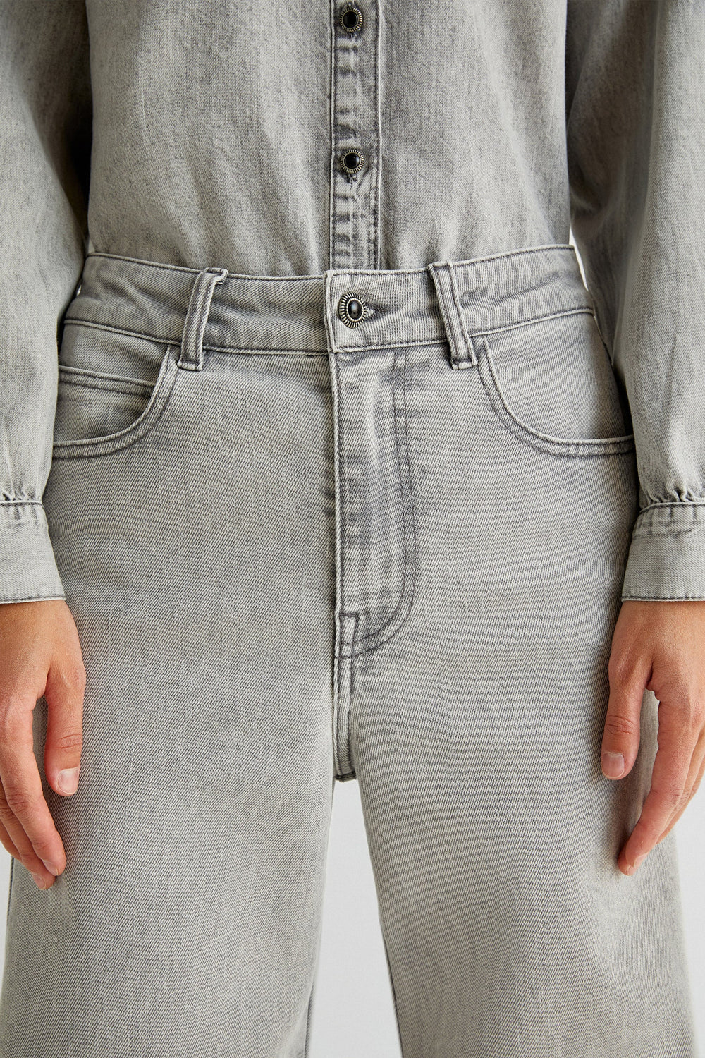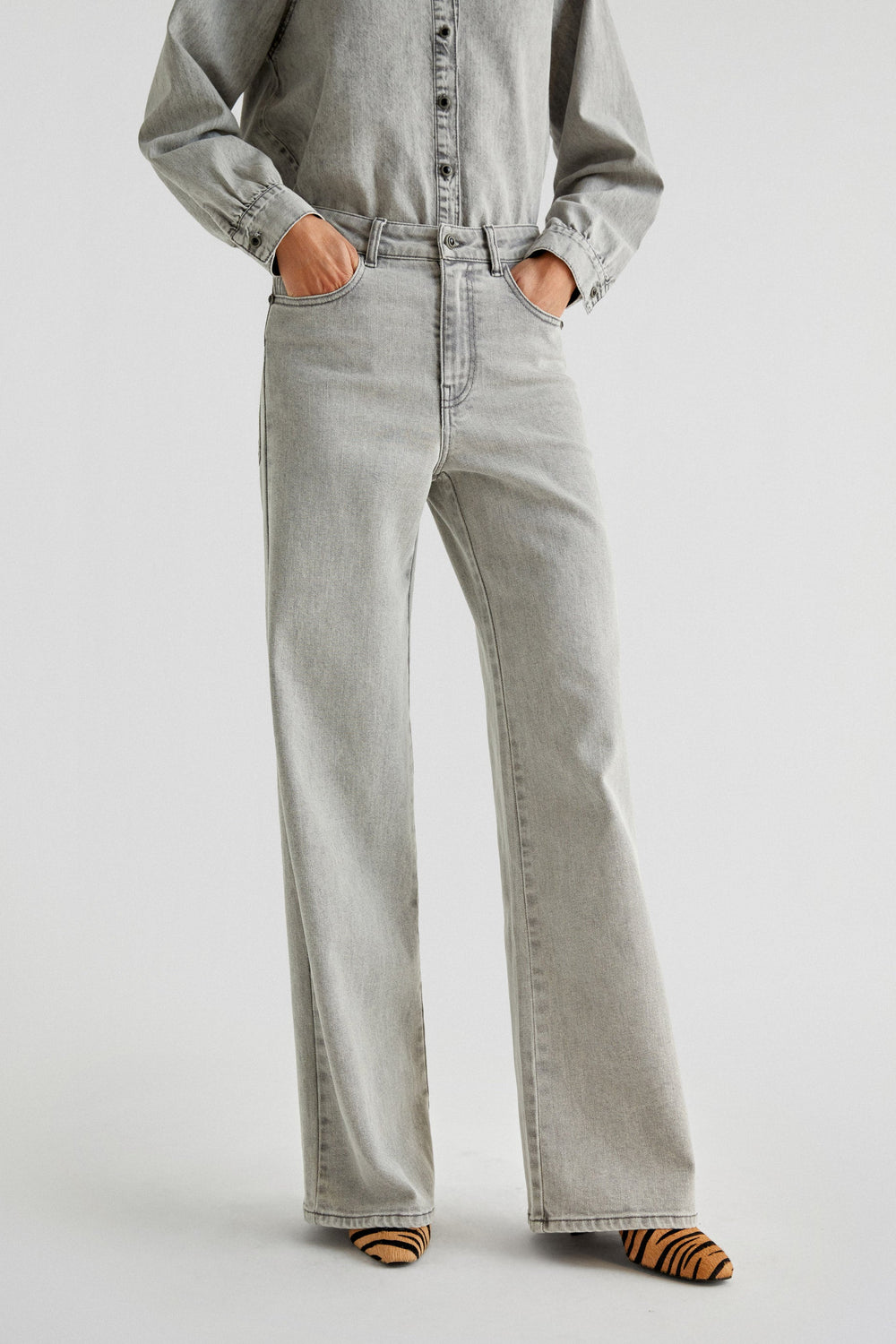 Jeans desbotados confecionados em algodão muito elástico. Corte boca de sino com cintura subida, fecho com botão e zip e presilhas na cintura. Bolsos à frente e atrás.