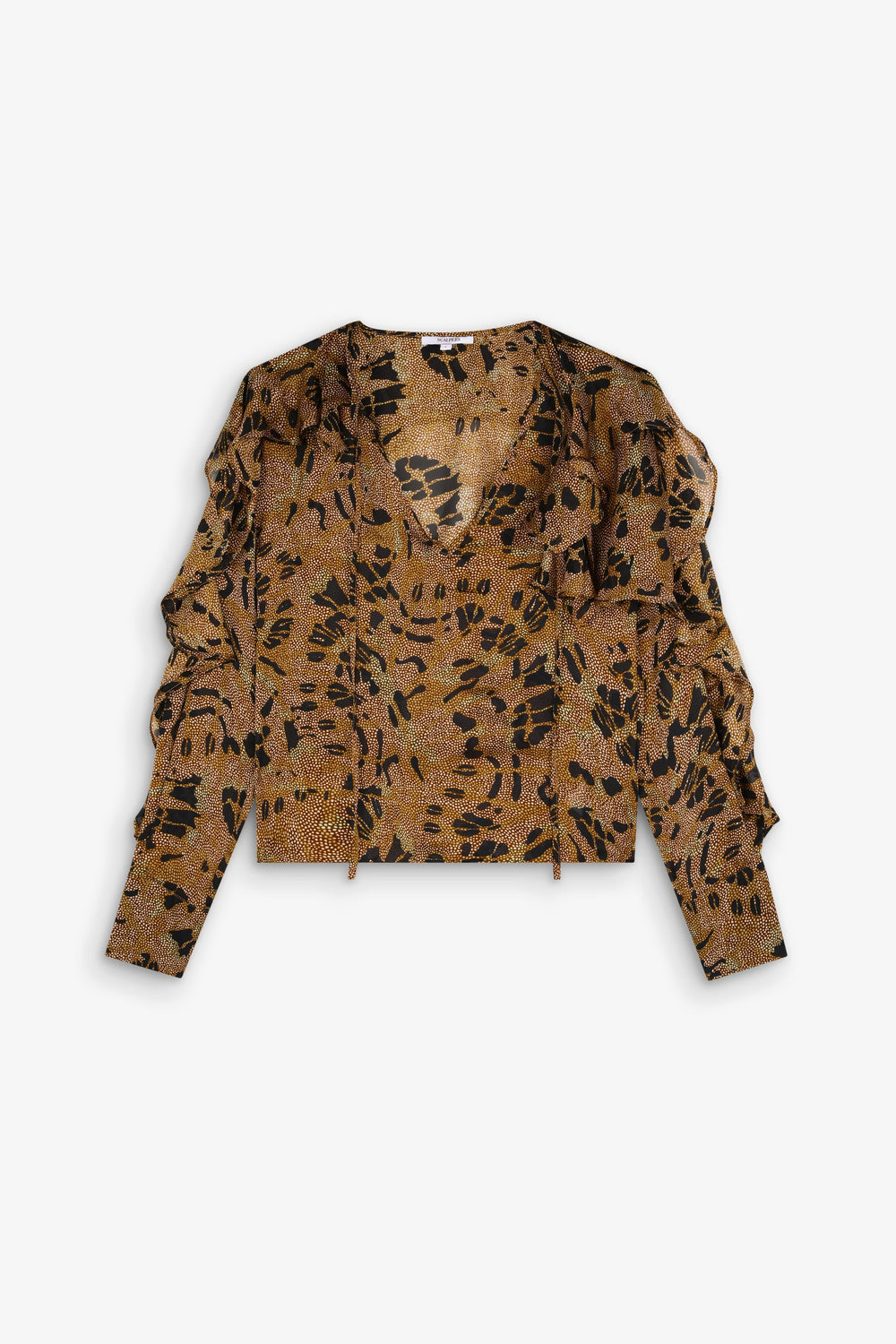Blusa com padrão confecionada em tecido fluido. Regular fit, decote em bico e fecho com laço. Manga comprida terminada em punho com botões e pormenor de folhos.