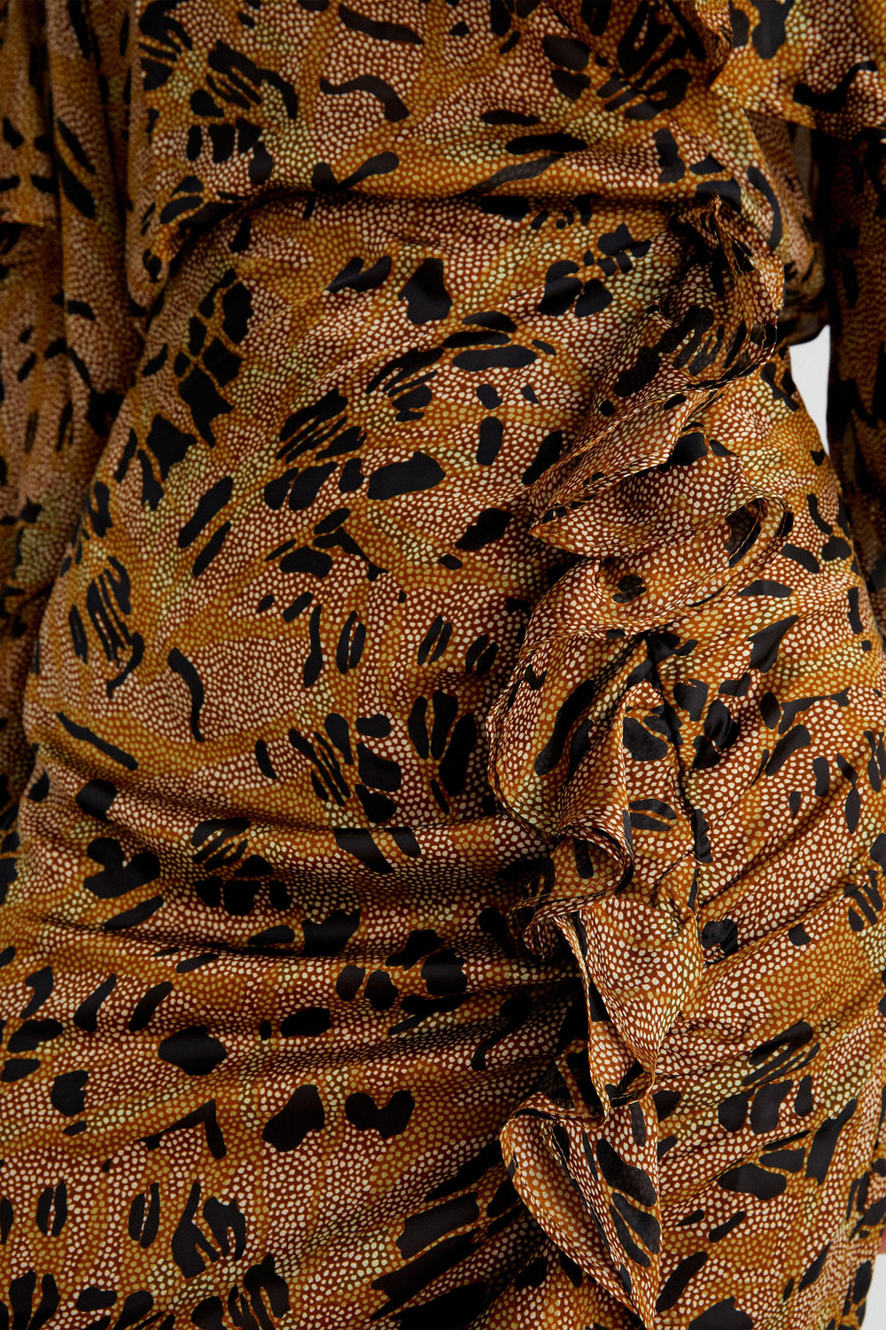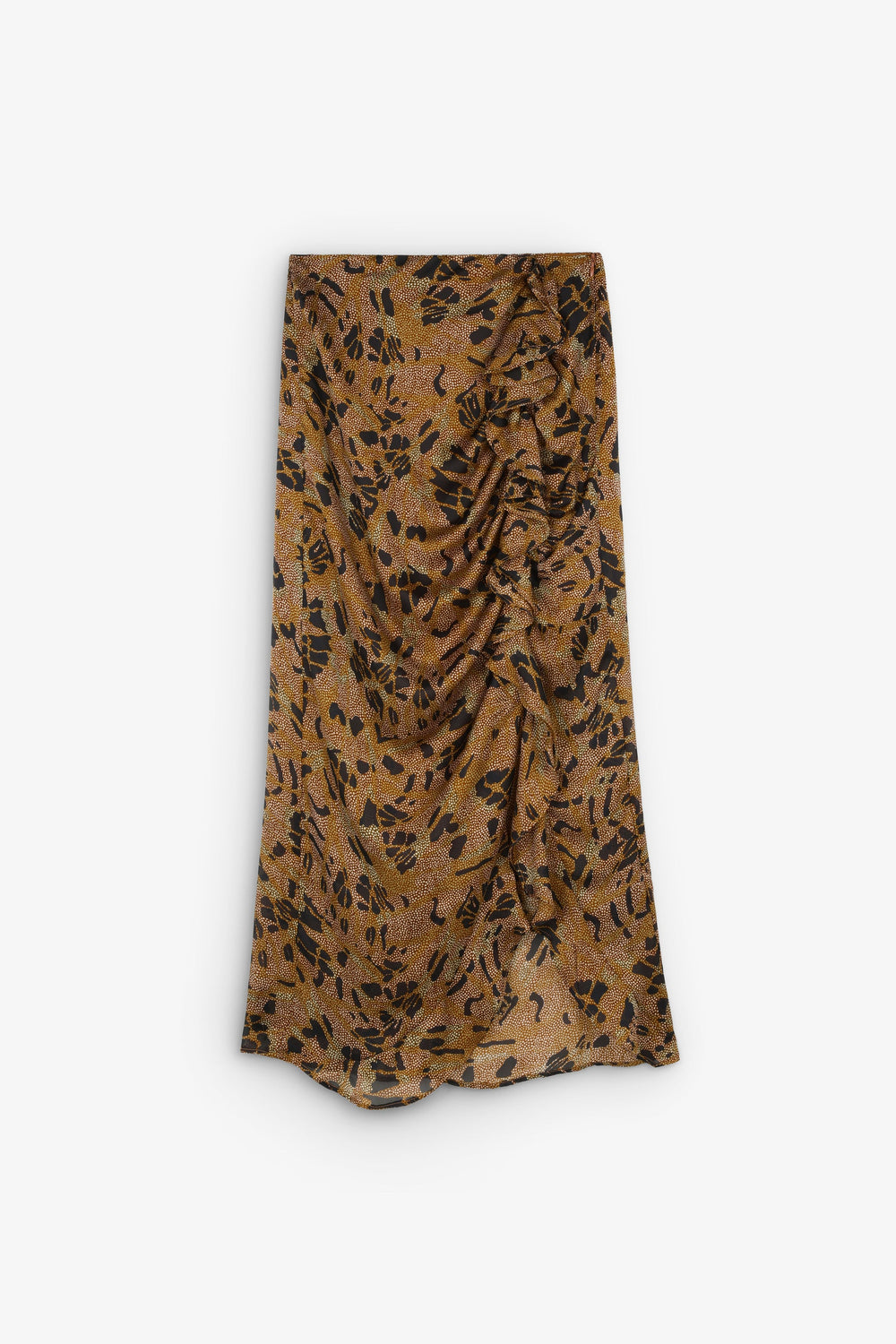 Minissaia com padrão drapeada confecionada em tecido fluido. Fecho de correr e bainha com abertura.