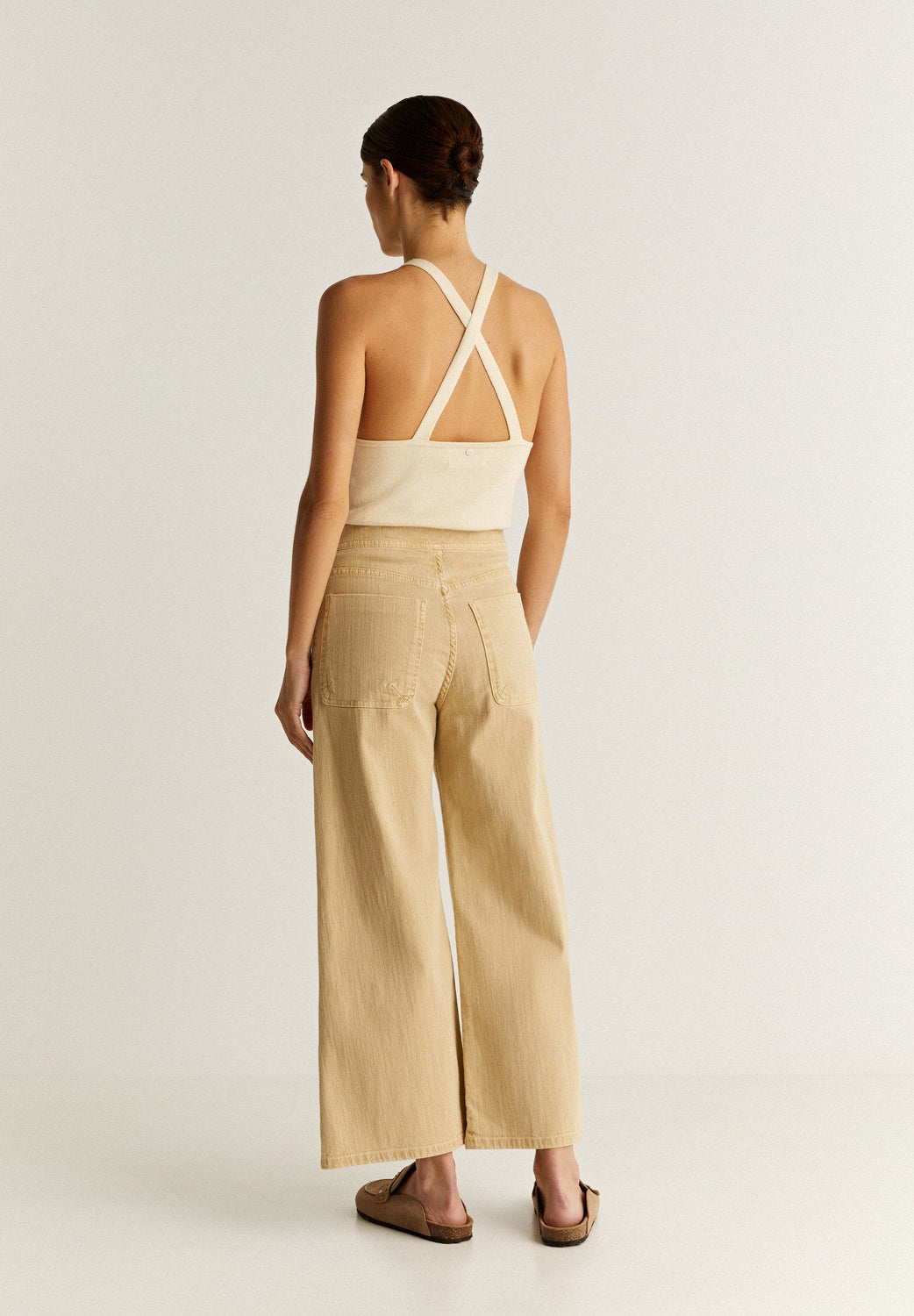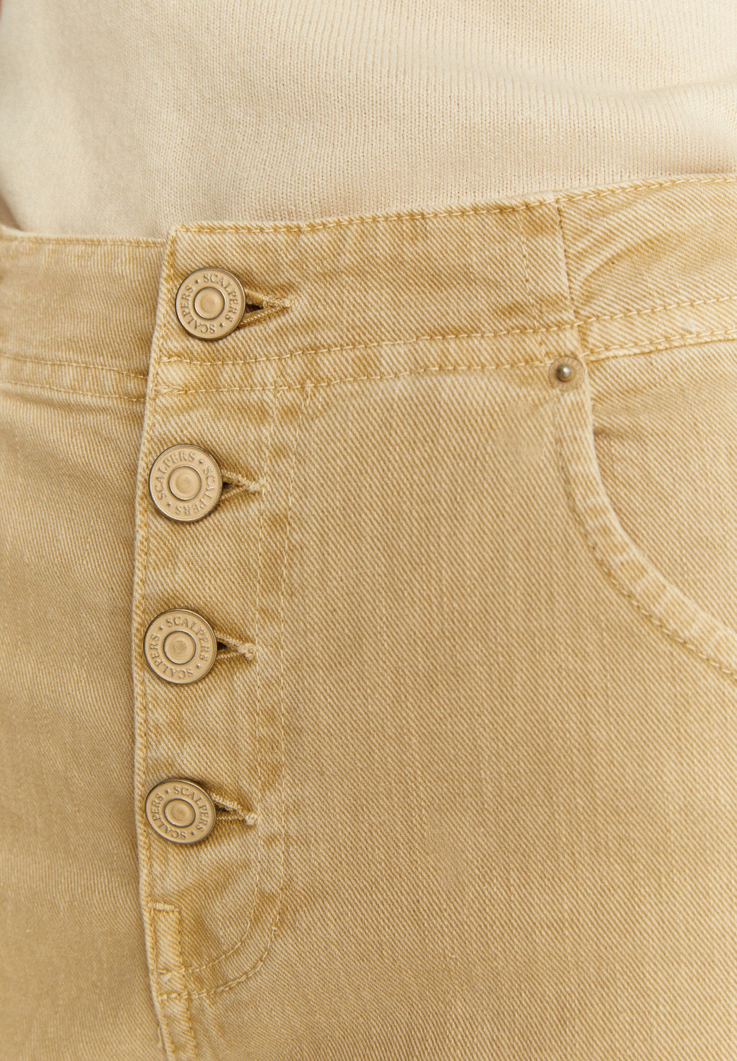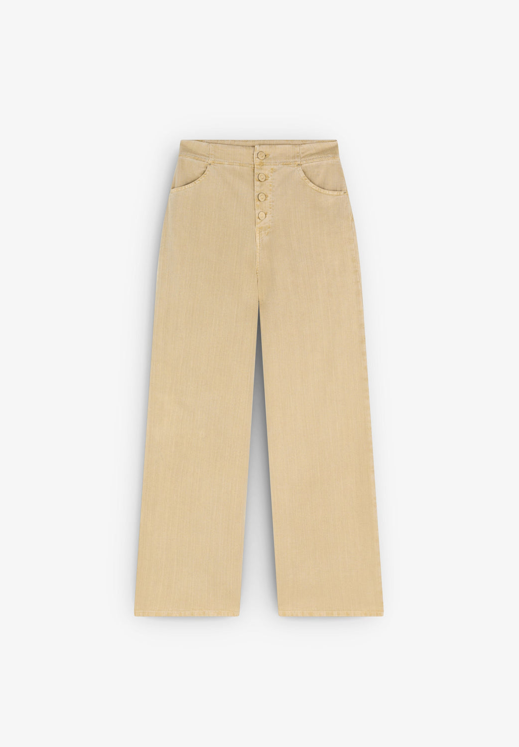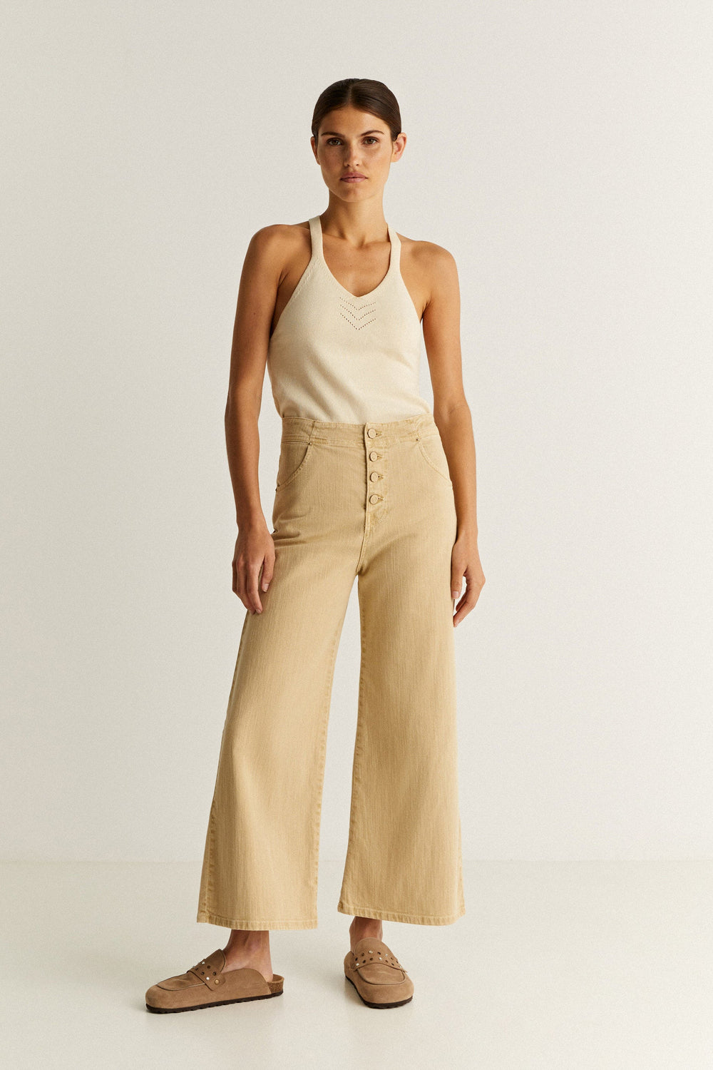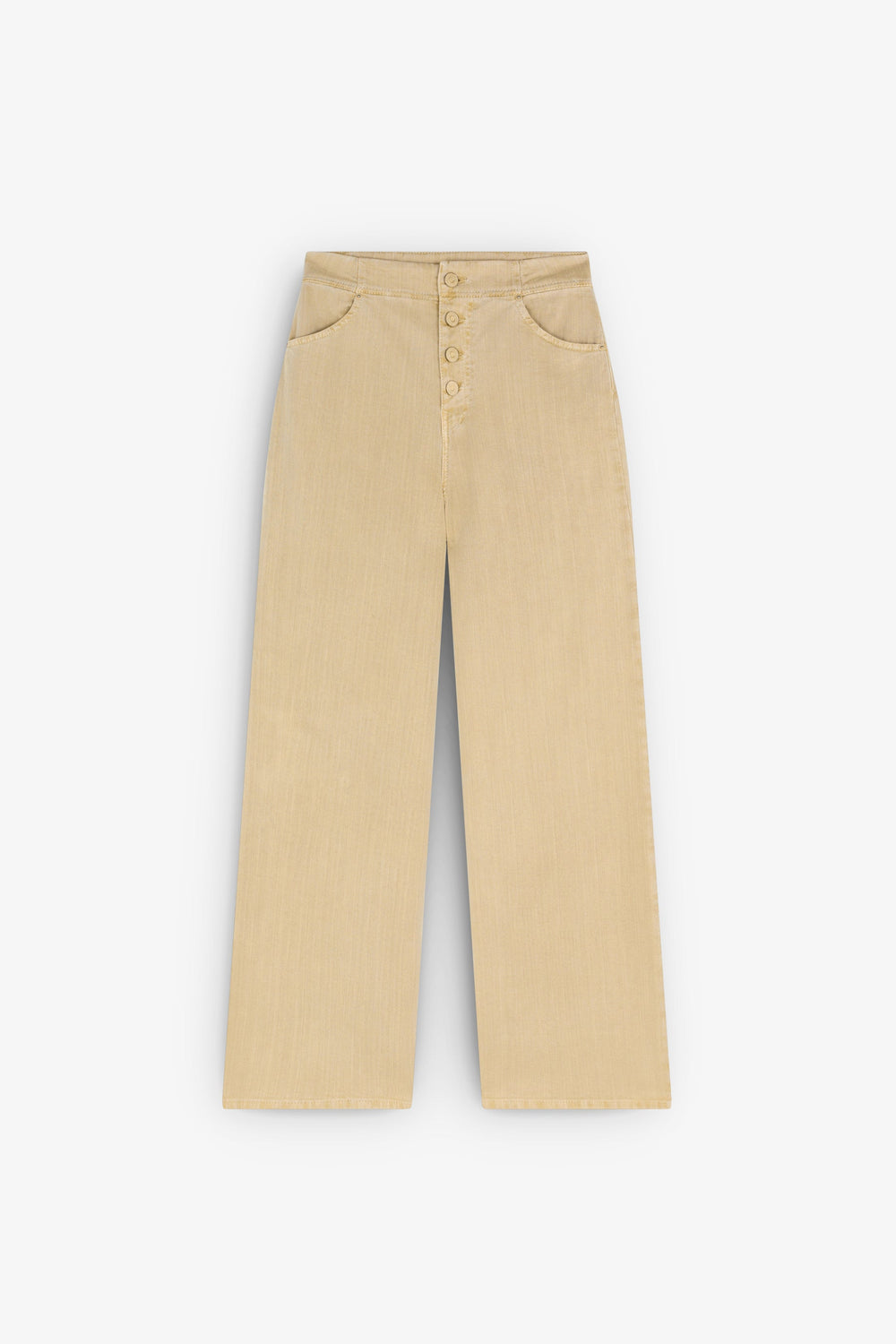 Calças de ganga em efeito desbotado com botões no mesmo tom.
