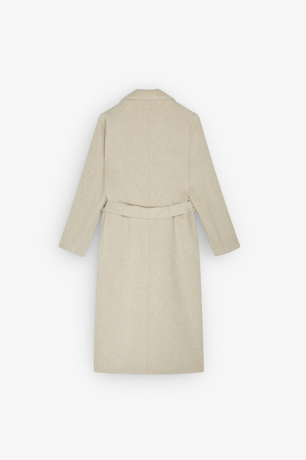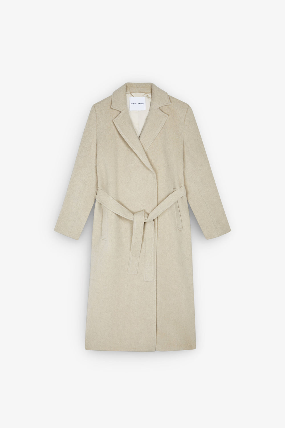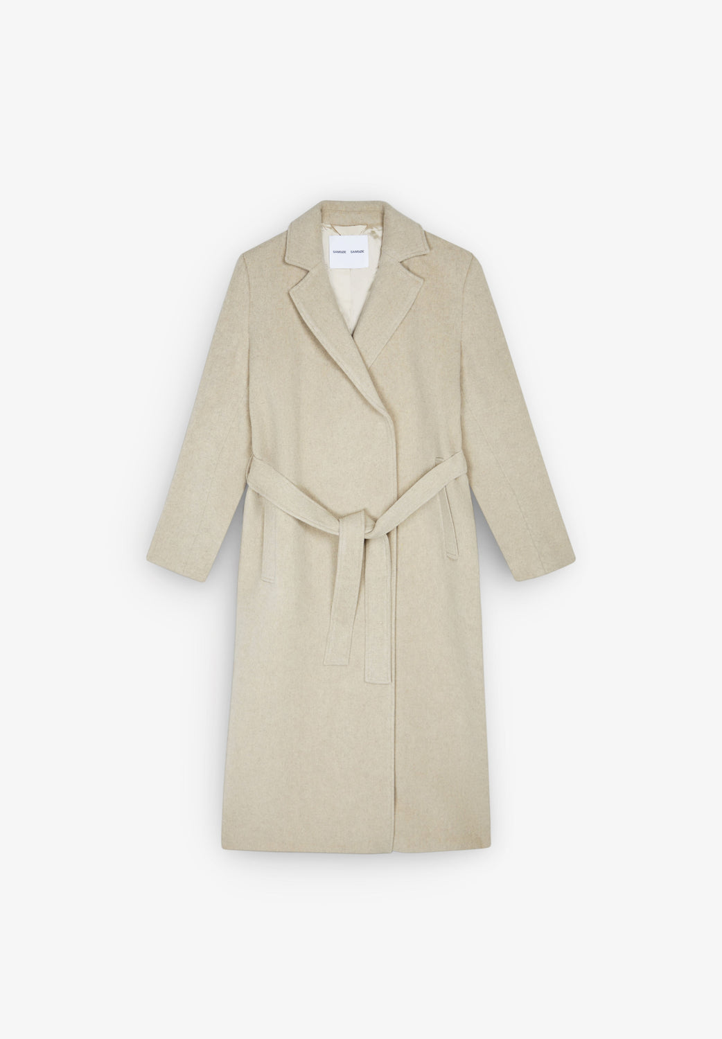 Casaco comprido Samsoe confecionado em tecido com mistura de lã recycled, poliéster e poliamida.