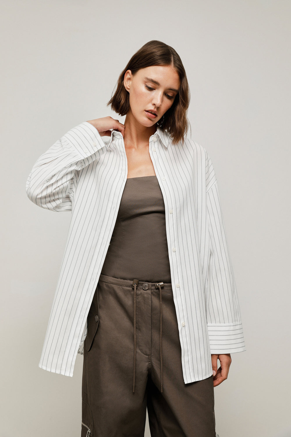 - Ombros descaídos e mangas largas.