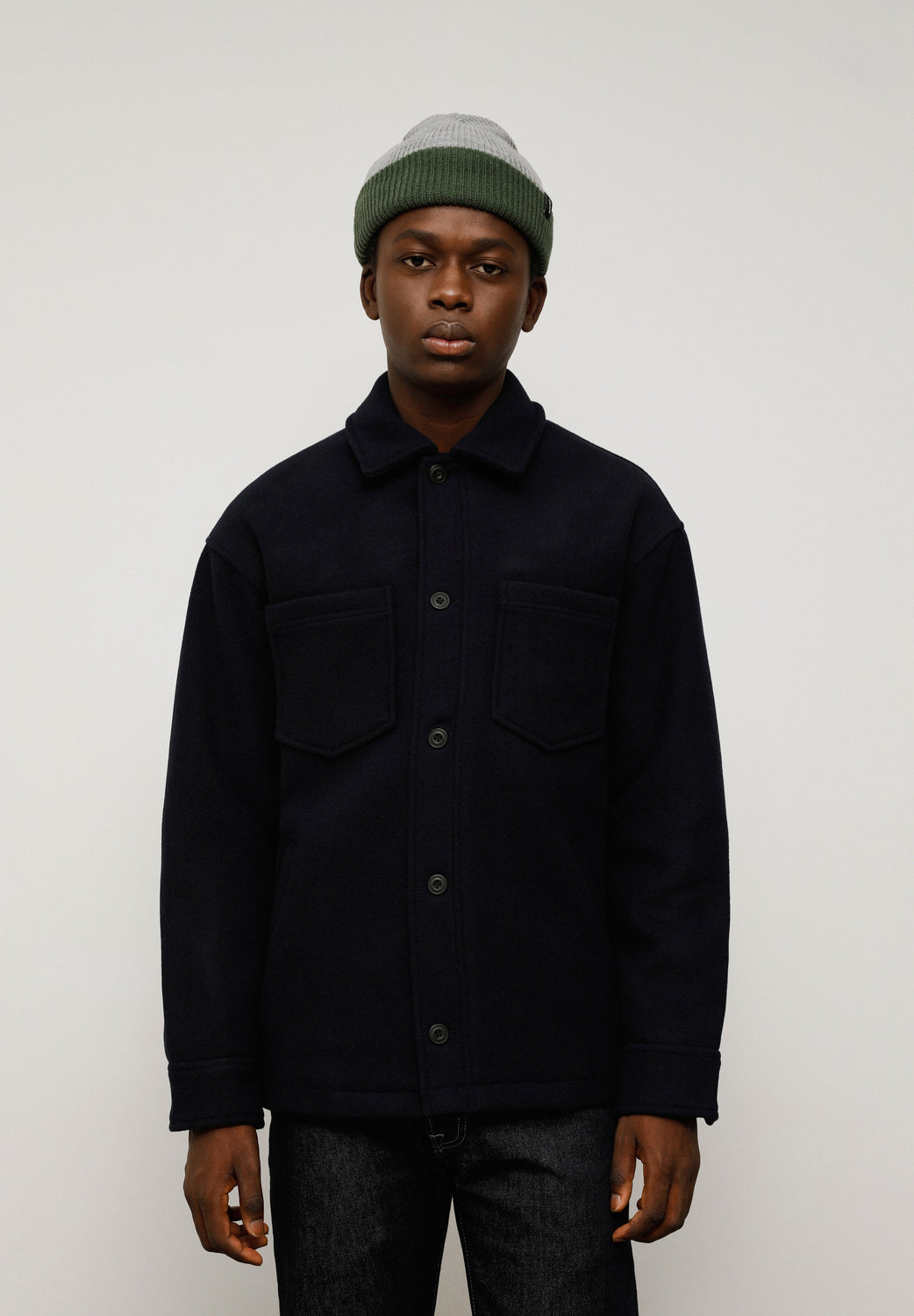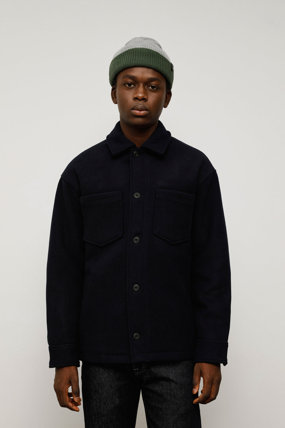 - Punhos com botões e bolsos laterais debruados.