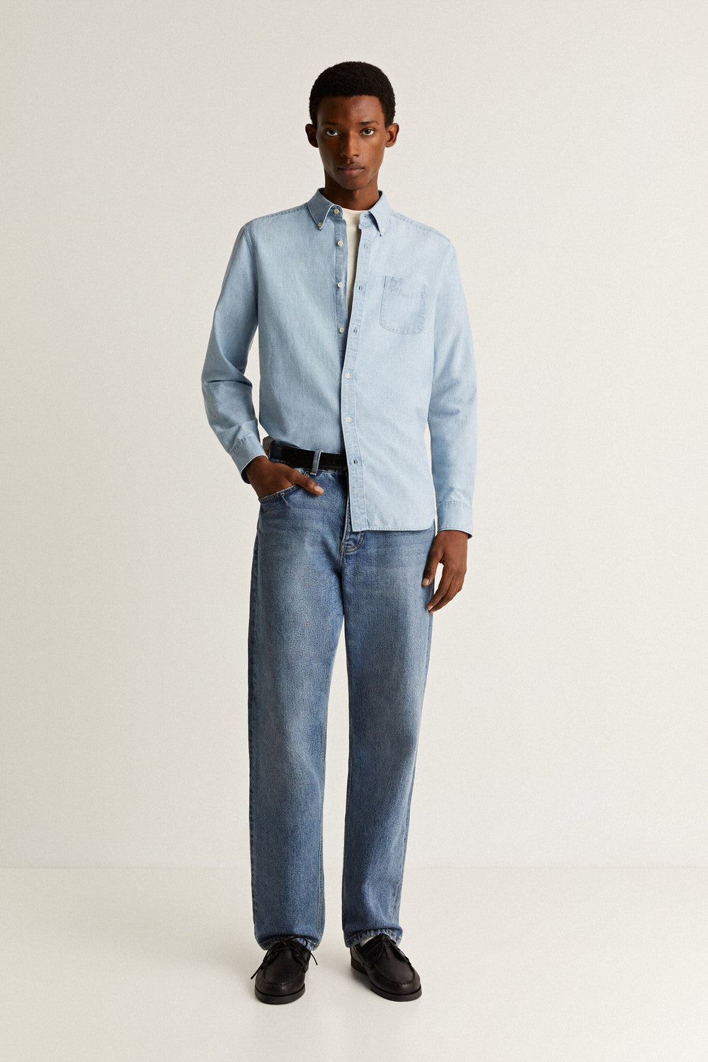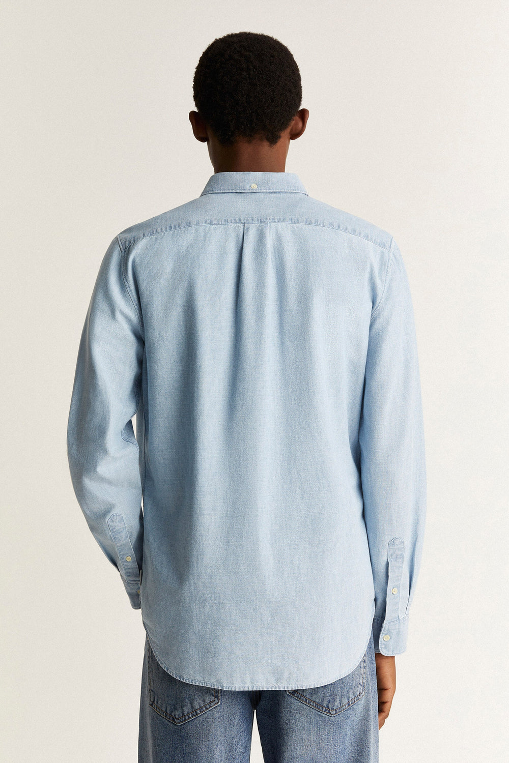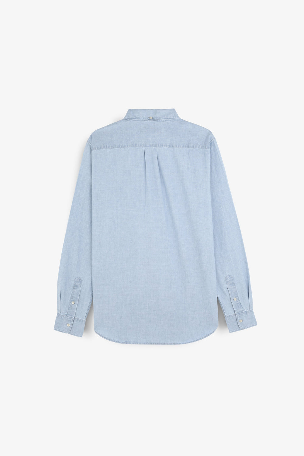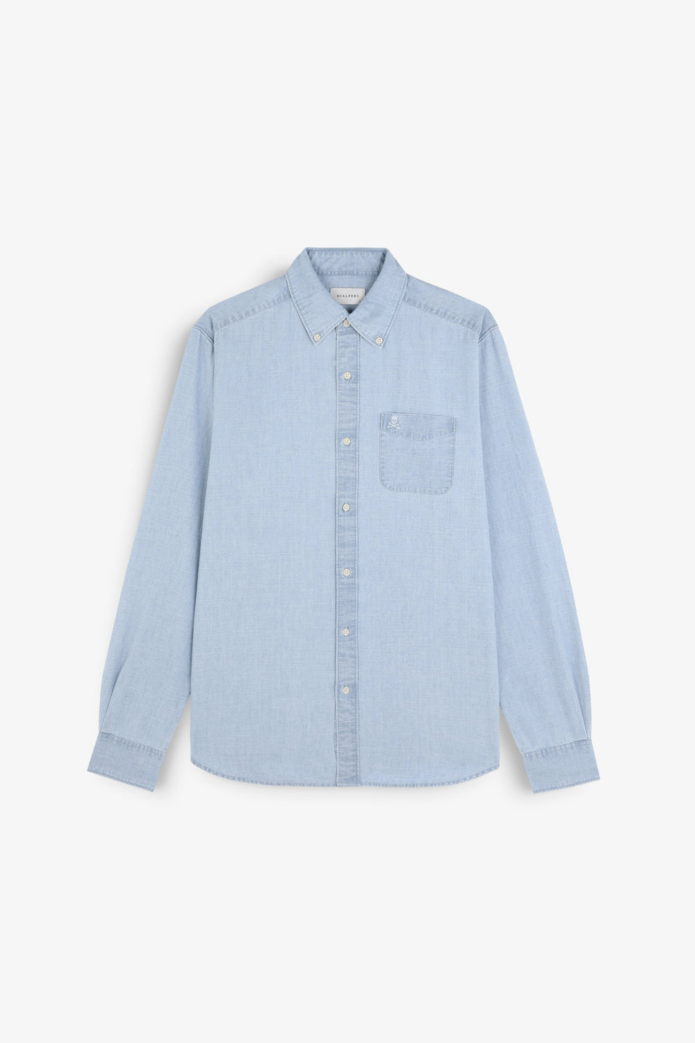Camisa denim com pormenor de skull bordada no mesmo tom no peito.