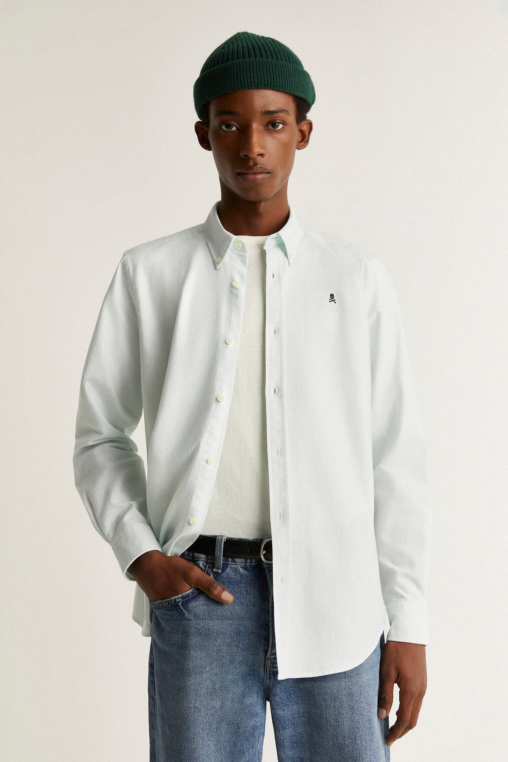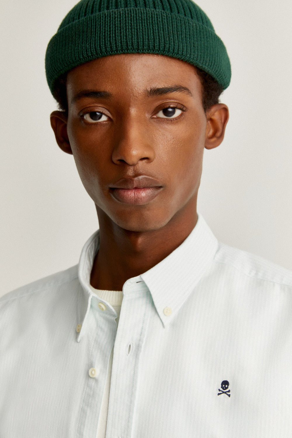 Camisa com skull bordada em contraste no peito.