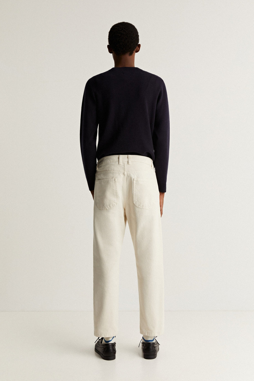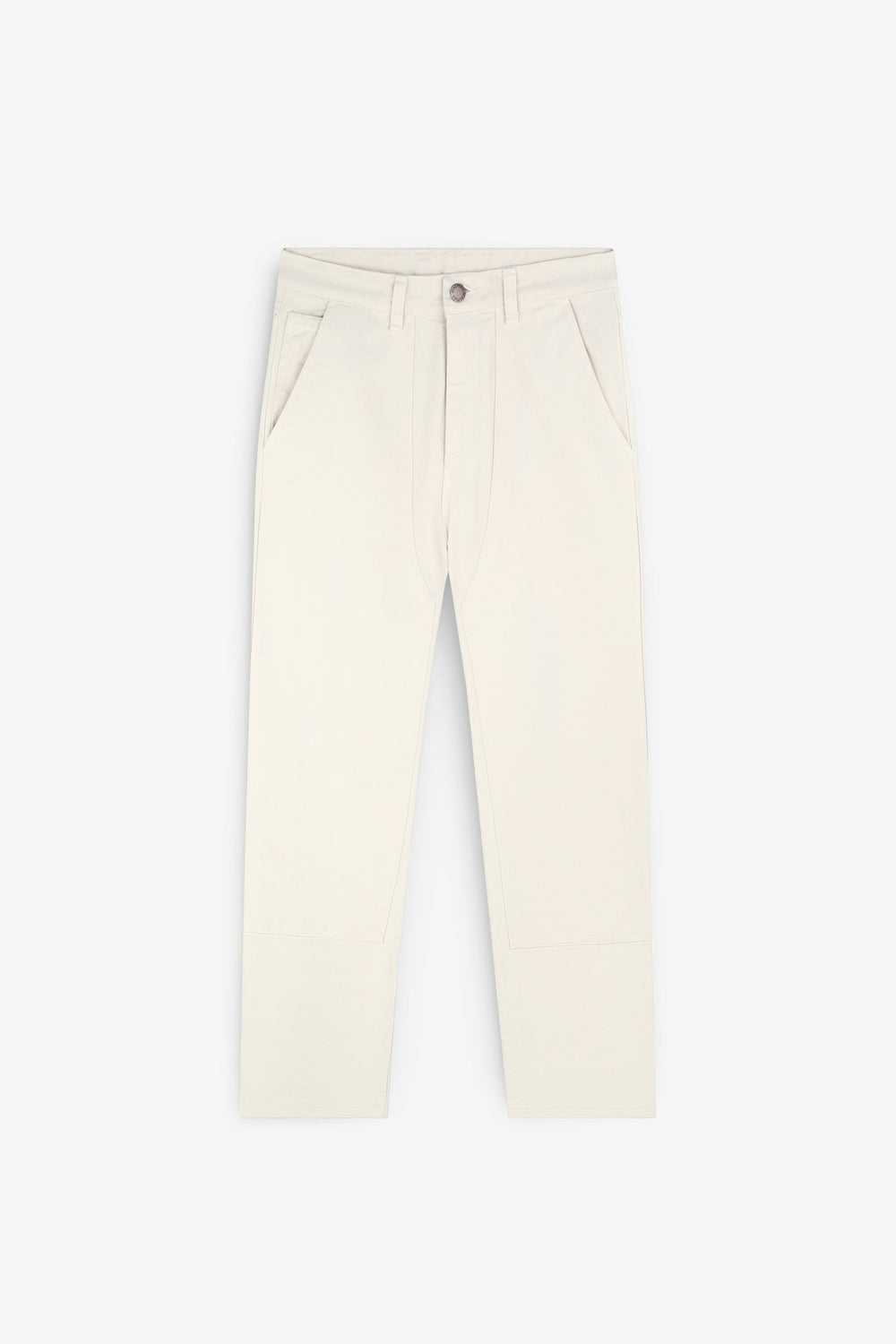 Calças em tecido de sarja com as costuras pronunciadas.