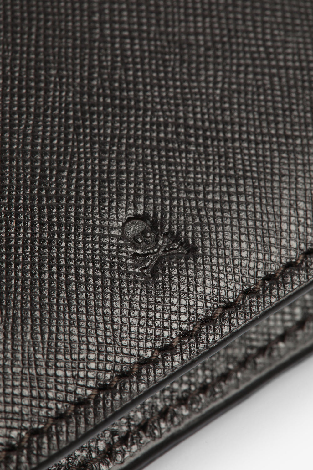 Cartera con calavera y logo grabados.