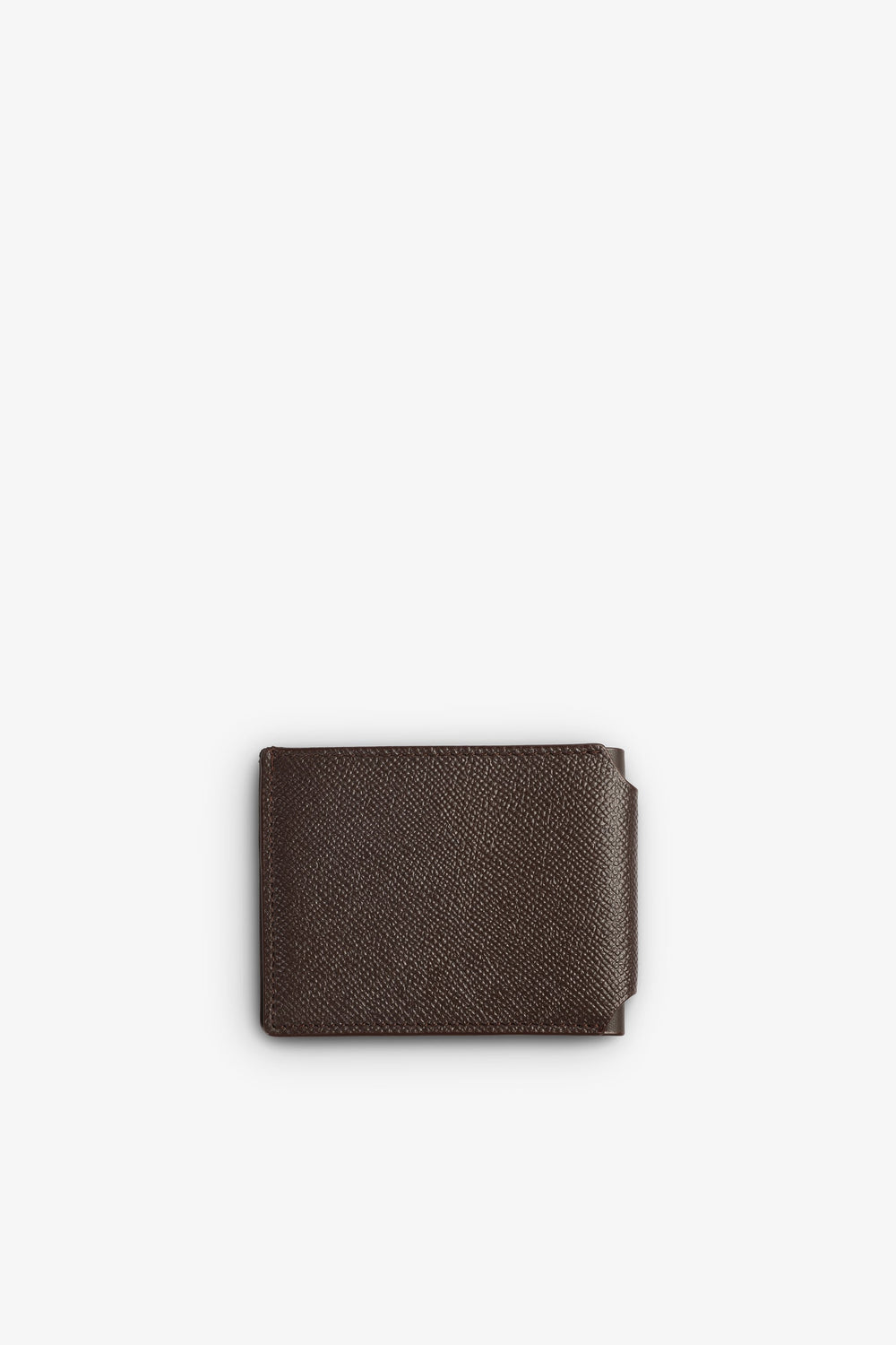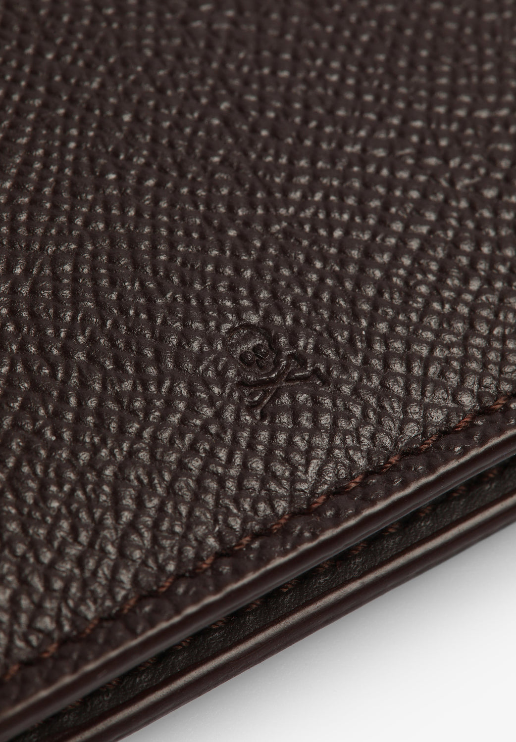 Carteira com caveira e logótipo gravado. Confeccionada em 100% pele. Ranhuras e compartimentos interiores.