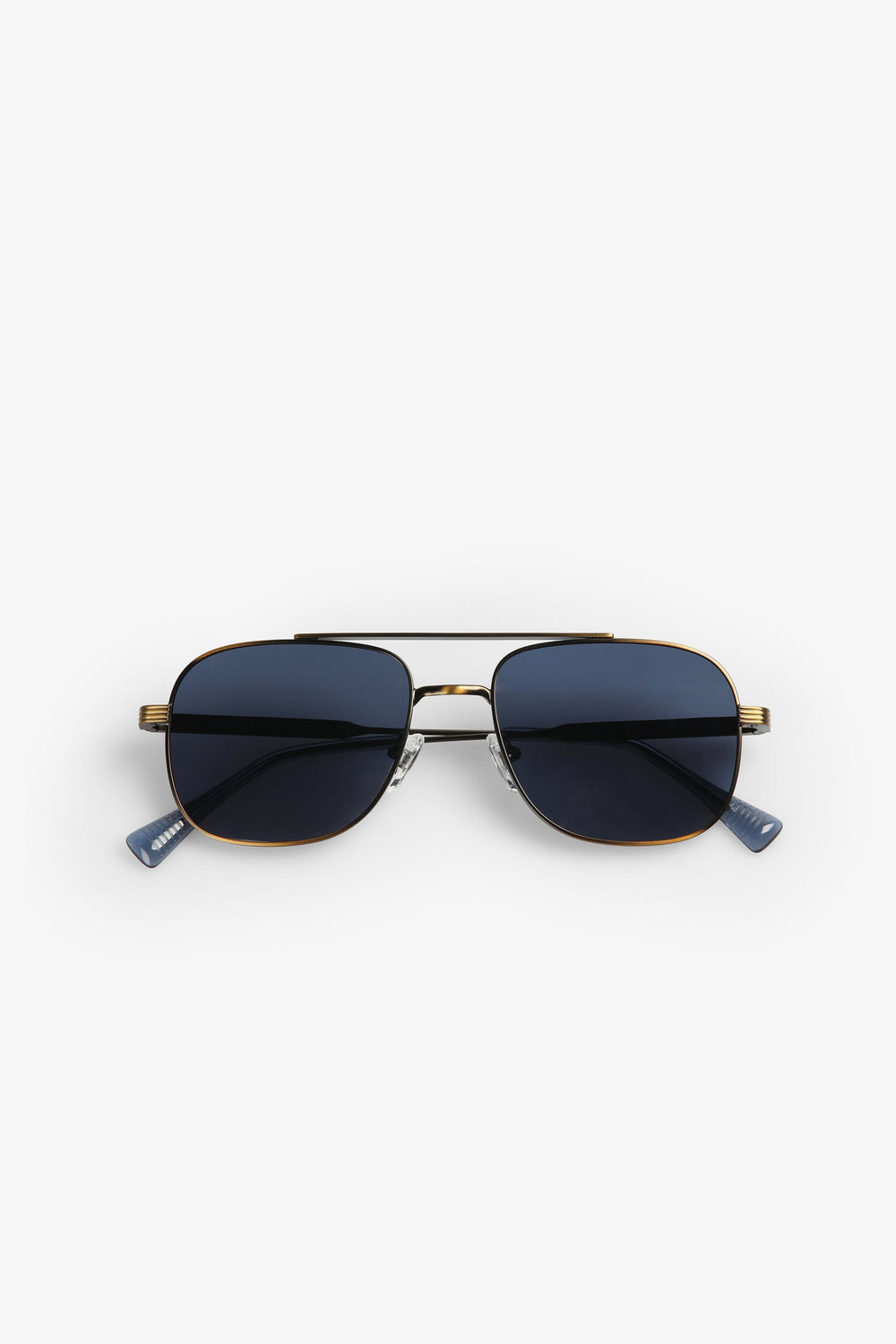 Óculos com aros metálicos. Lentes com filtro de proteção UV. Pormenor de logótipo nas laterais. Inclui uma capa de proteção.