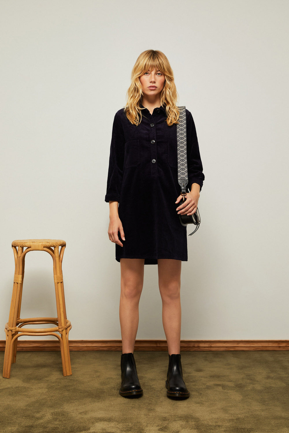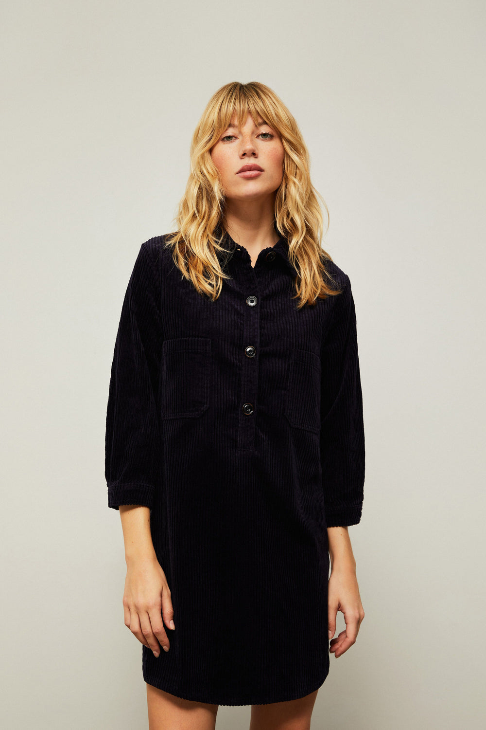 Vestido curto de bombazina confecionado em tecido de mistura de algodão e poliéster.