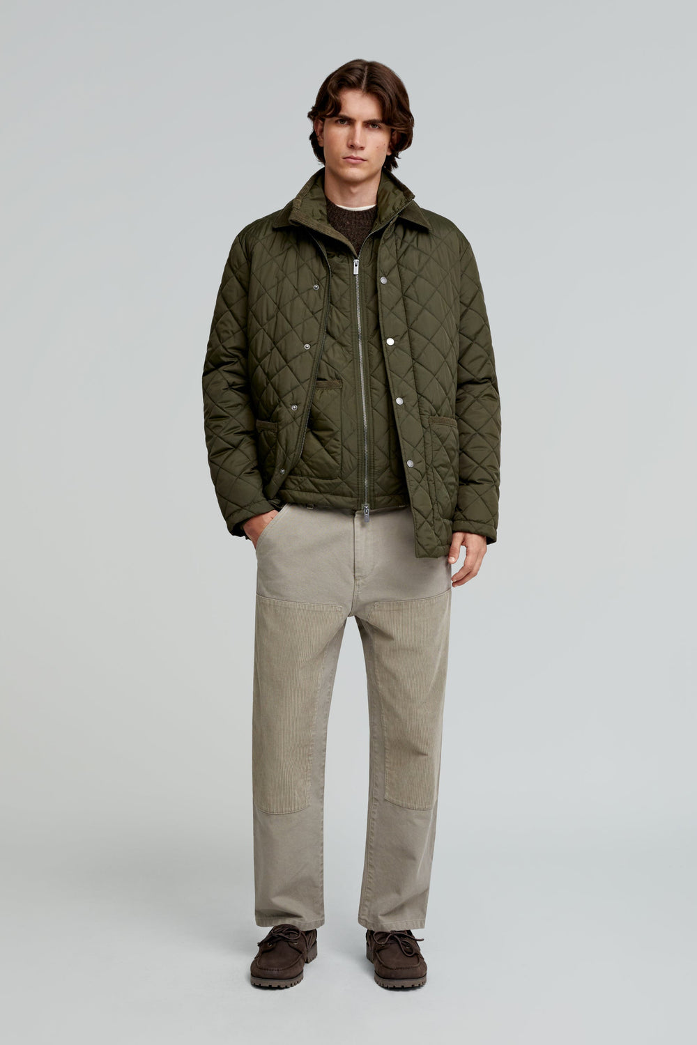 Casaco acolchoado confecionado em tecido técnico. Regular fit, gola de bombazina e fecho com zip e botões de pressão. Manga comprida terminada em punho com elástico e bolsos frontais e interiores.