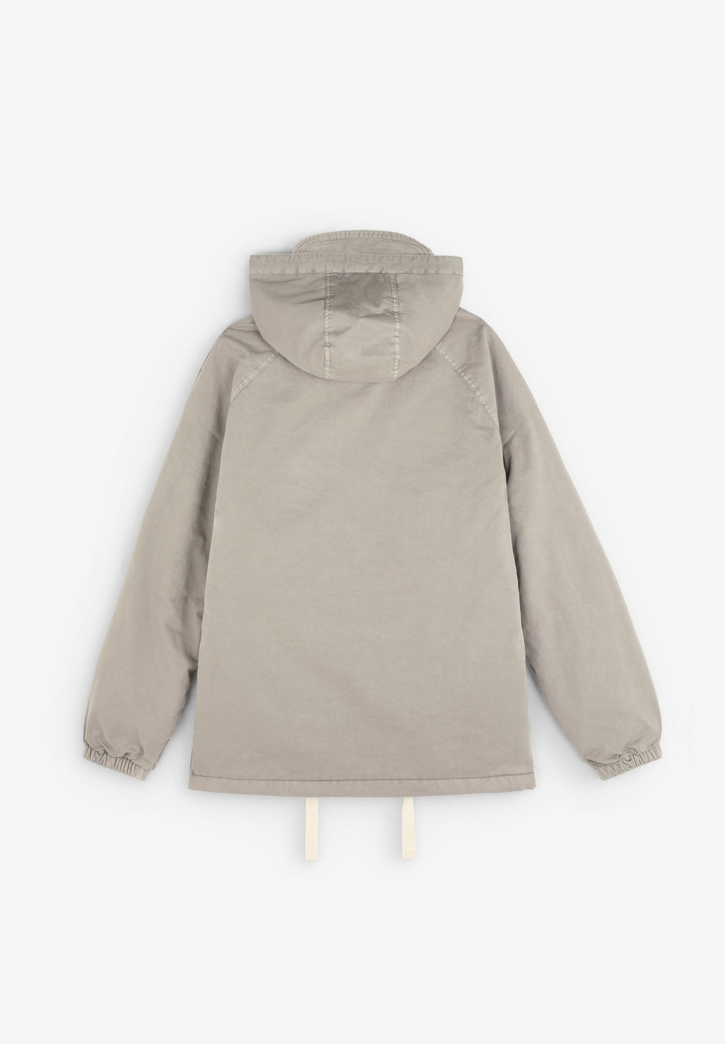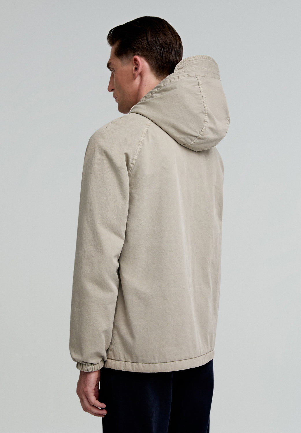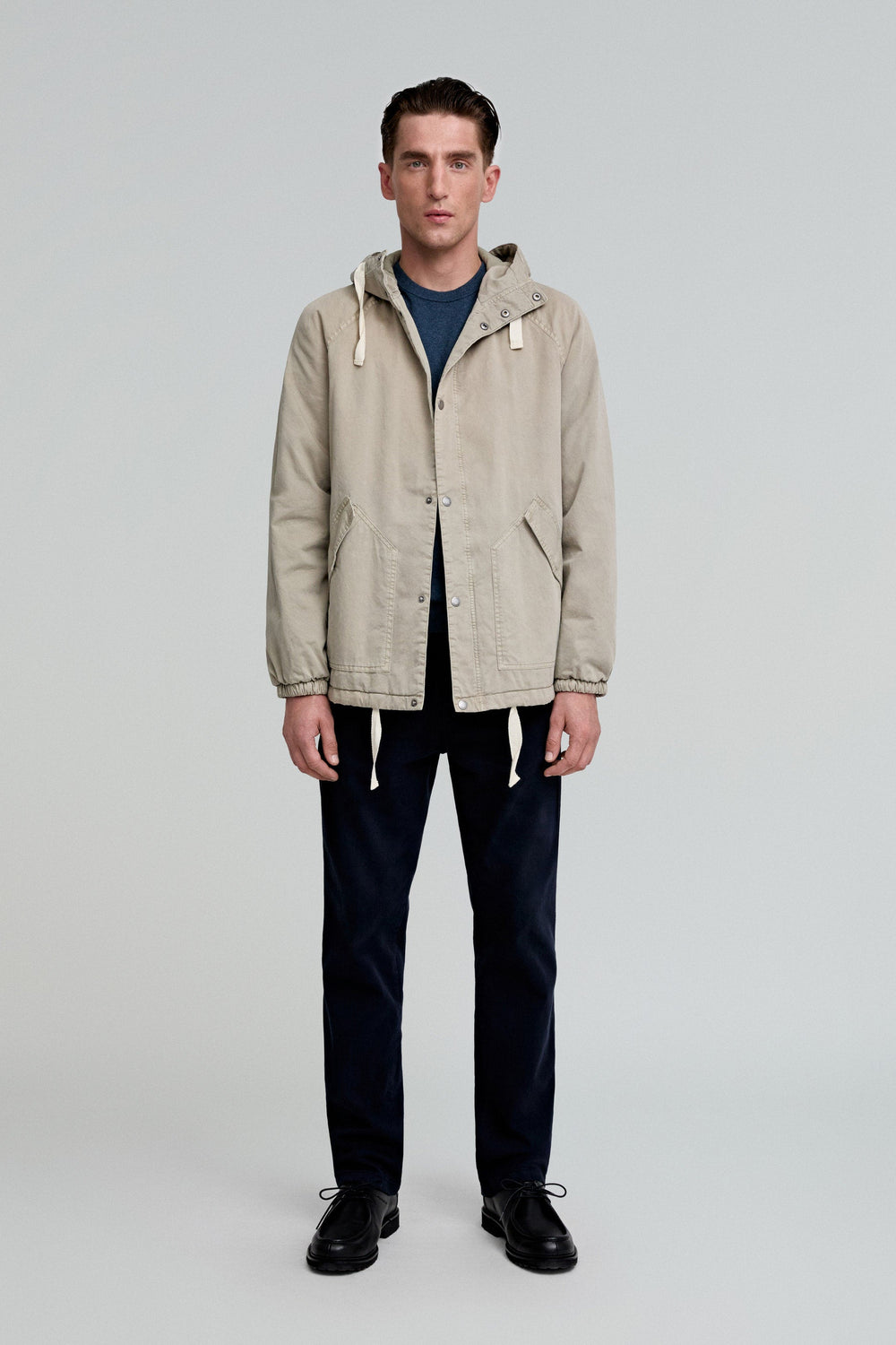 Casaco leve confecionado em 100% algodão BCI. Regular fit, gola com capuz ajustável com cordões e fecho com botões de pressão. Manga comprida terminada em elástico e bolsos com placket. Bolso interior com zip.