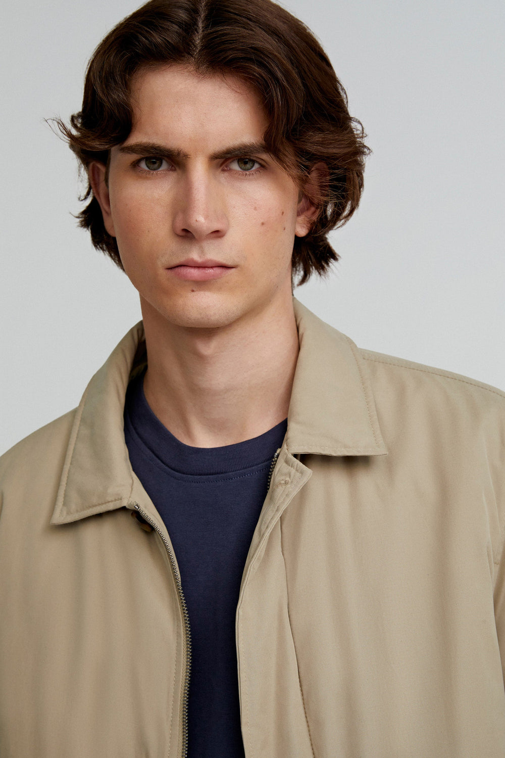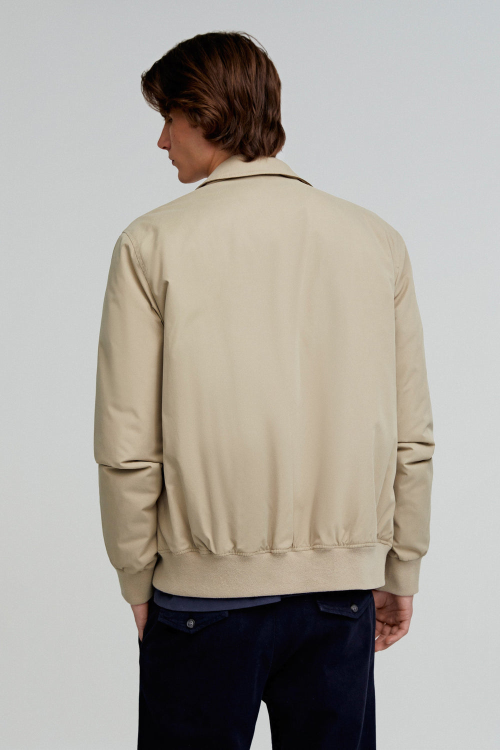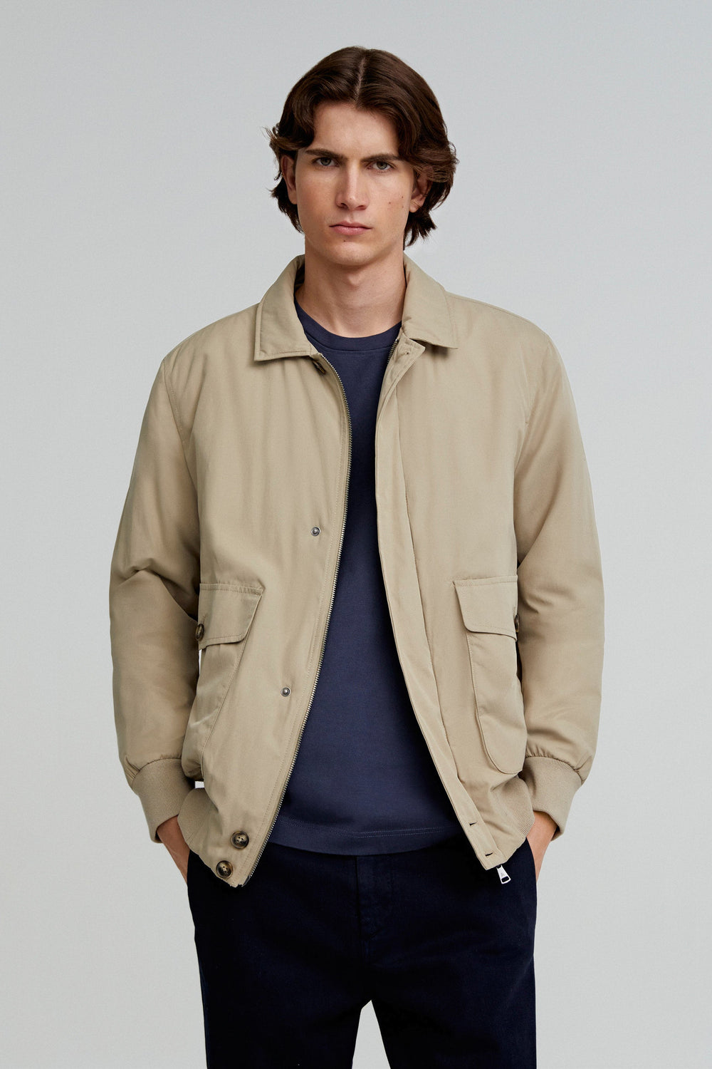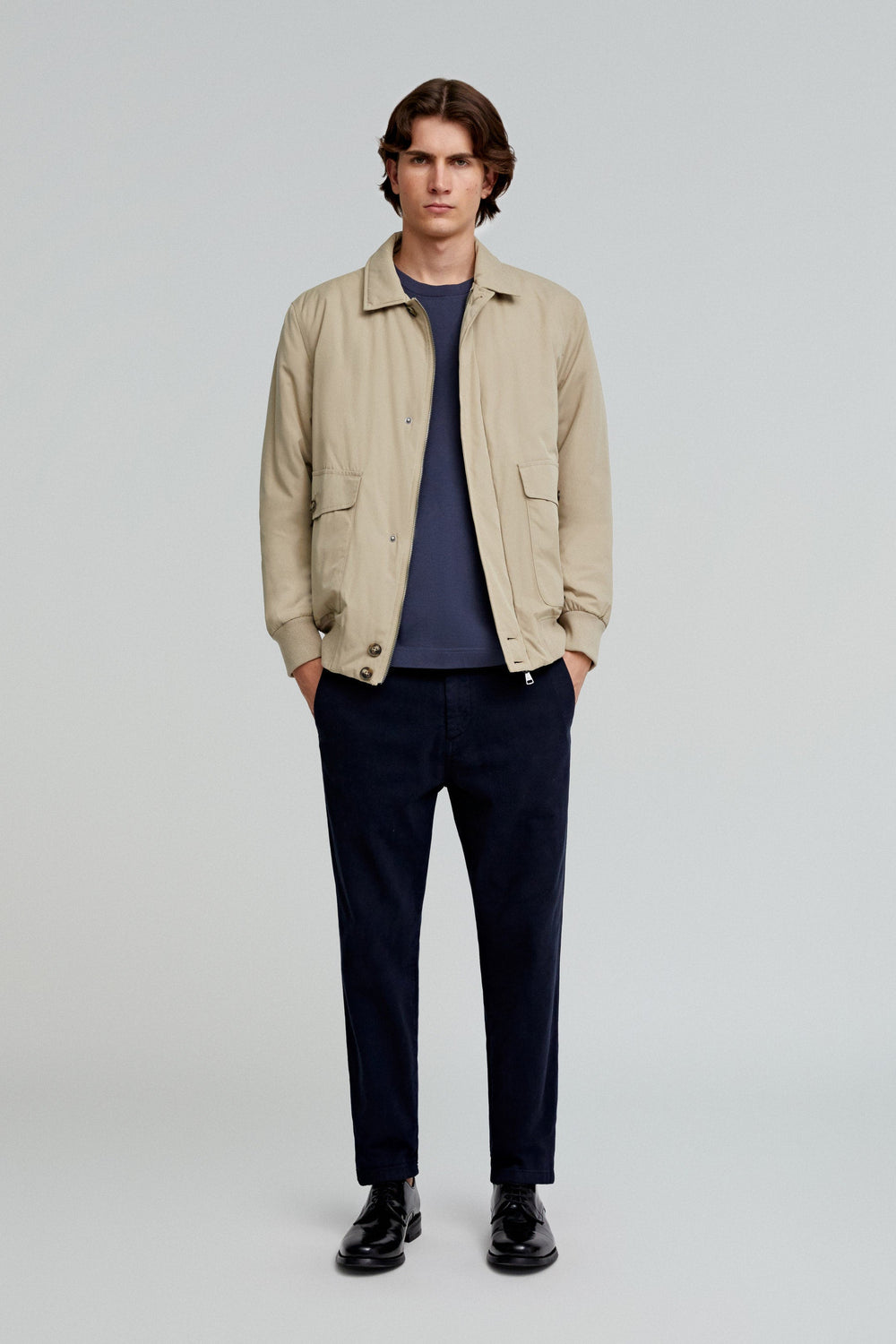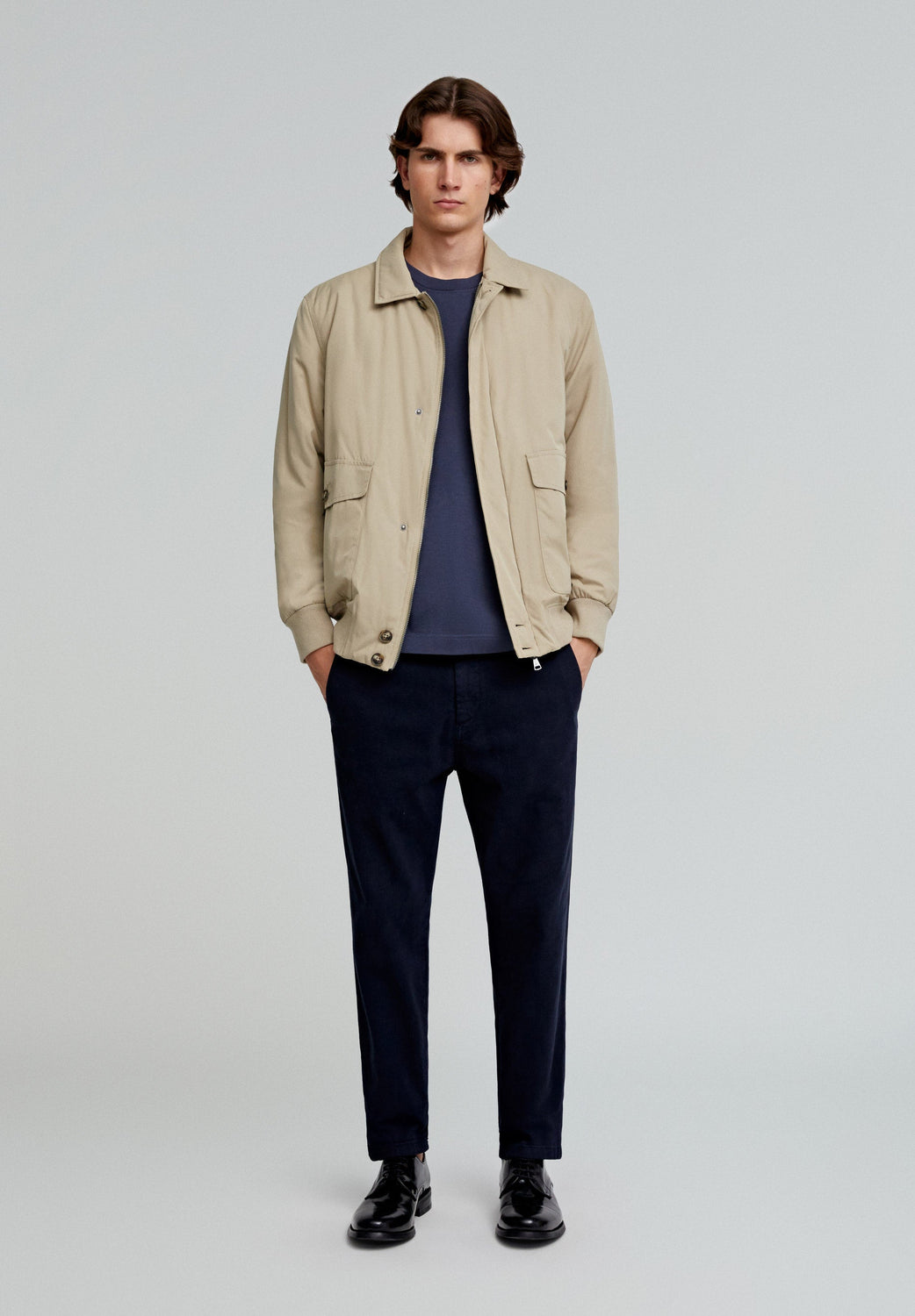 Casaco bomber confecionado em mistura de algodão, corte regular fit, colarinho clássico com fecho de correr duplo e botões. Manga comprida com debruns nos punhos. Bolsos com botões de pressão.