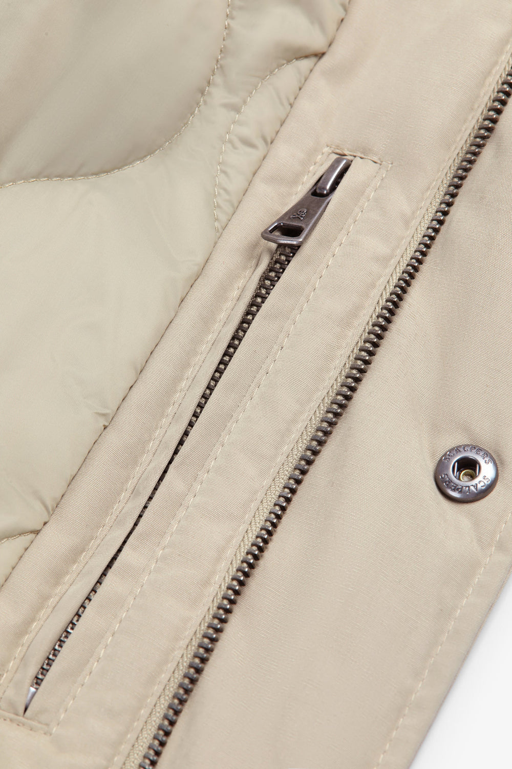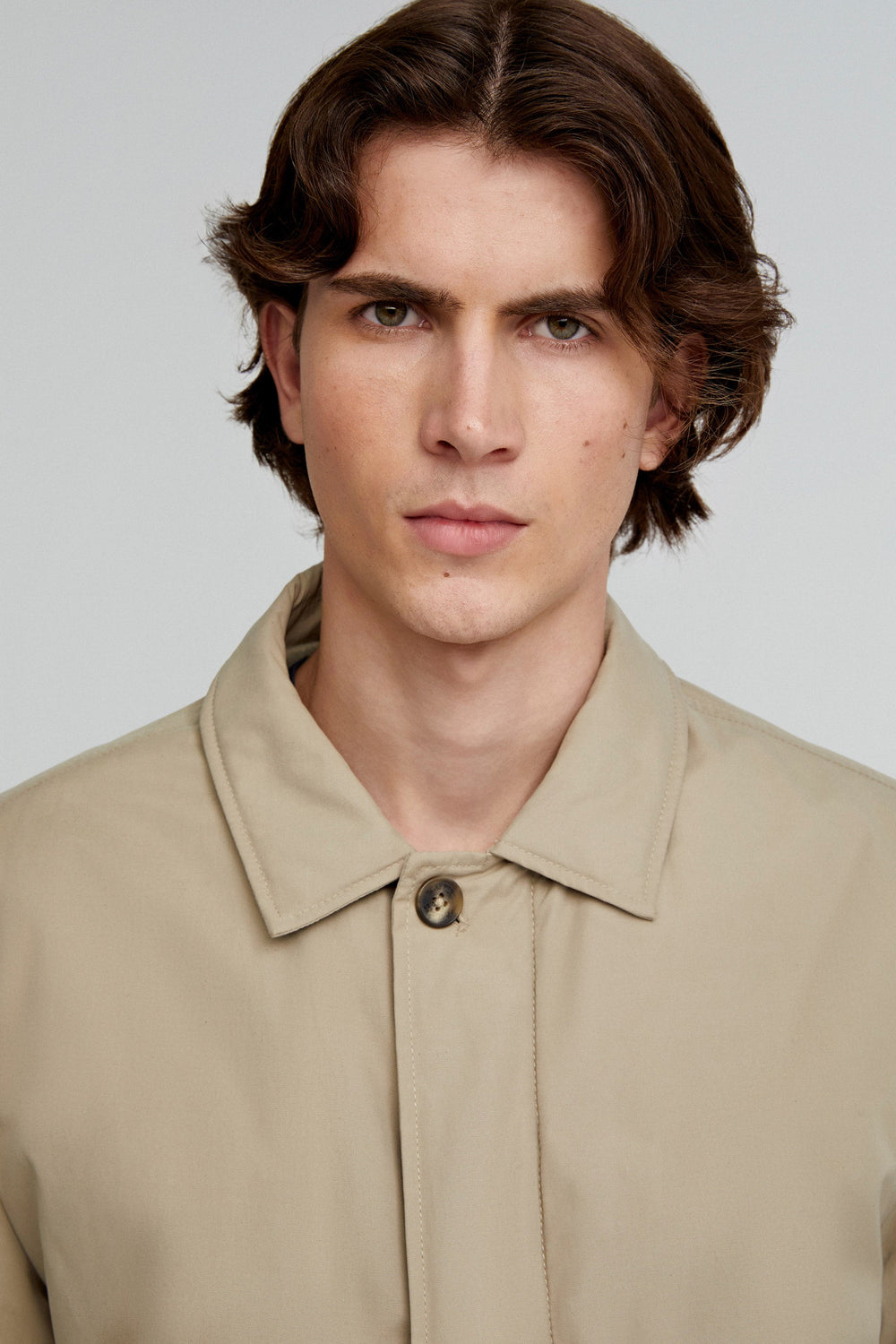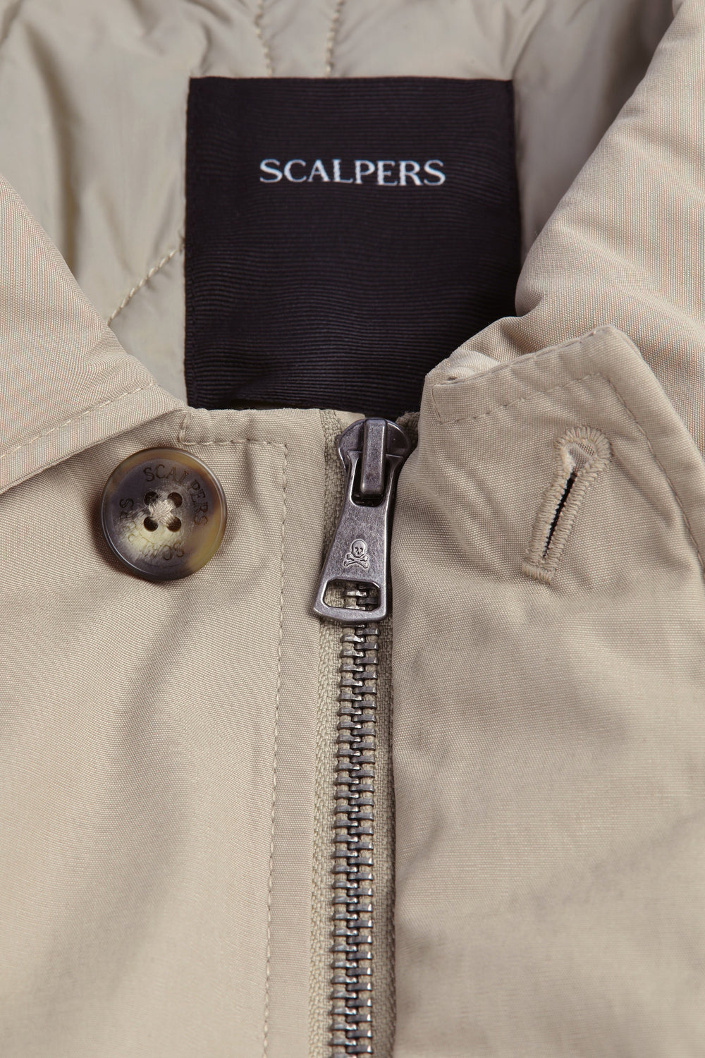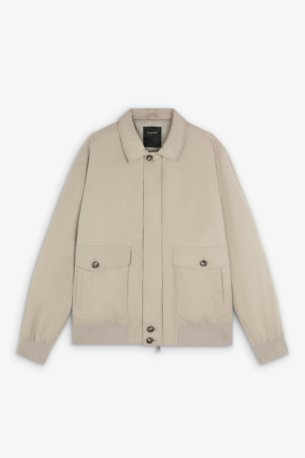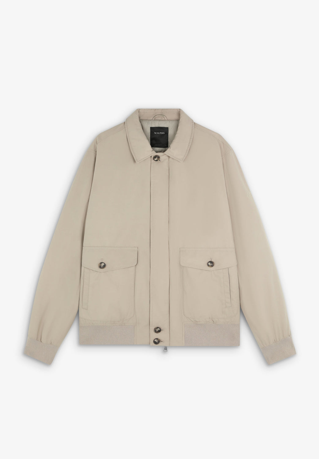 Casaco bomber confecionado em mistura de algodão, corte regular fit, colarinho clássico com fecho de correr duplo e botões. Manga comprida com debruns nos punhos. Bolsos com botões de pressão.