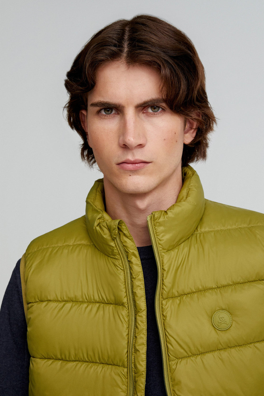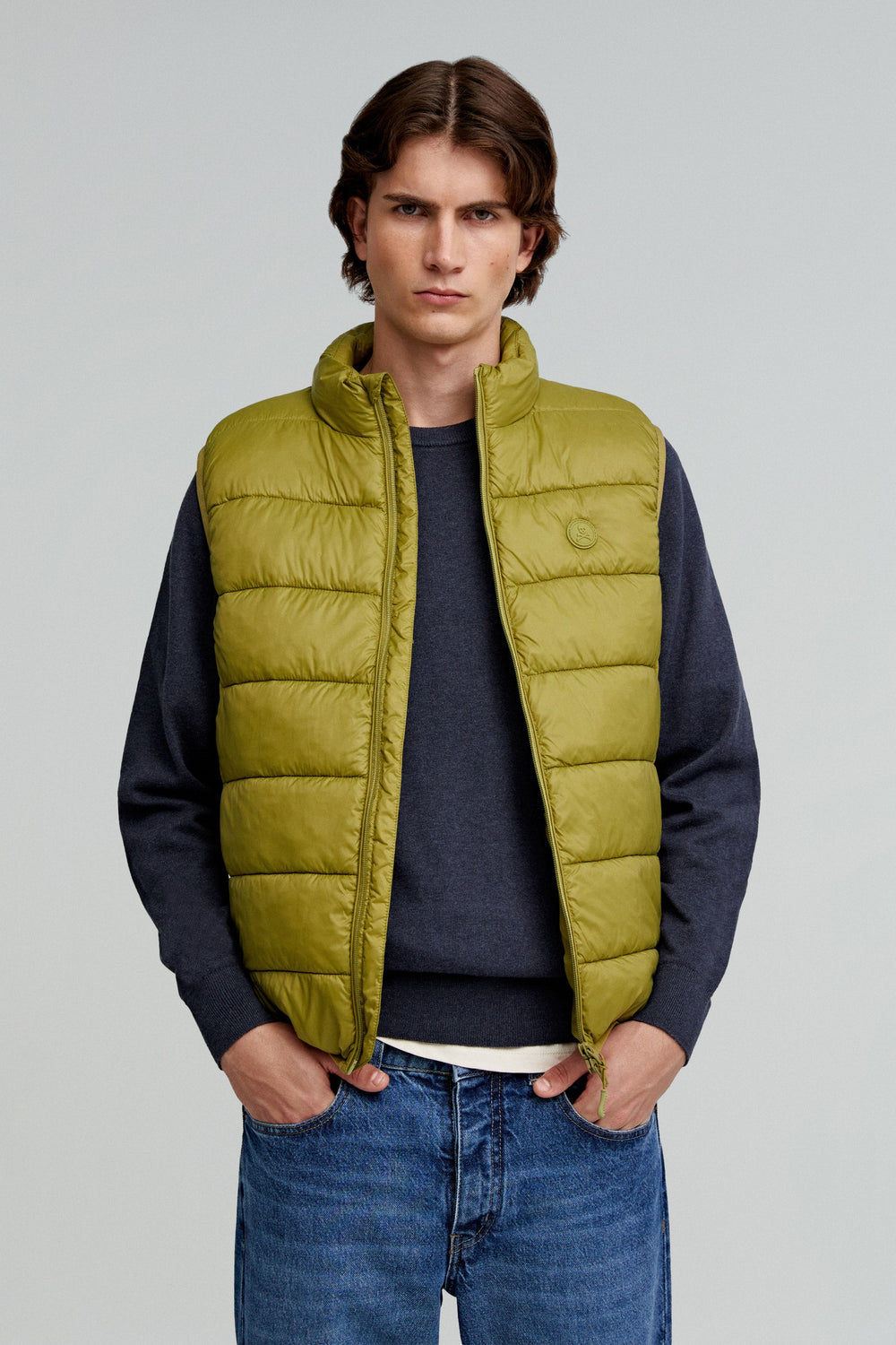 Colete acolchoado com logo efeito de caucho em tecido reciclado. Regular fit, gola subida e fecho com zip. Manga cava e bolsos com zip. Bolso interior.