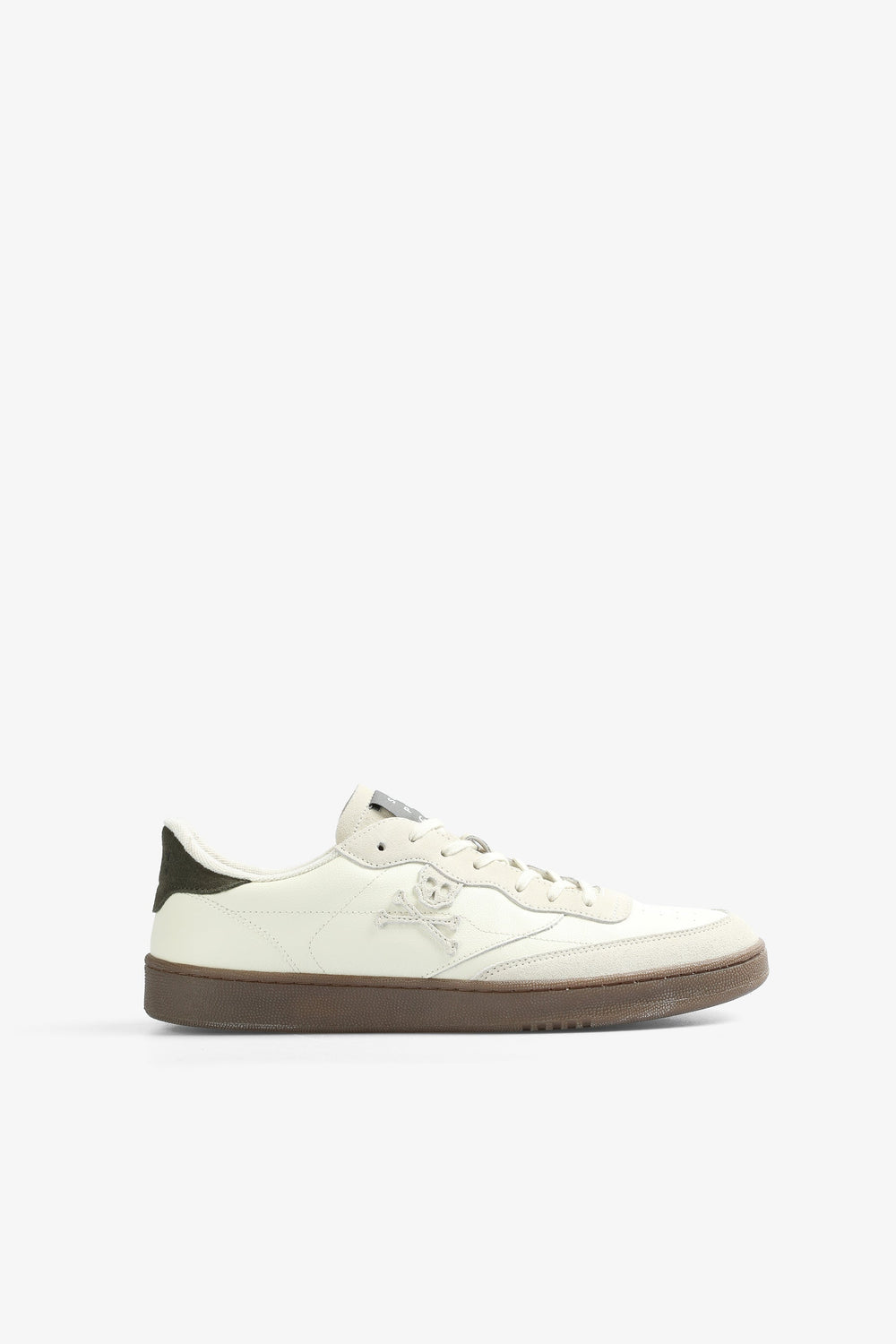 Sapatilhas com skull lateral em contraste confecionadas em pele. Fecho com atacadores manchados, sola de TPR, detalhe em contraste no calcanhar e detalhe de etiqueta na língua personalizada.