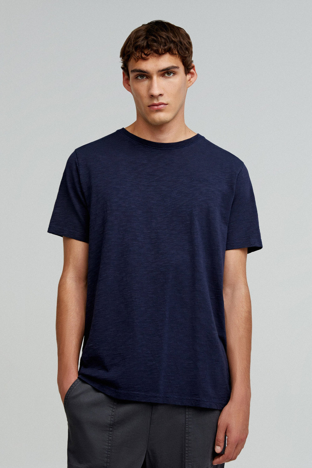 T-shirt em tecido flamé em 100% algodão BCI. Regular fit, decote redondo e manga curta. Logótipo bordado no tom.