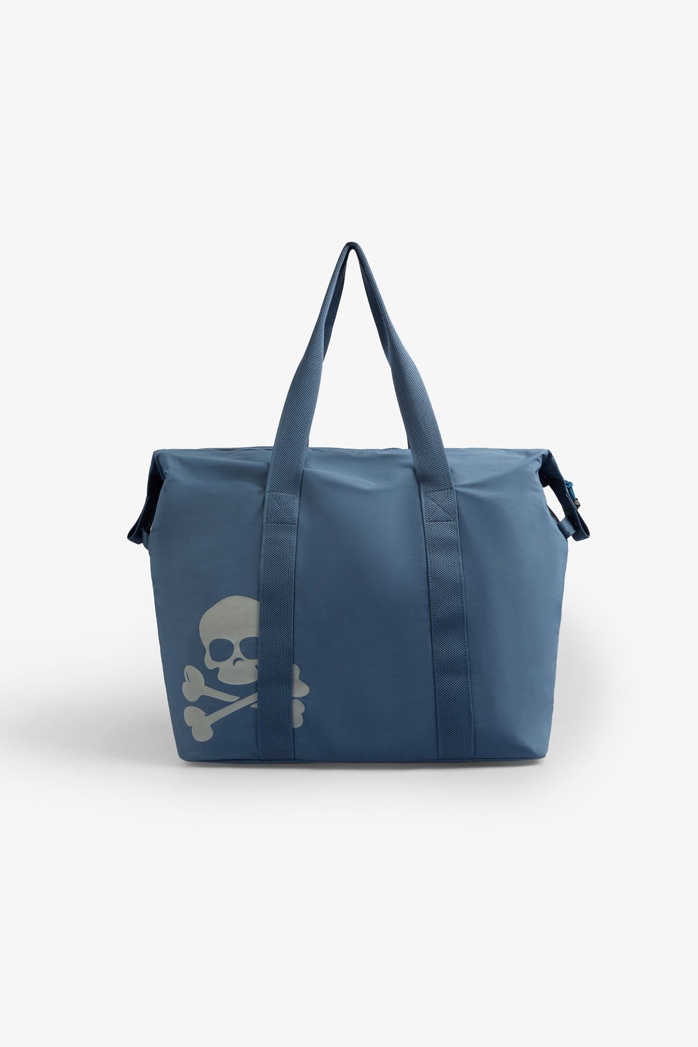 Bolsa de viagem. Confecionada com materiais reciclados. Fecho de correr. Ajustadores laterais. Alças superiores. Múltiplos bolsos interiores. Pormenor de remendo em efeito de caucho frontal com logo