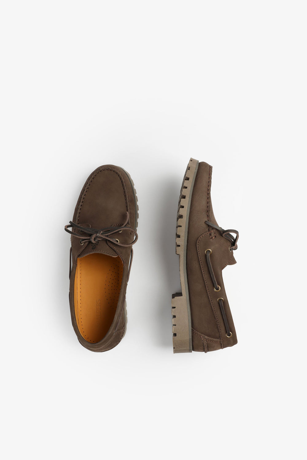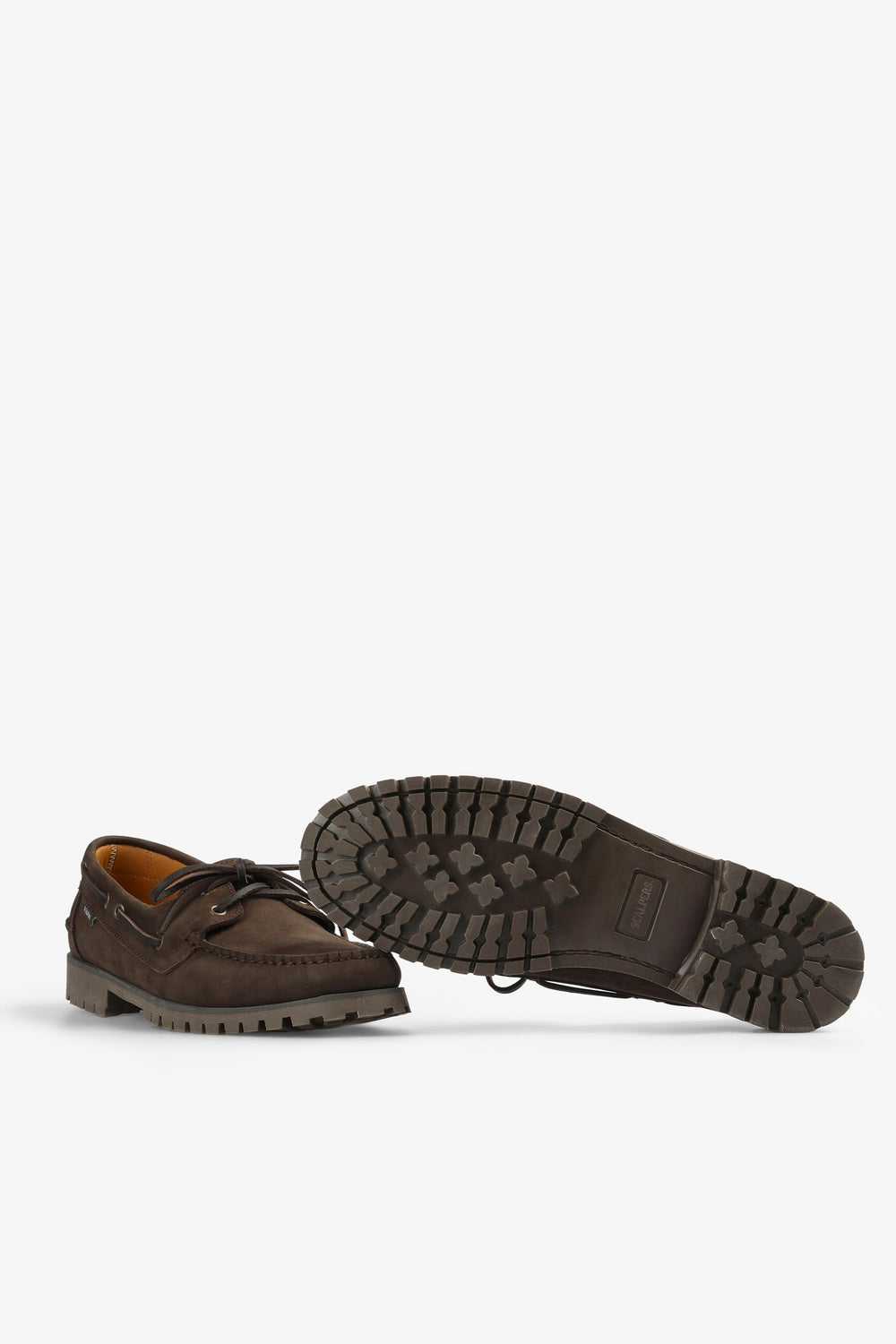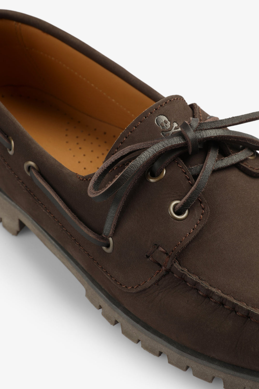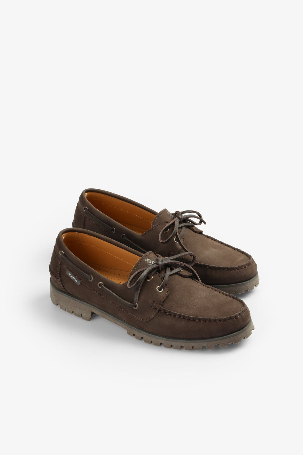 Sapatos tipo vela confecionados em 100% pele. Fecho com cordões, sola dentada pronunciada. Etiqueta lateral.
