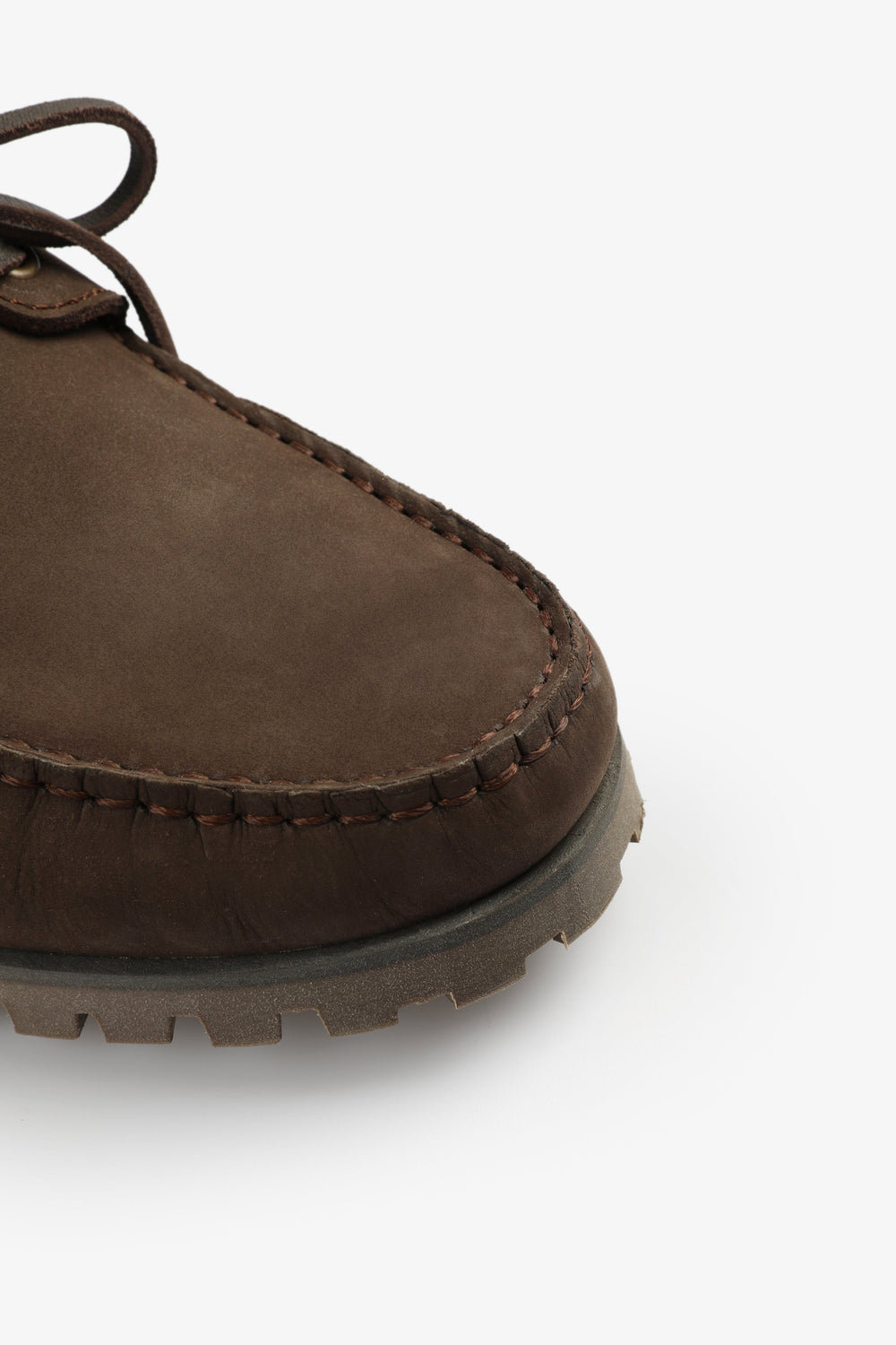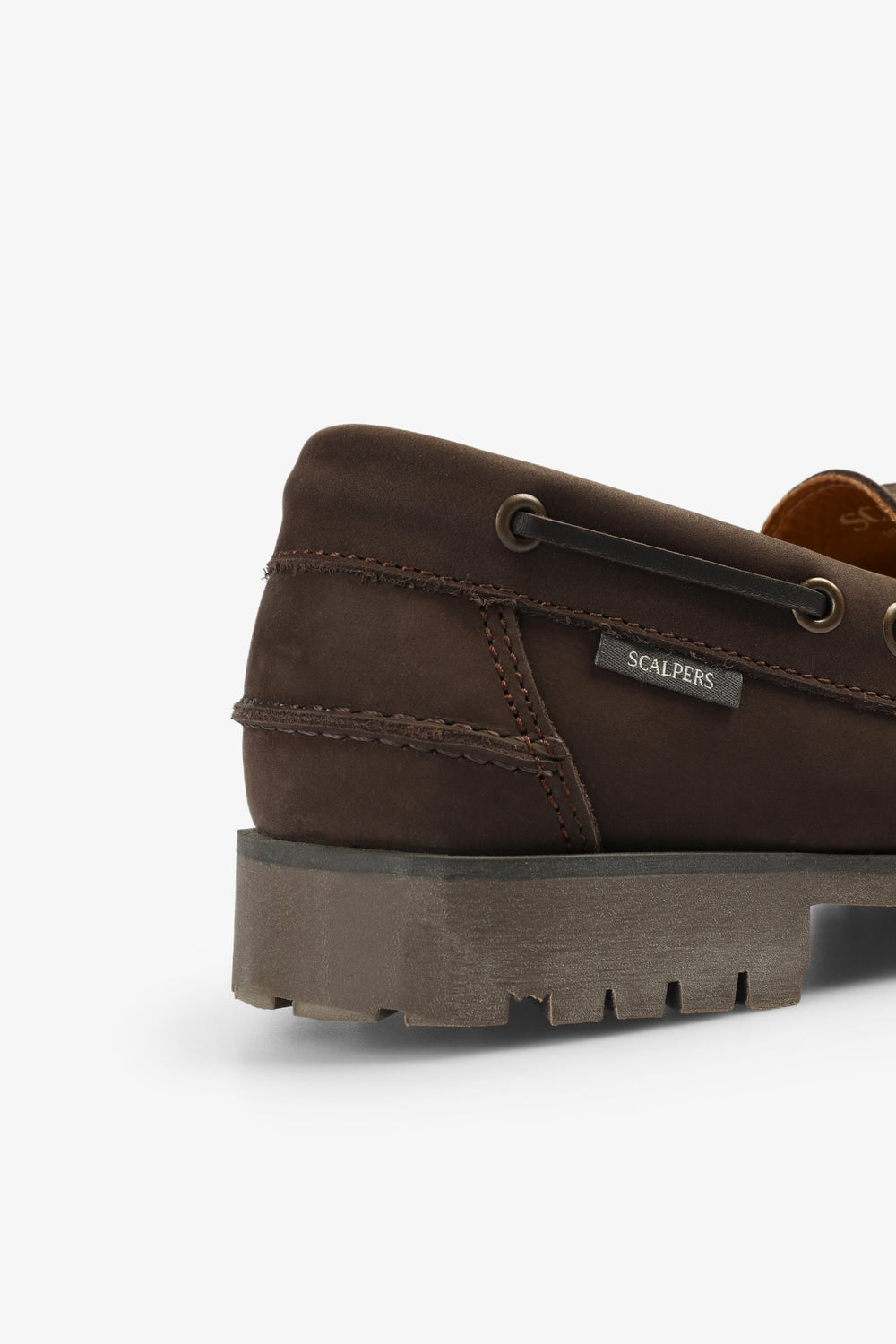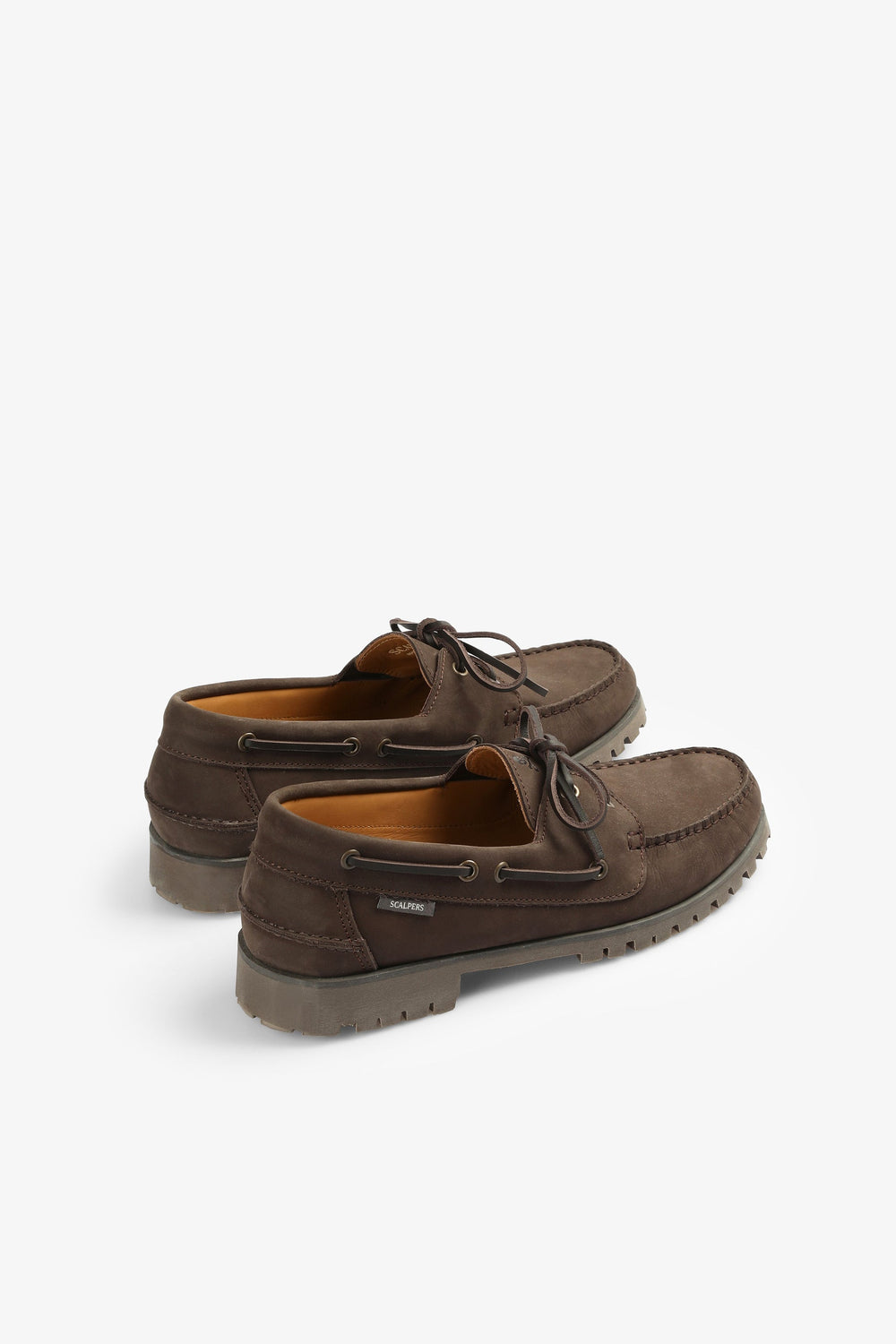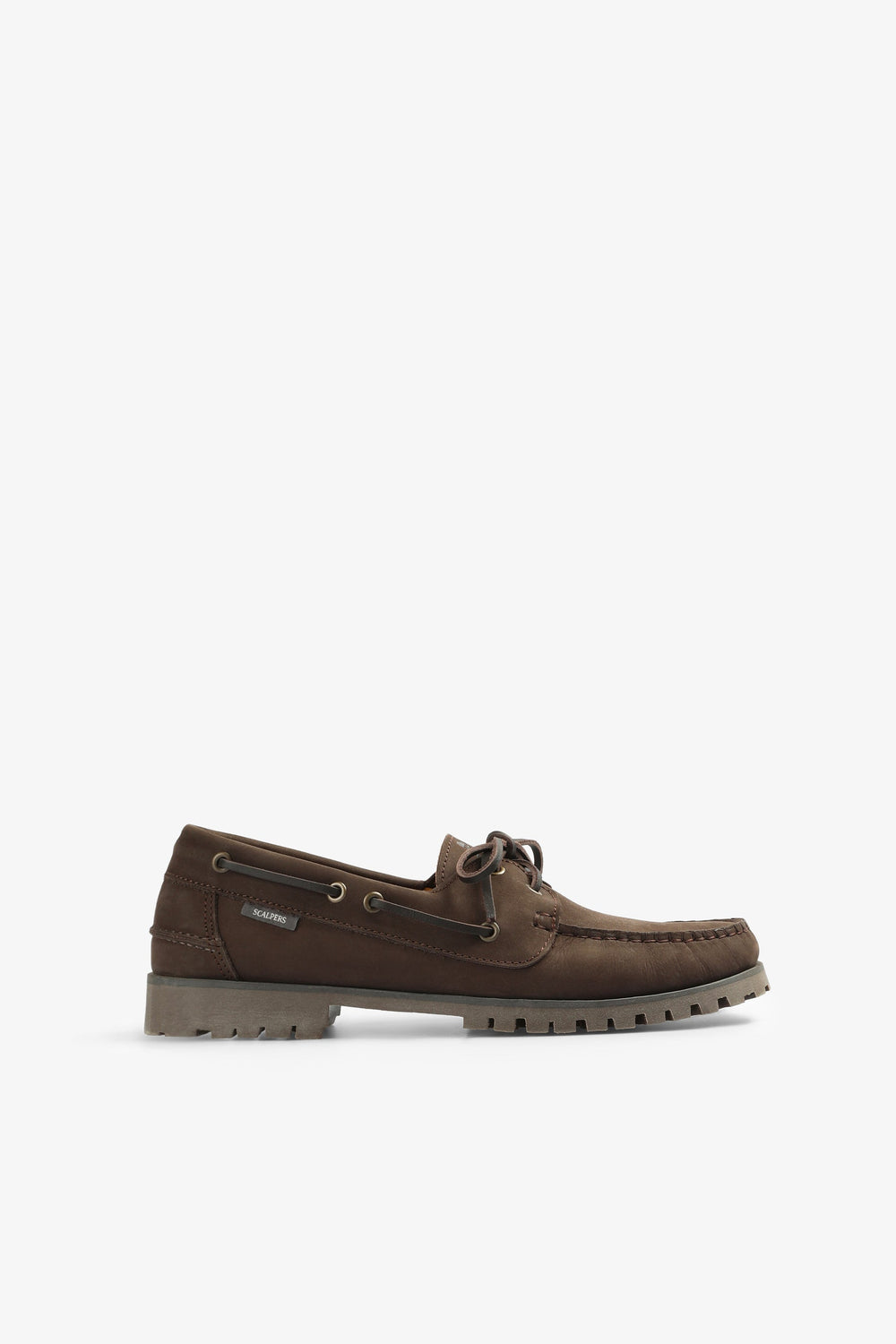 Sapatos tipo vela confecionados em 100% pele. Fecho com cordões, sola dentada pronunciada. Etiqueta lateral.