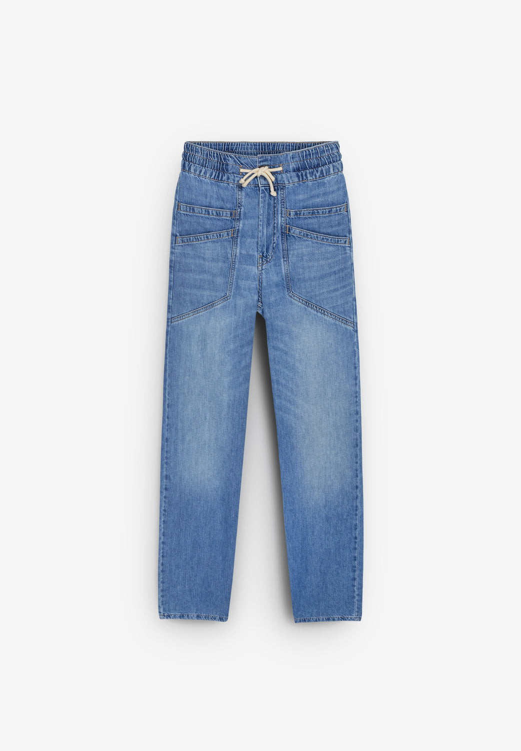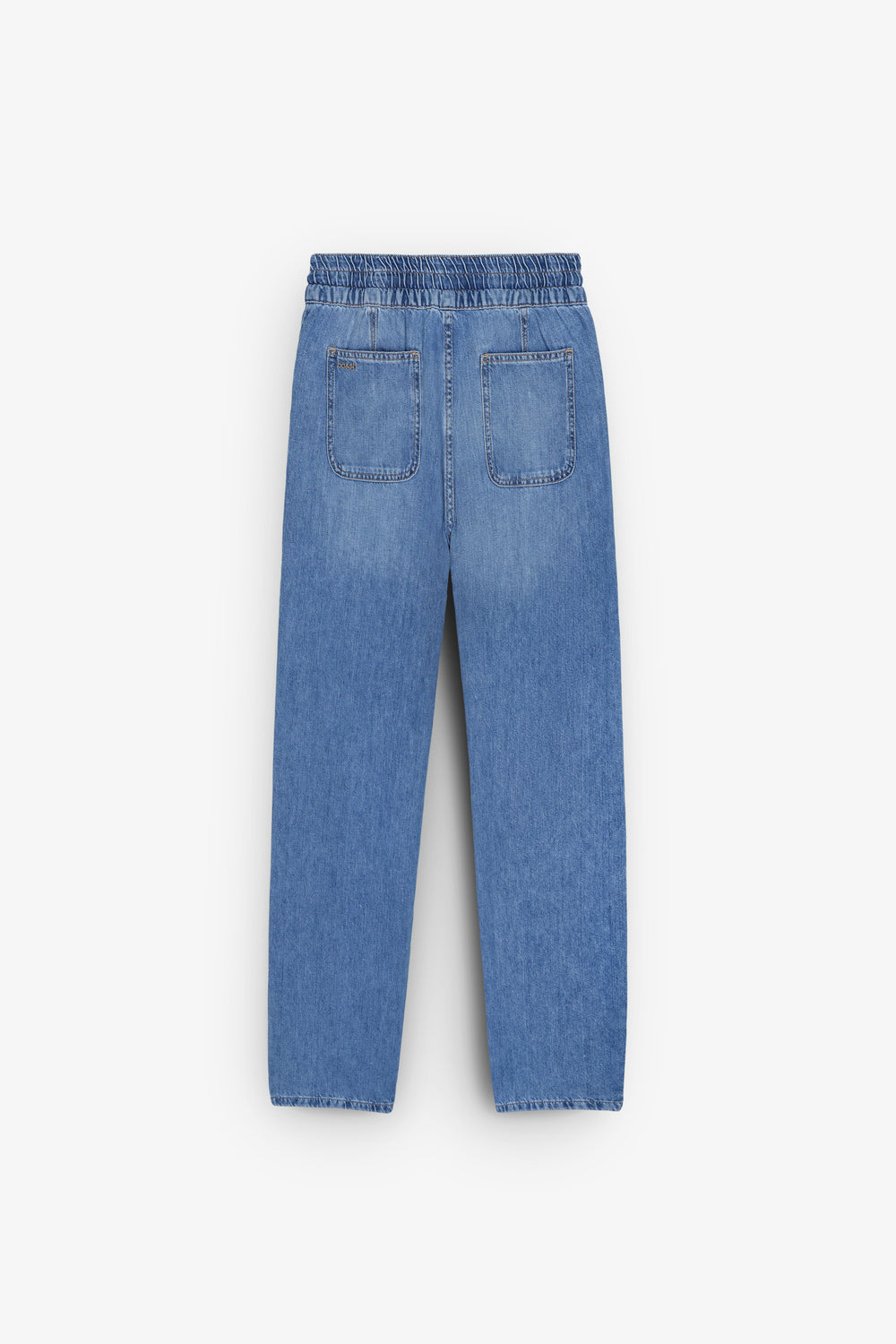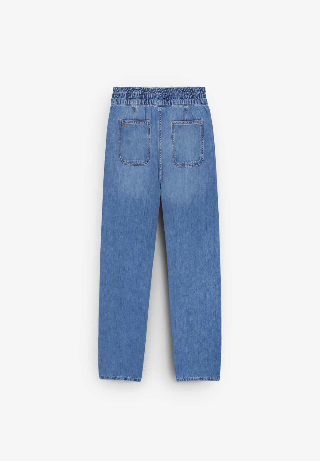 - Corte folgado e cintura subida.