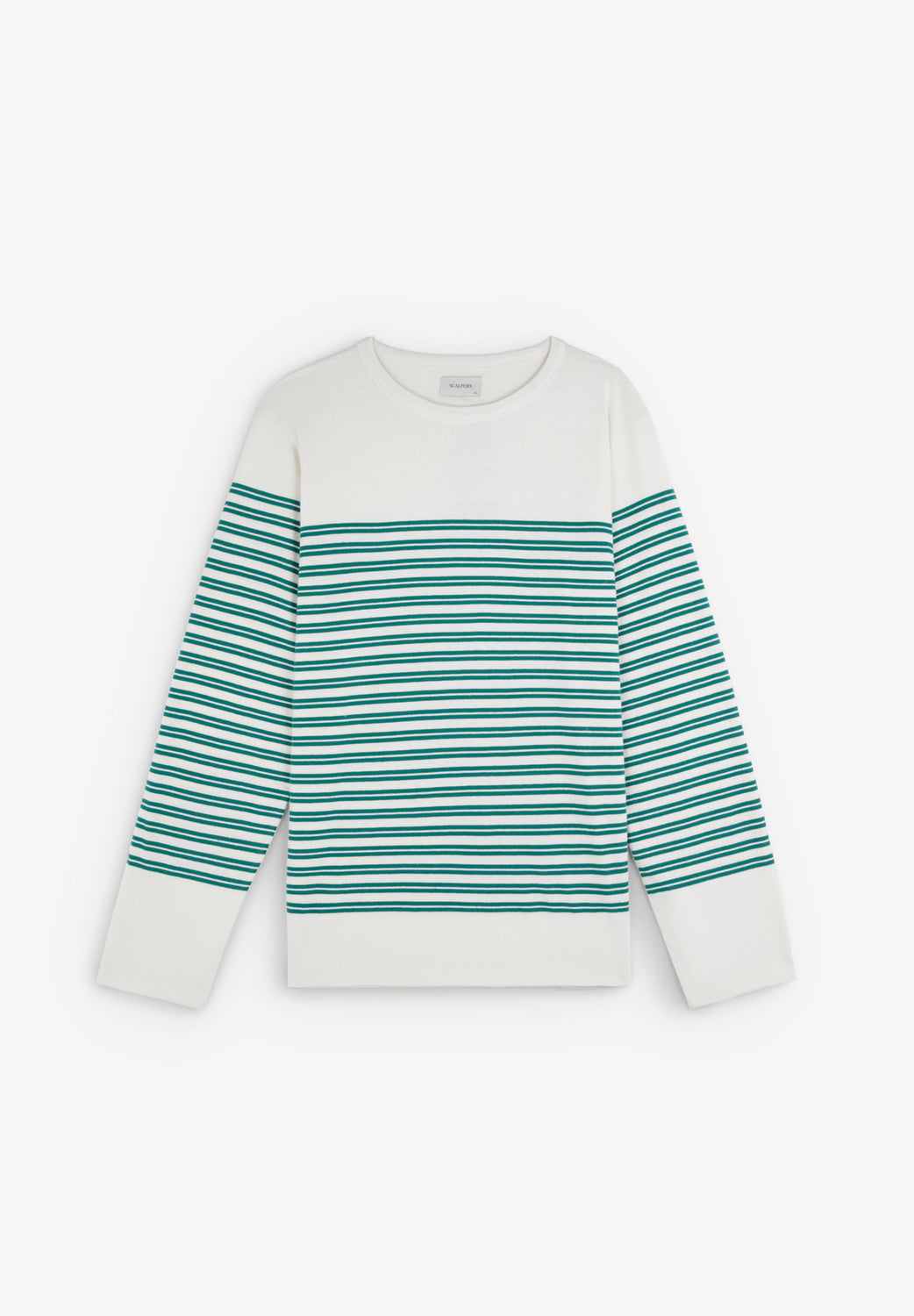 T-shirt às riscas confecionada em 100% algodão BCI. Regular fit, decote redondo e manga comprida.