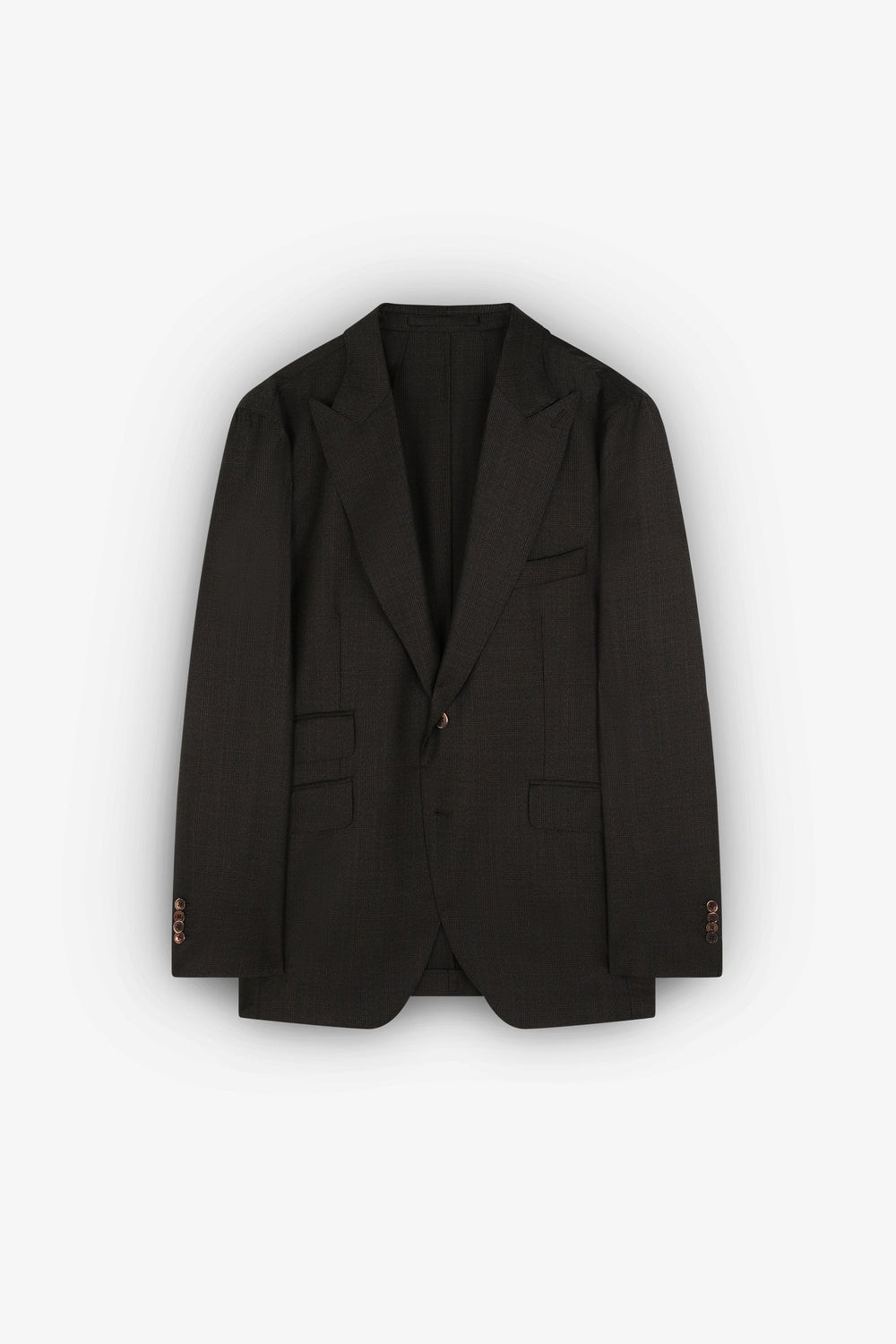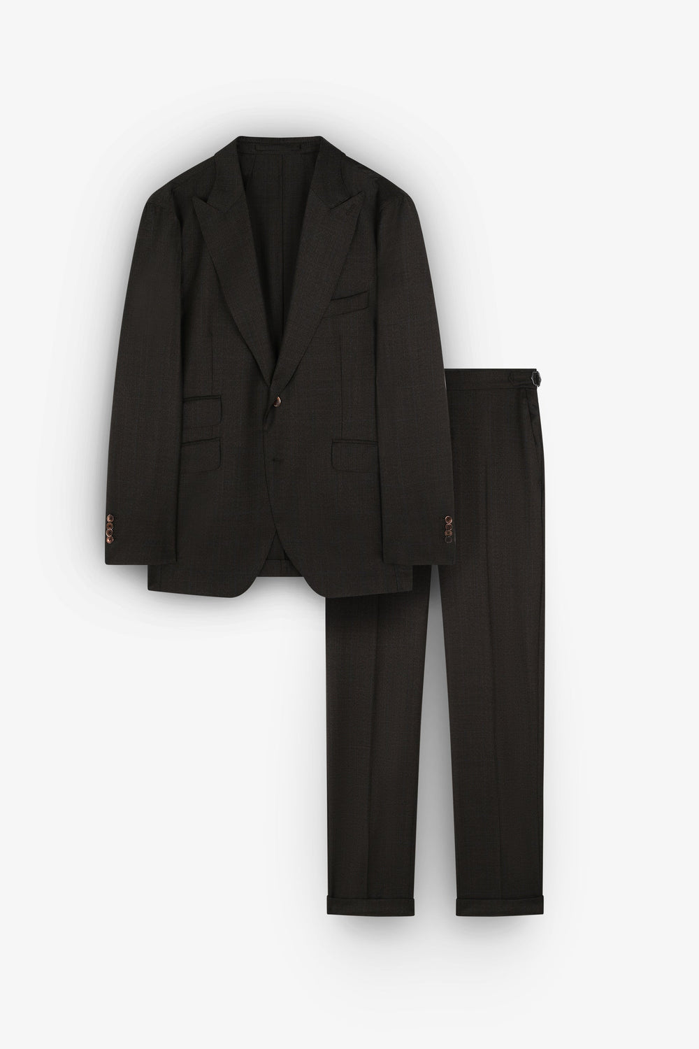 Traje marrón confeccionado en 100% lana. Regular fit. Americana sin armar con forro, cuello con solapas punta de lanza y cierre con botones. Manga larga terminada en botones practicables y uno cerrado y bolsillos de vivo. Pantalón recto con cierre con botón prologando en cinturilla y botones. Ceñidores laterales y botón para tirantes. Bajo con vuelta