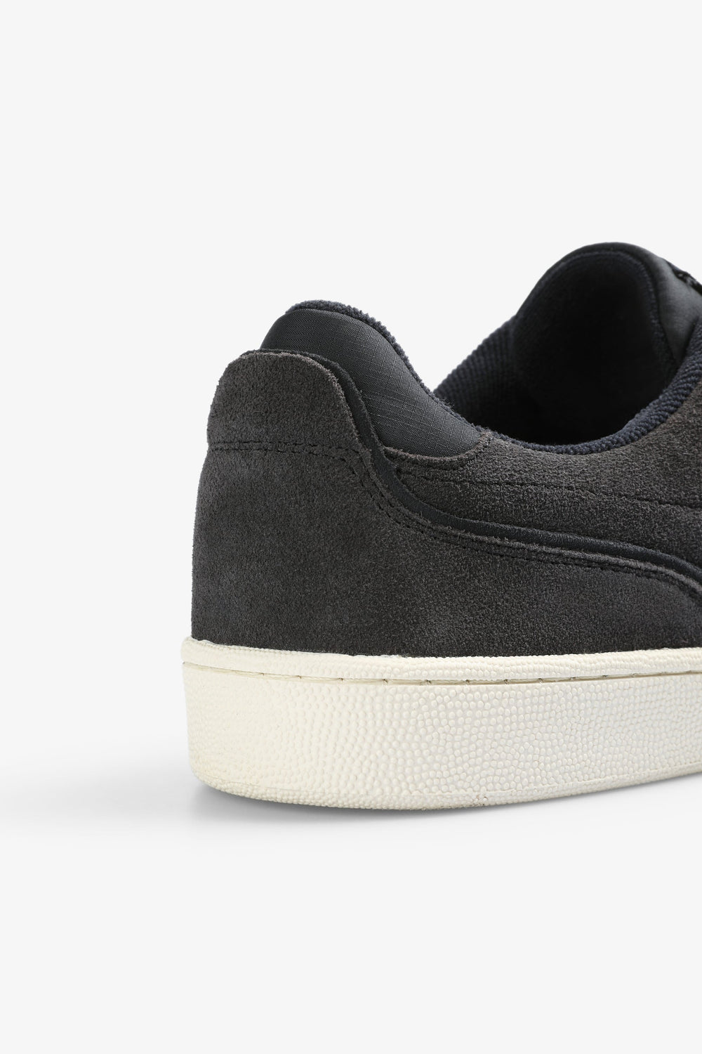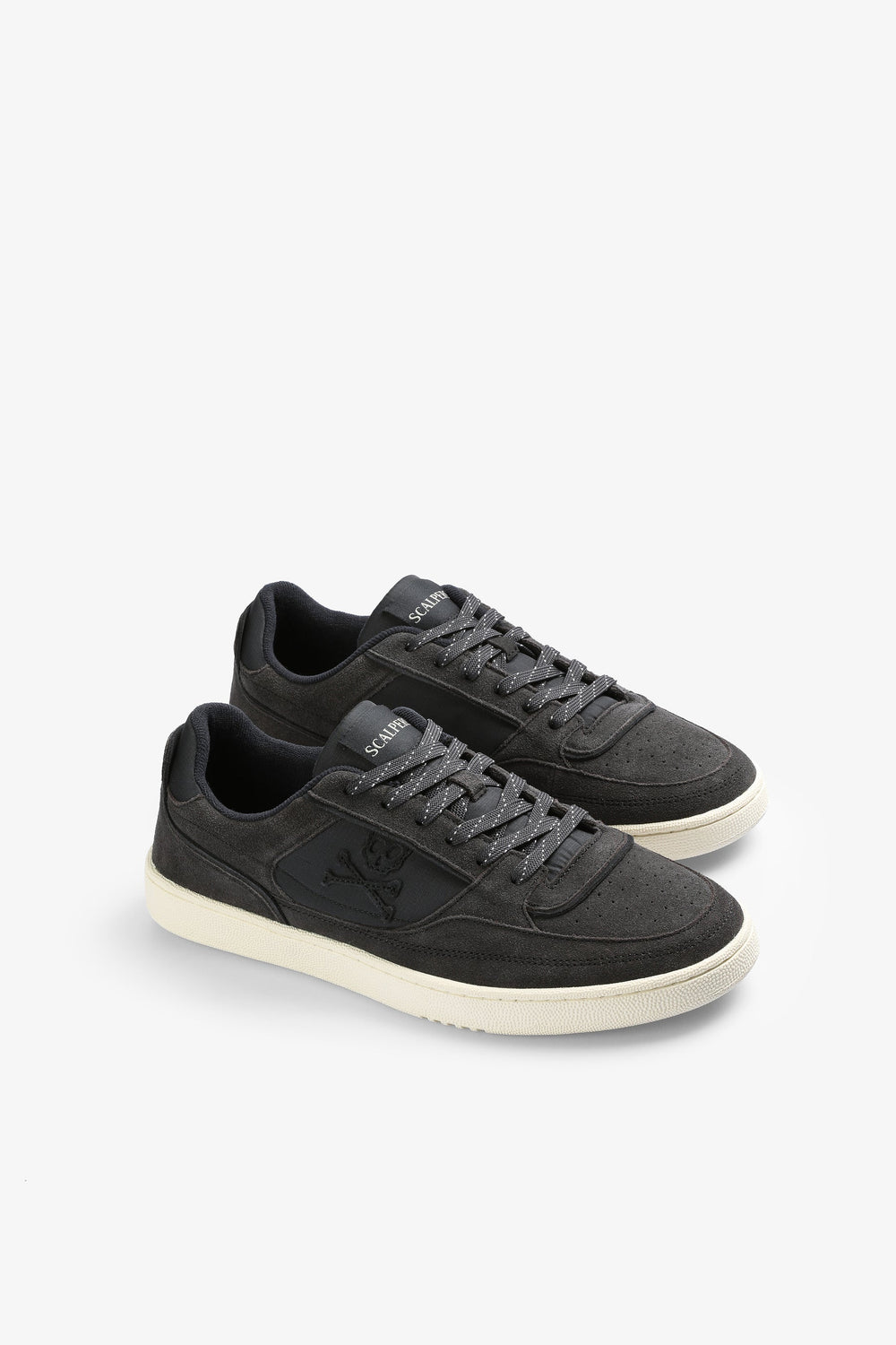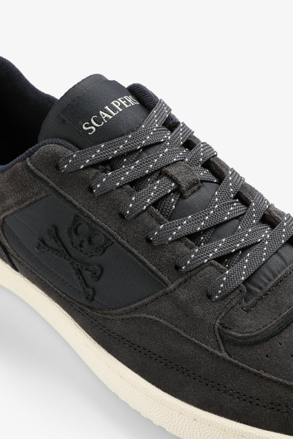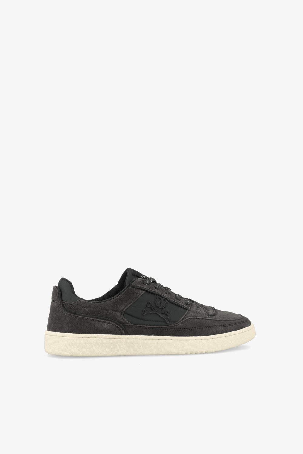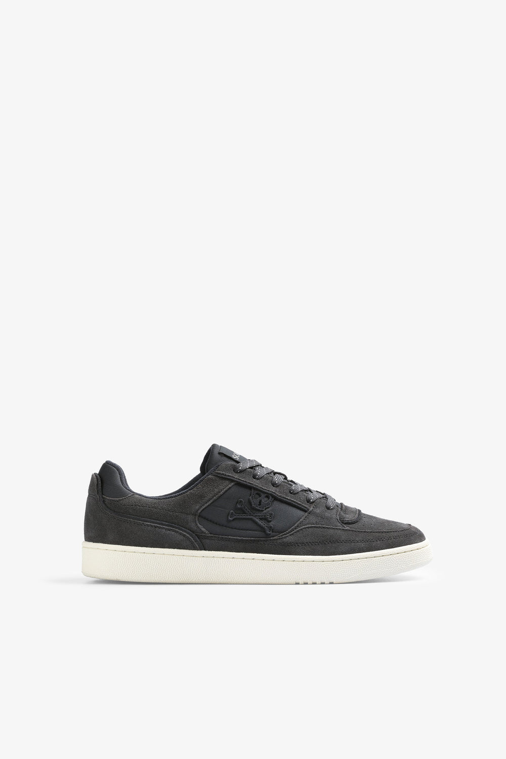 Sapatilhas confecionadas em pele terminada em croute. Fecho com cordões no tom, sola de borracha em contraste e remendo de skull lateral.