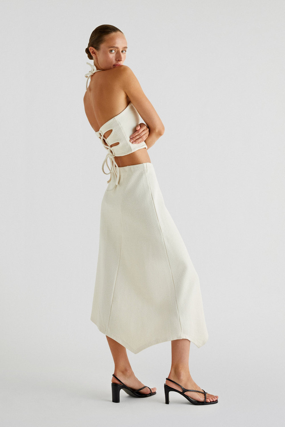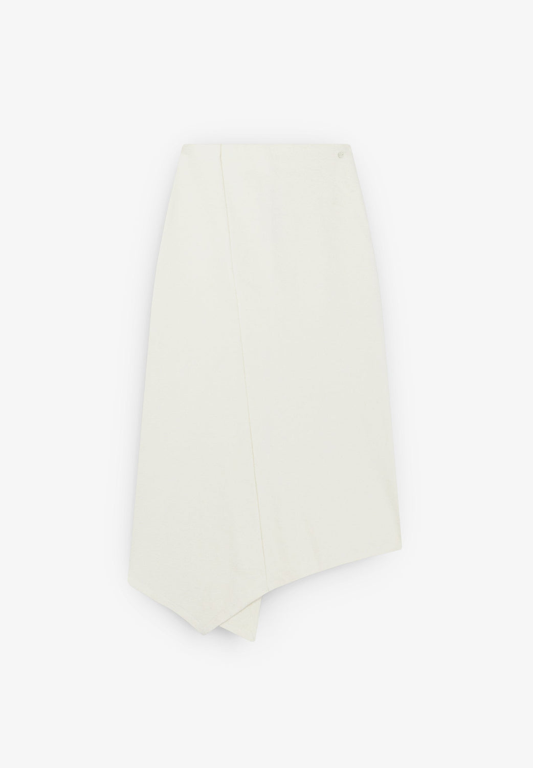 Saia midi de malha volumosa confecionada em 100% algodão. Regular fit, cós elástico e costuras marcadas. Bainha assimétrica.