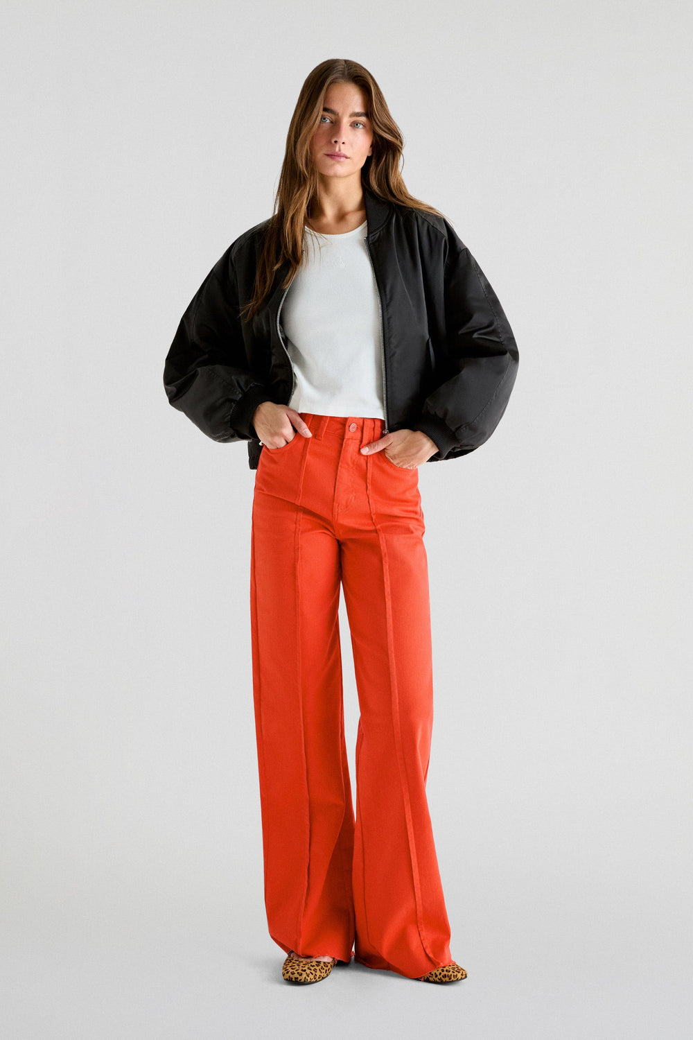 Jeans com costura marcada confecionadas em tecido de algodão ligeiramente elástico. Corte full length slim, fecho com botão e zip. Bolsos à frente e atrás.